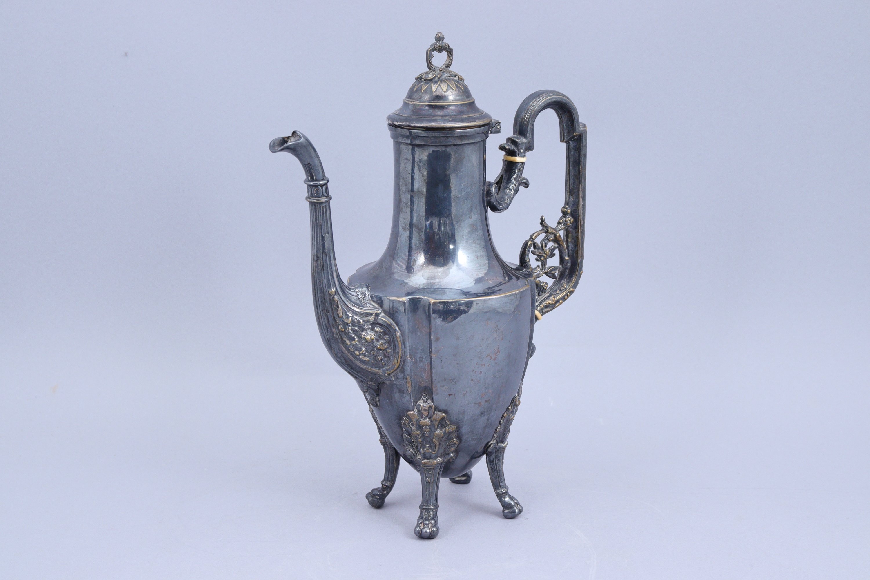 Jointe: grande théière en métal argenté à riche décor feuillagé, l'anse ornée de rinceaux. Piétement quadripode en pattes de lion. Haut. 32 cm.
