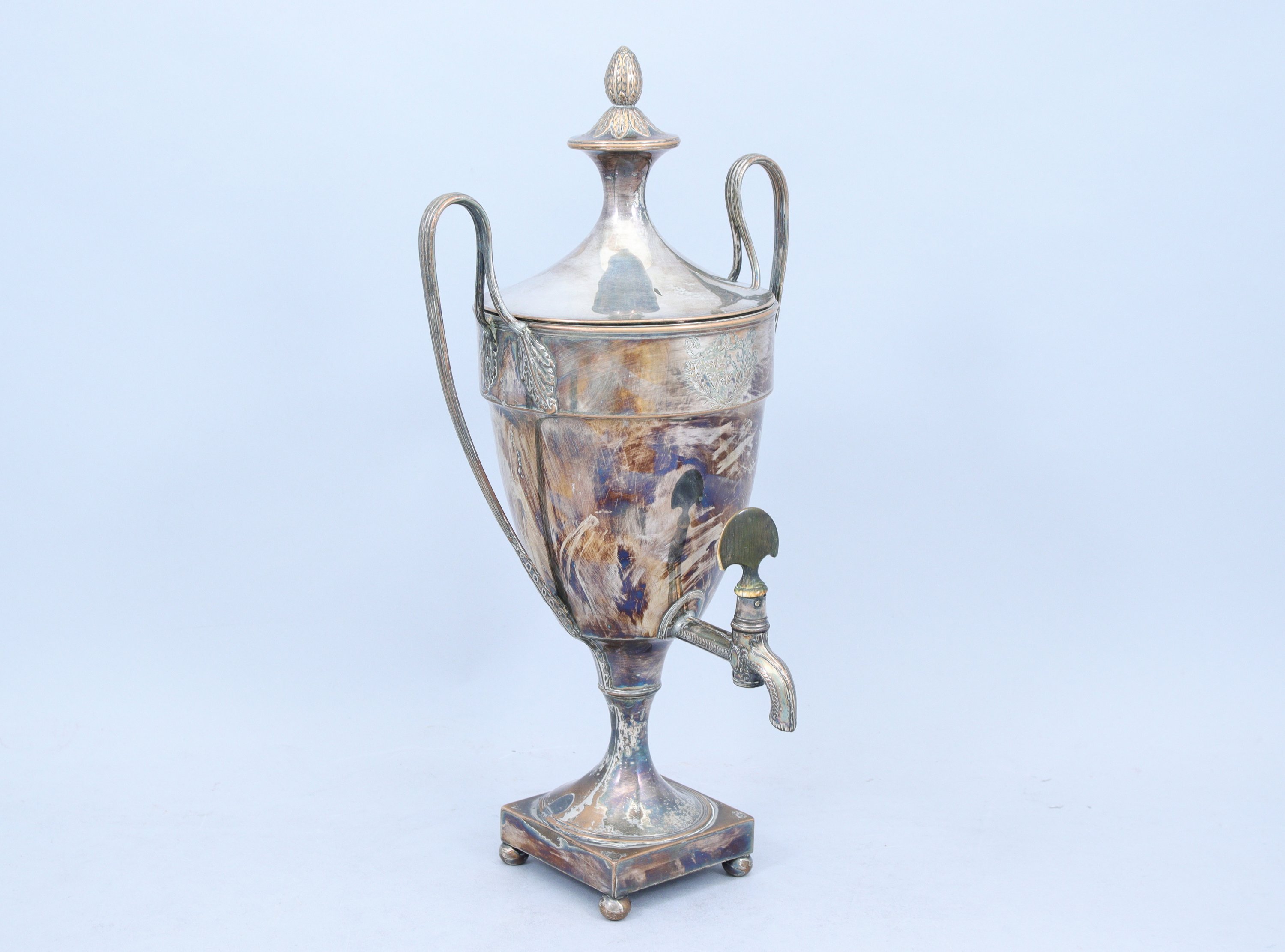 en métal argenté. Le couvercle coiffé d'une pomme de pin sur une terrasse de feuilles et entouré de deux anses moulurées terminées par des feuilles d'acanthe. Le col présente des armoiries d'alliance. Le bec à décor de médaillons entourés de guirlandes feuillagées est surmonté d'un bouton en corne. Il repose sur un piédouche terminé par une base carrée. Quatre pieds boules.