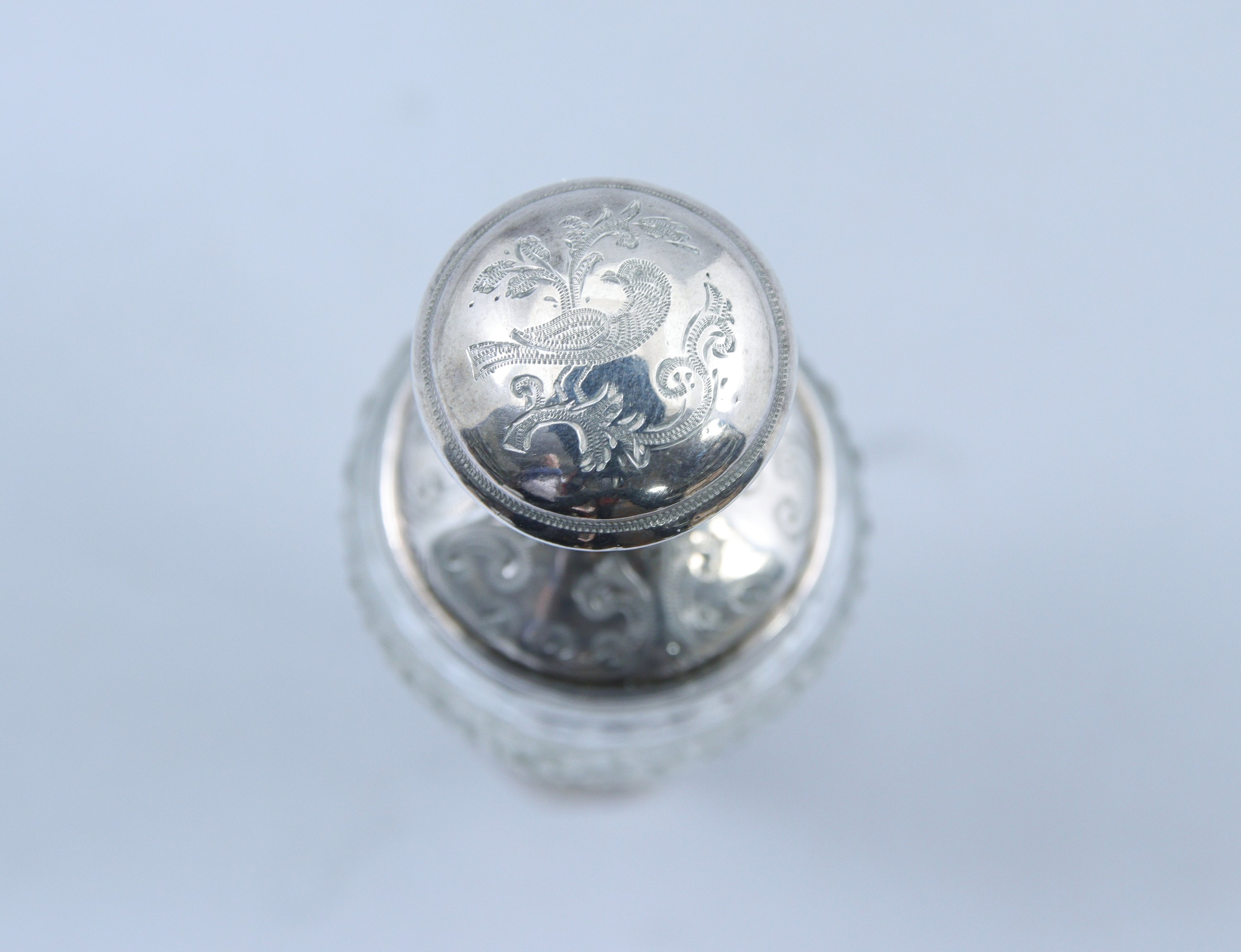 en cristal taillé, à pointes de diamants et pans coupés. La monture en argent à bouchon gravé d'un oiseau sur une branche, l'épaule ornée de rinceaux. Le pied octogonal à motif de filets.