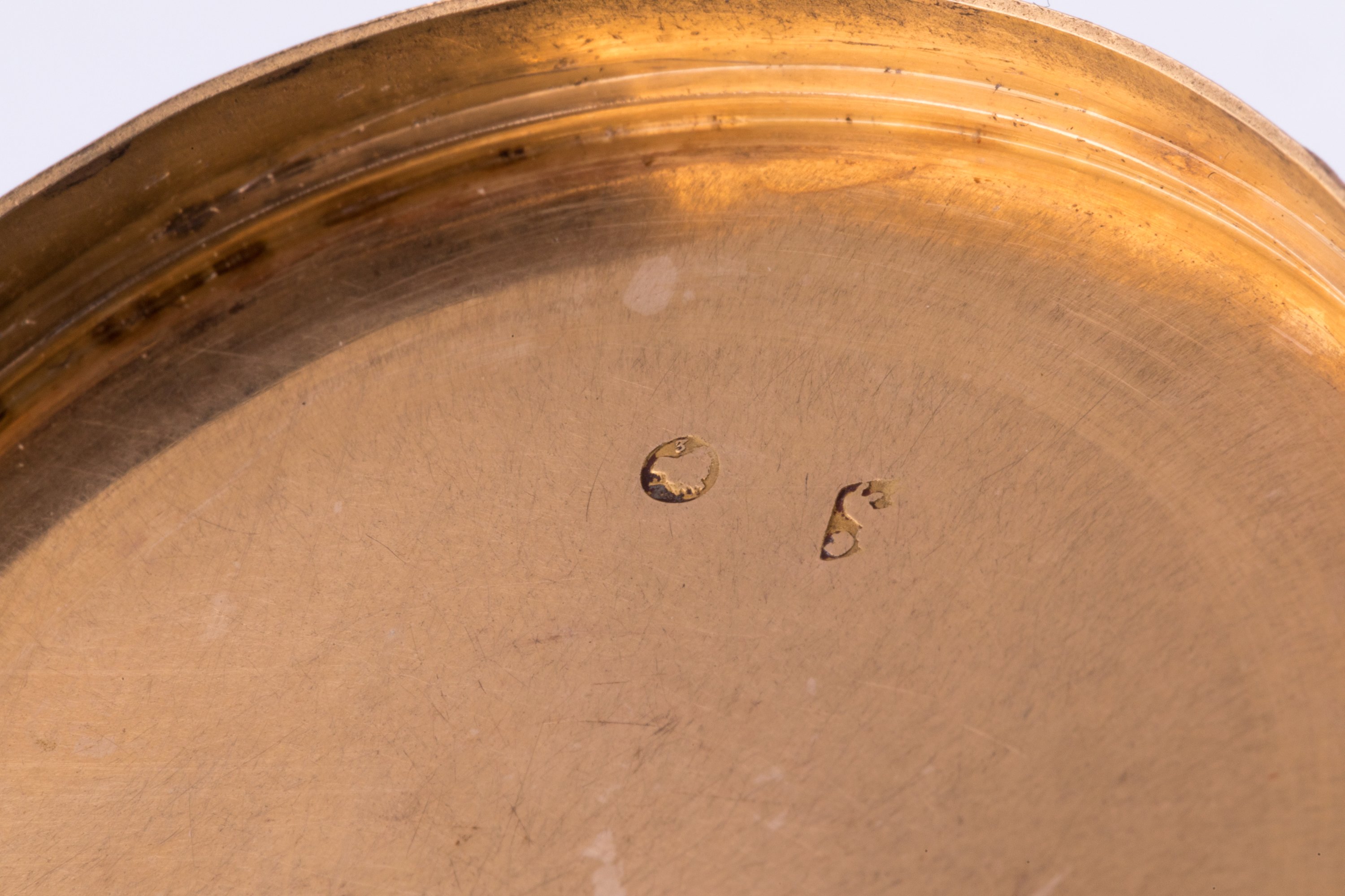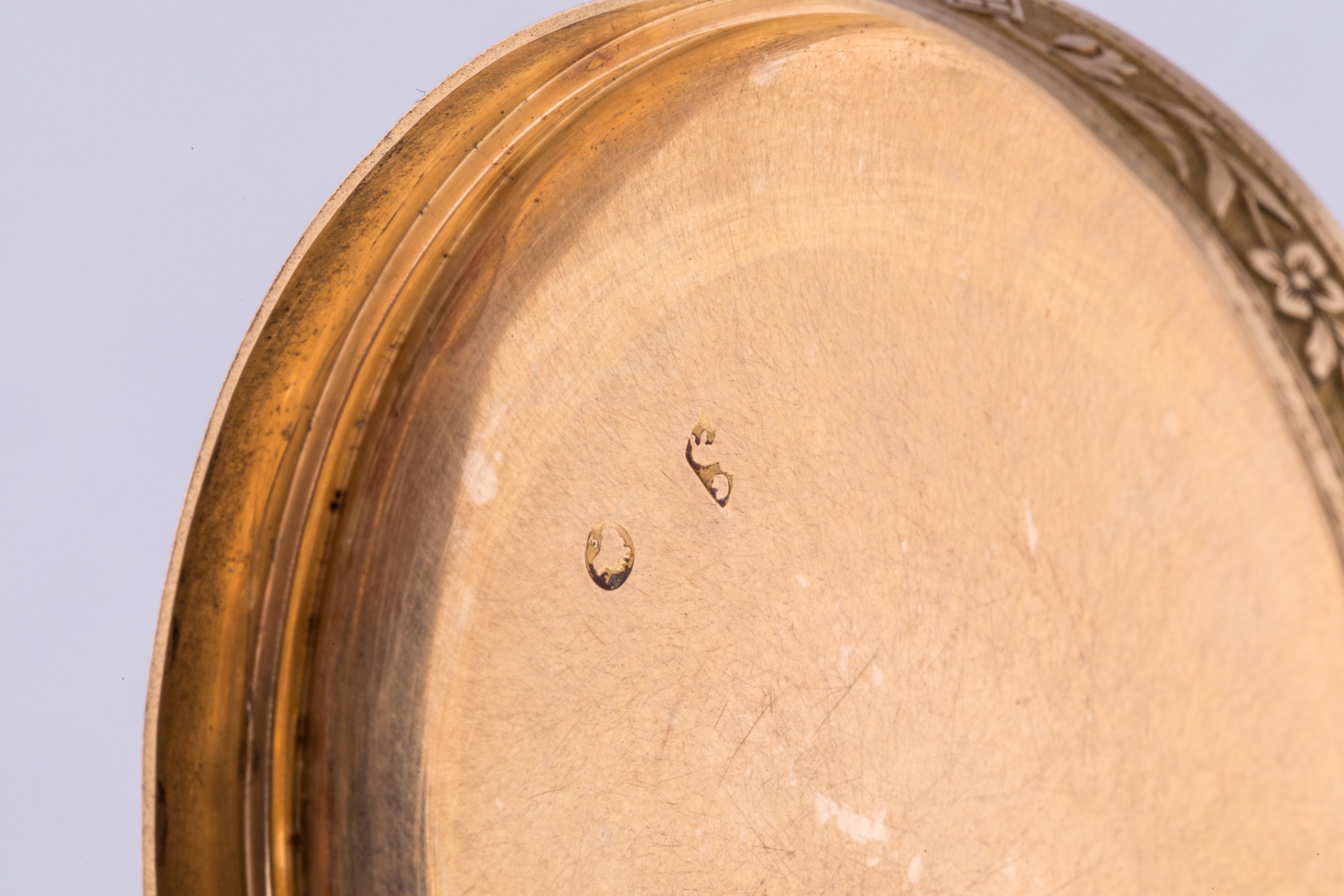 en or jaune 750 millièmes gravée et guillochée, ornée d'un frise de feuilles d'acanthe et pommes de pin entourant un décor de cubes sans fond.