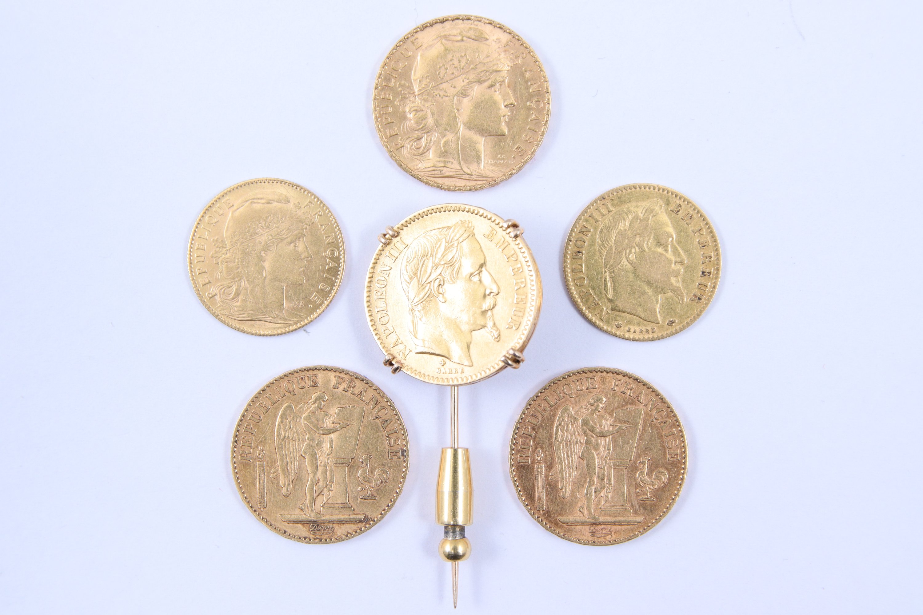 - 4 x 20 FRANCS. 1 x Napoléon III tête laurée (1866, montée: 9,3 g.), 2 x Génie (1875-1895), 1 x Marianne (1907).