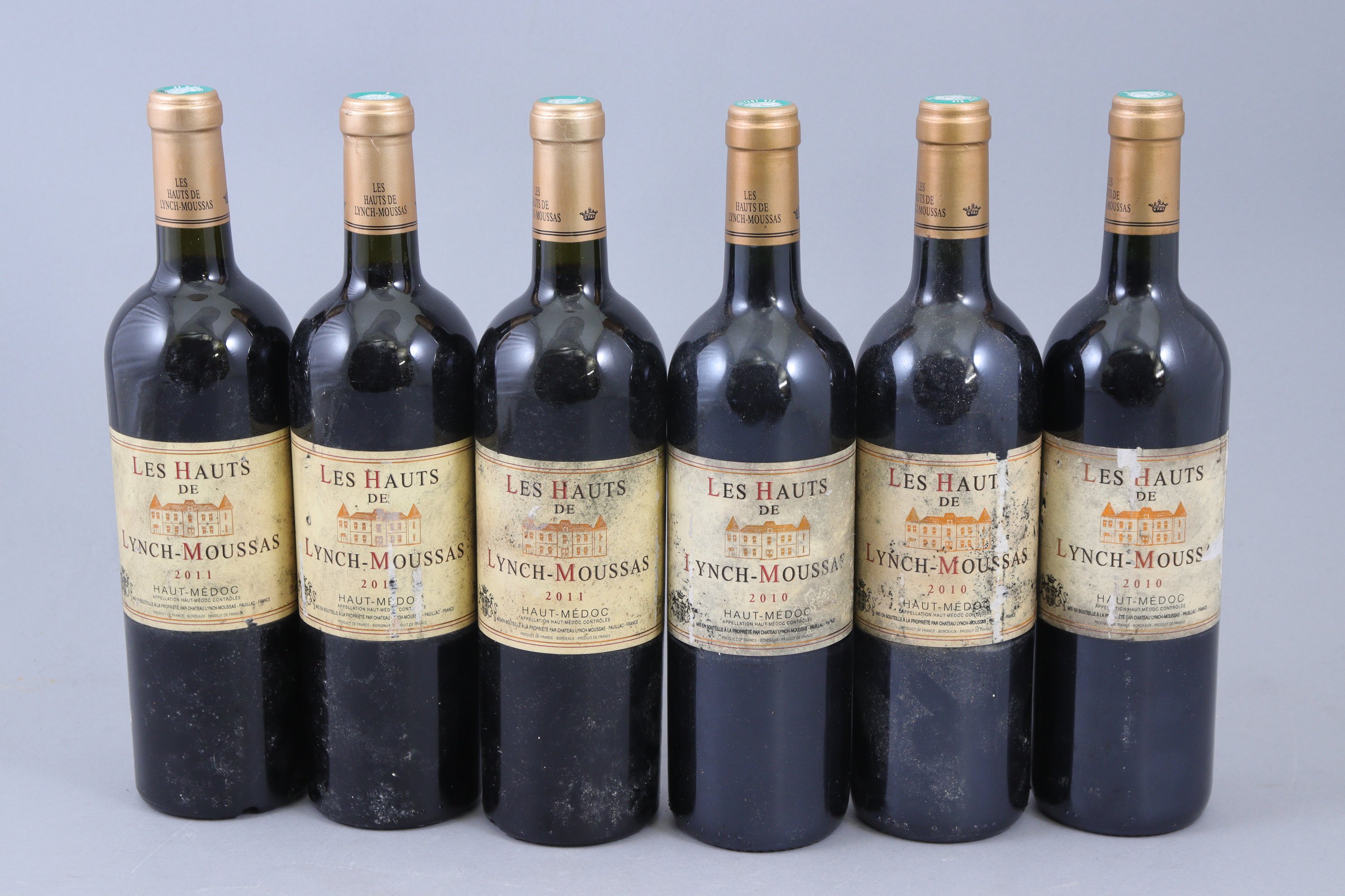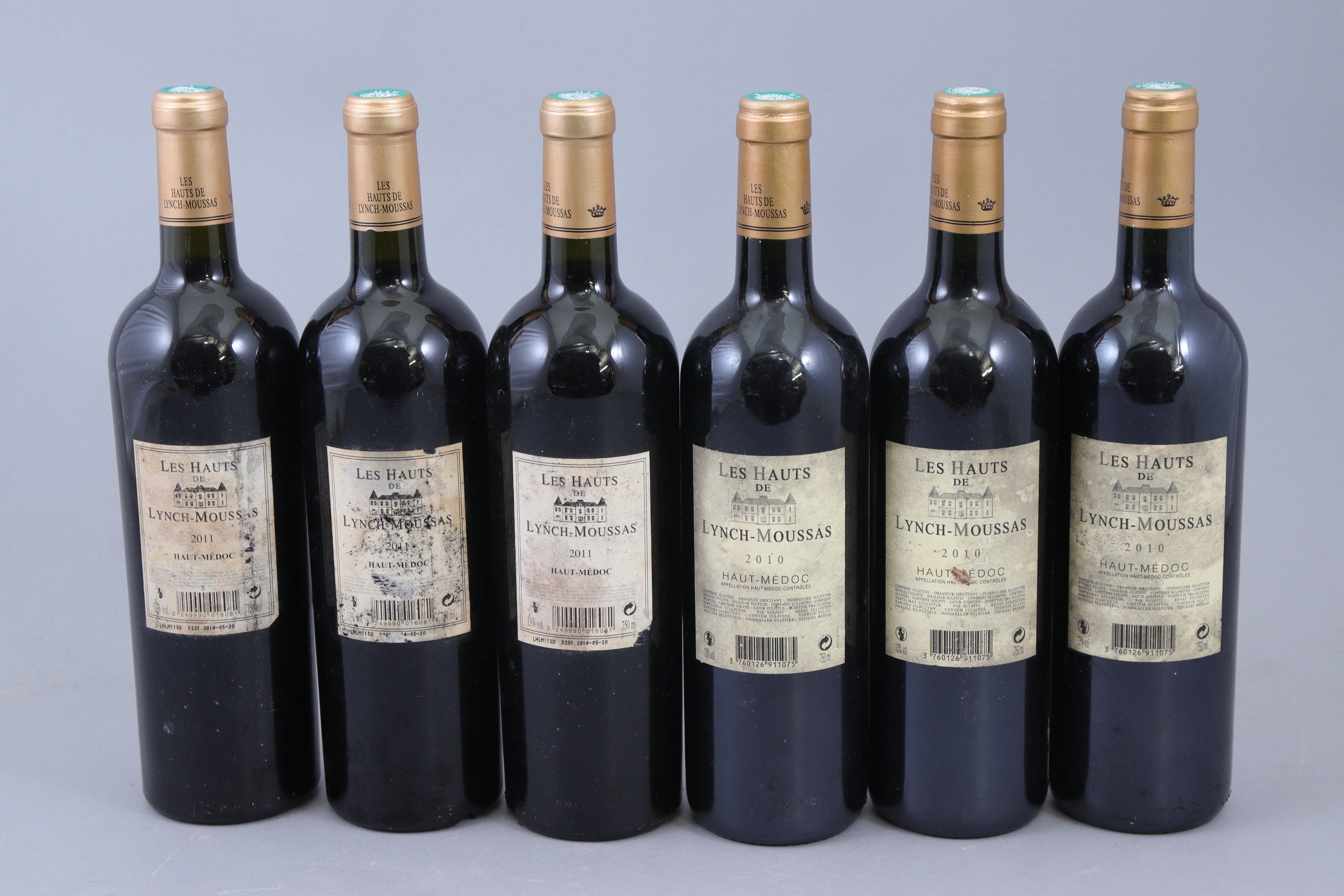 PAUILLAC, Les Hauts de Lynch Moussas, 3 bouteilles 2010 et 3 bouteilles 2011. Bons niveaux. Etiquettes abîmées.