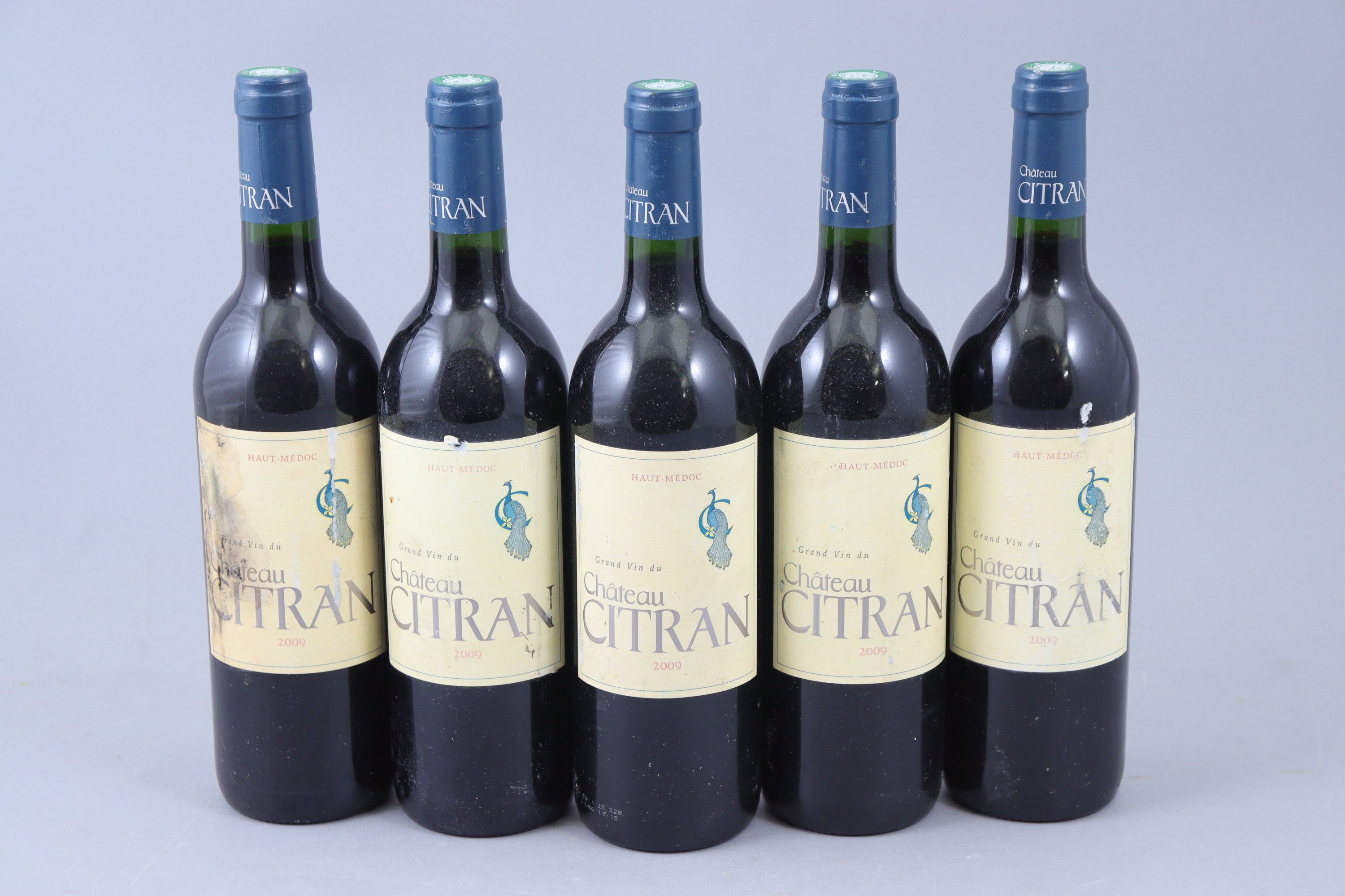 HAUT-MEDOC, Château Citran, 2009, 5 bouteilles. Bons niveaux. Etiquettes abîmées.