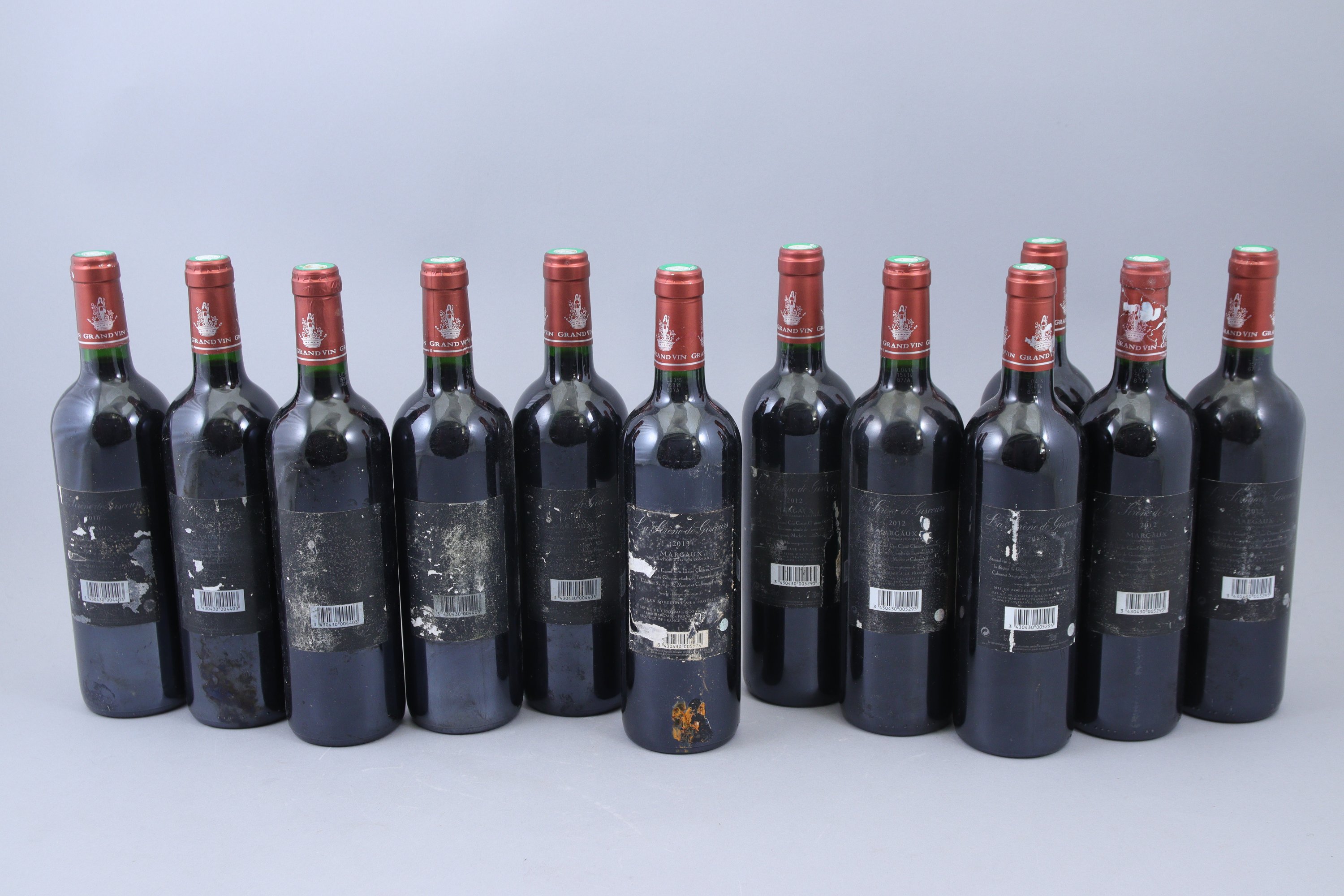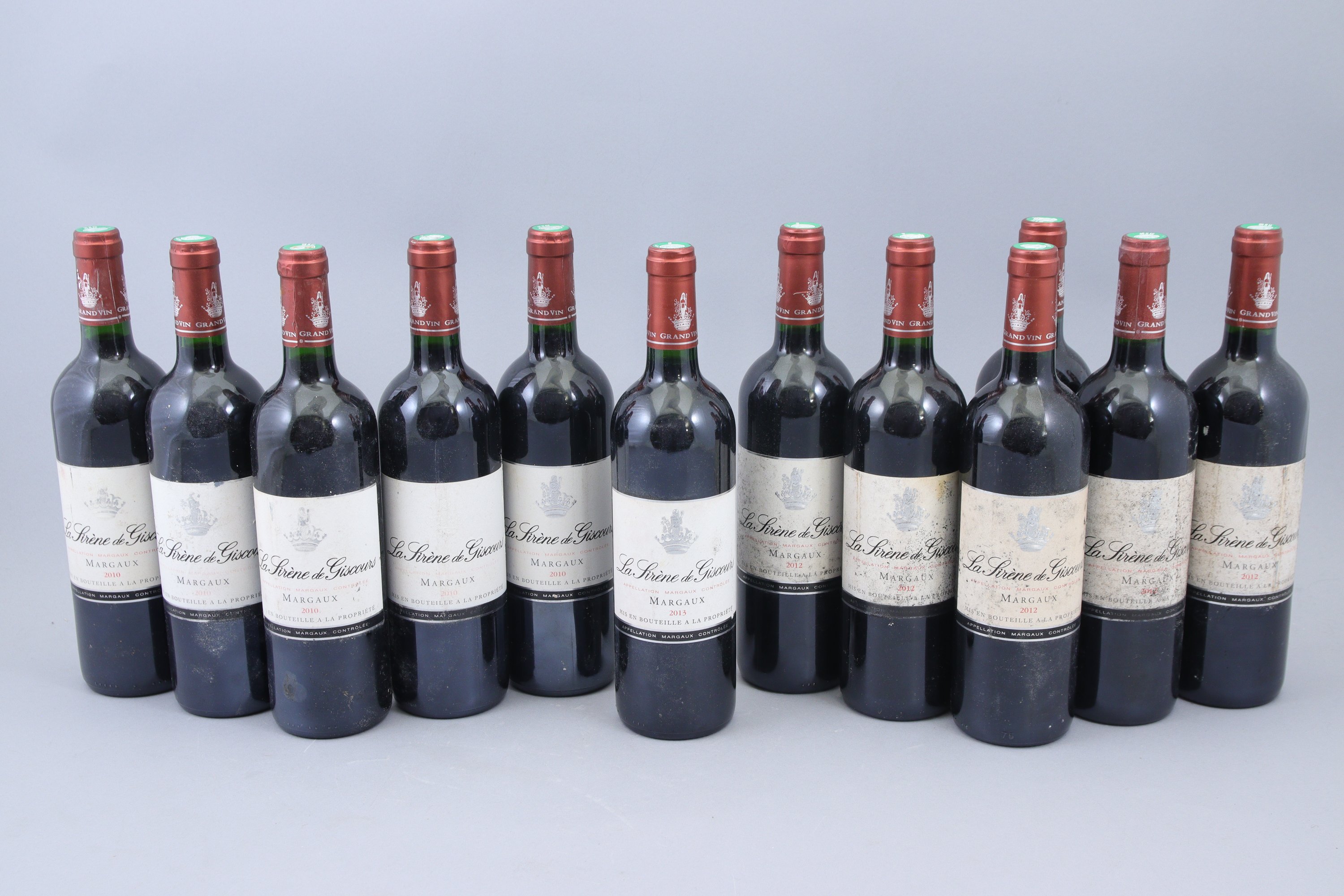 MARGAUX, La Sirène de Giscours, 12 bouteilles: 5 bouteilles de 2010, 6 bouteilles de 2012, 1 bouteille de 2013. Variation dans les niveaux, de parfait à bas goulot. Etiquettes abîmées.