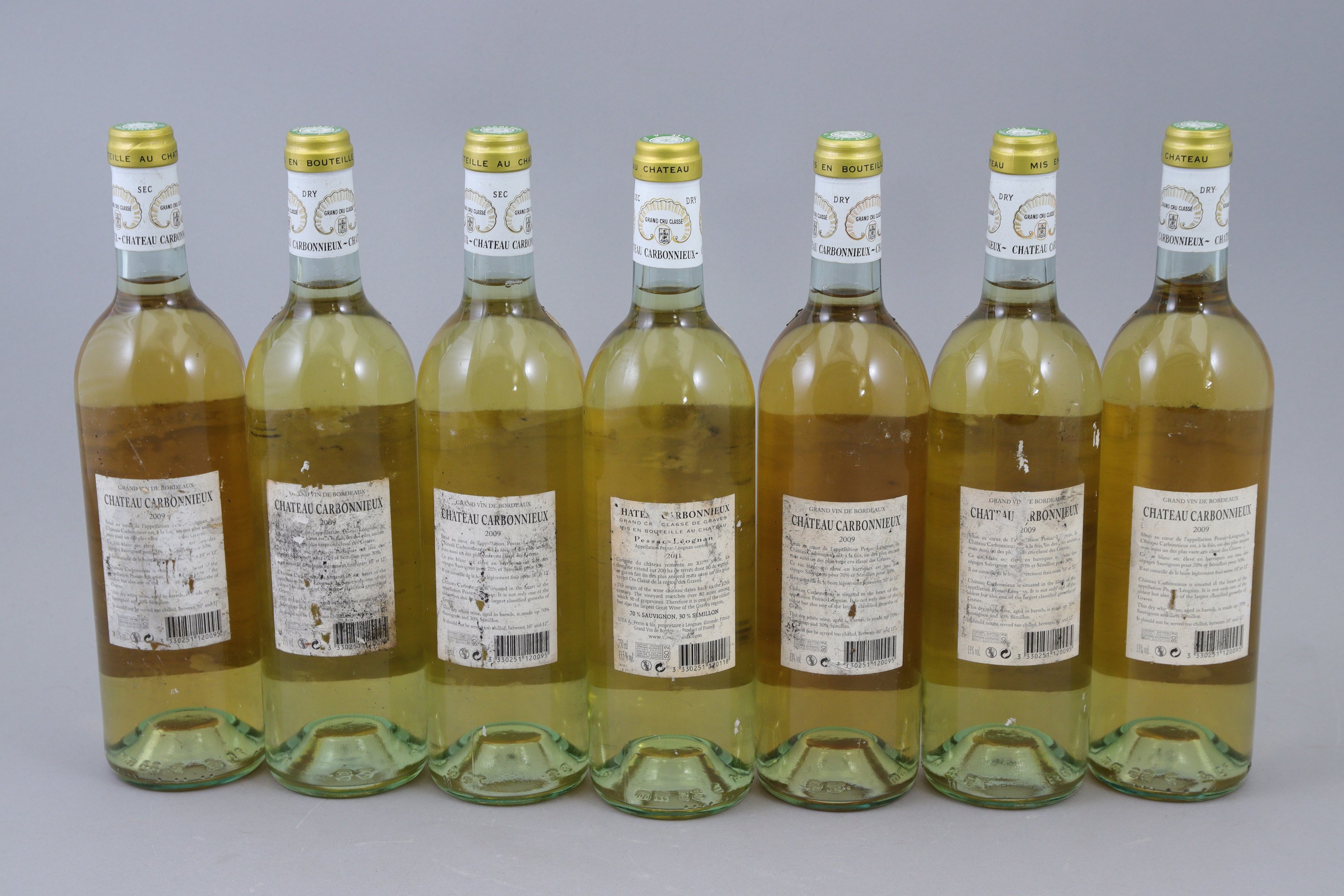 PESSAC-LEOGNAN, Grand Cru Classé, Château Carbonnieux, 6 bouteilles de 2009 et 1 bouteille de 2011. Bons niveaux. Etiquettes abîmées.