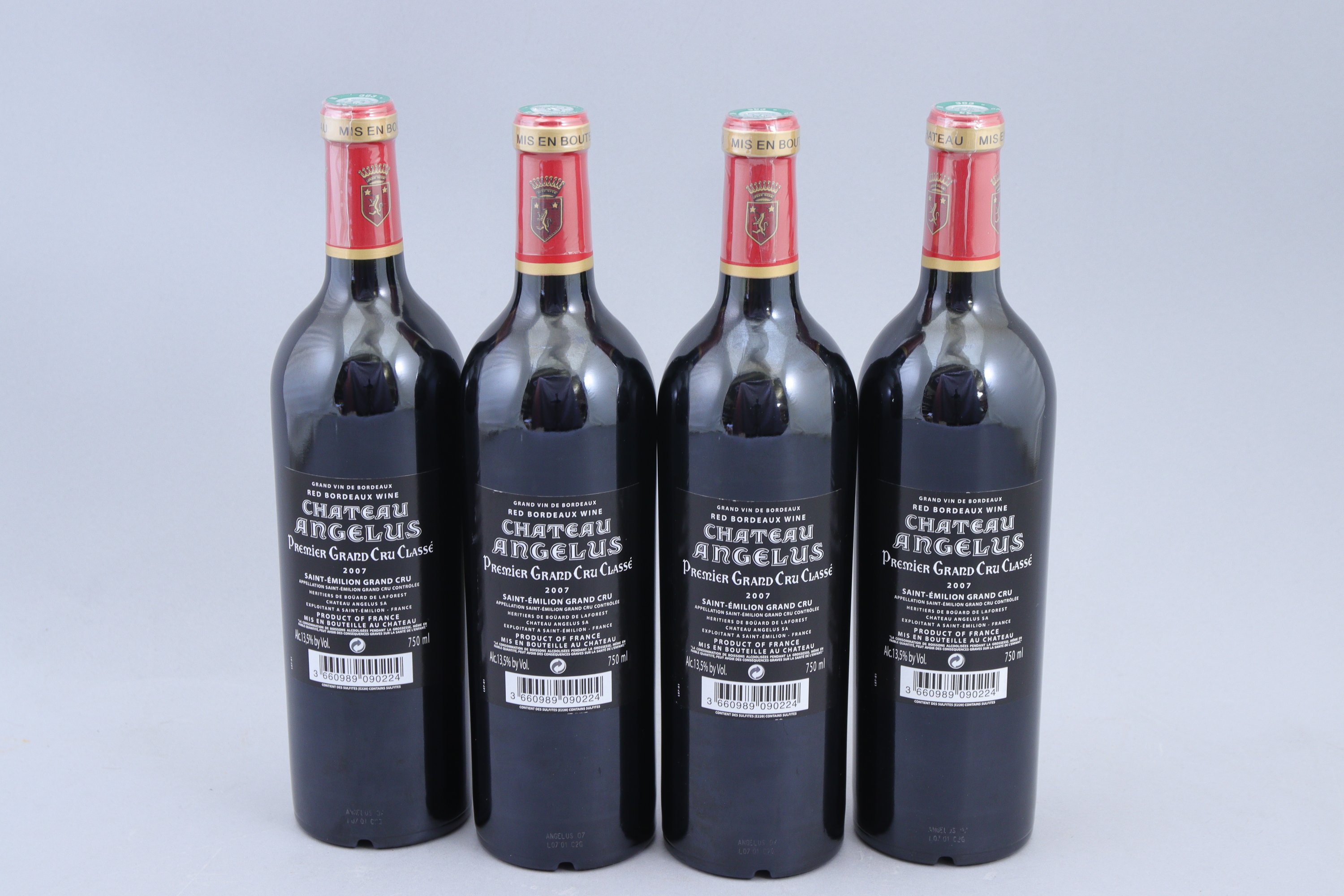 SAINT-EMILION, Grand Cru Classé 1, Château Angelus, 2007, 4 bouteilles. Variation dans les niveaux: de normal à bas goulot.