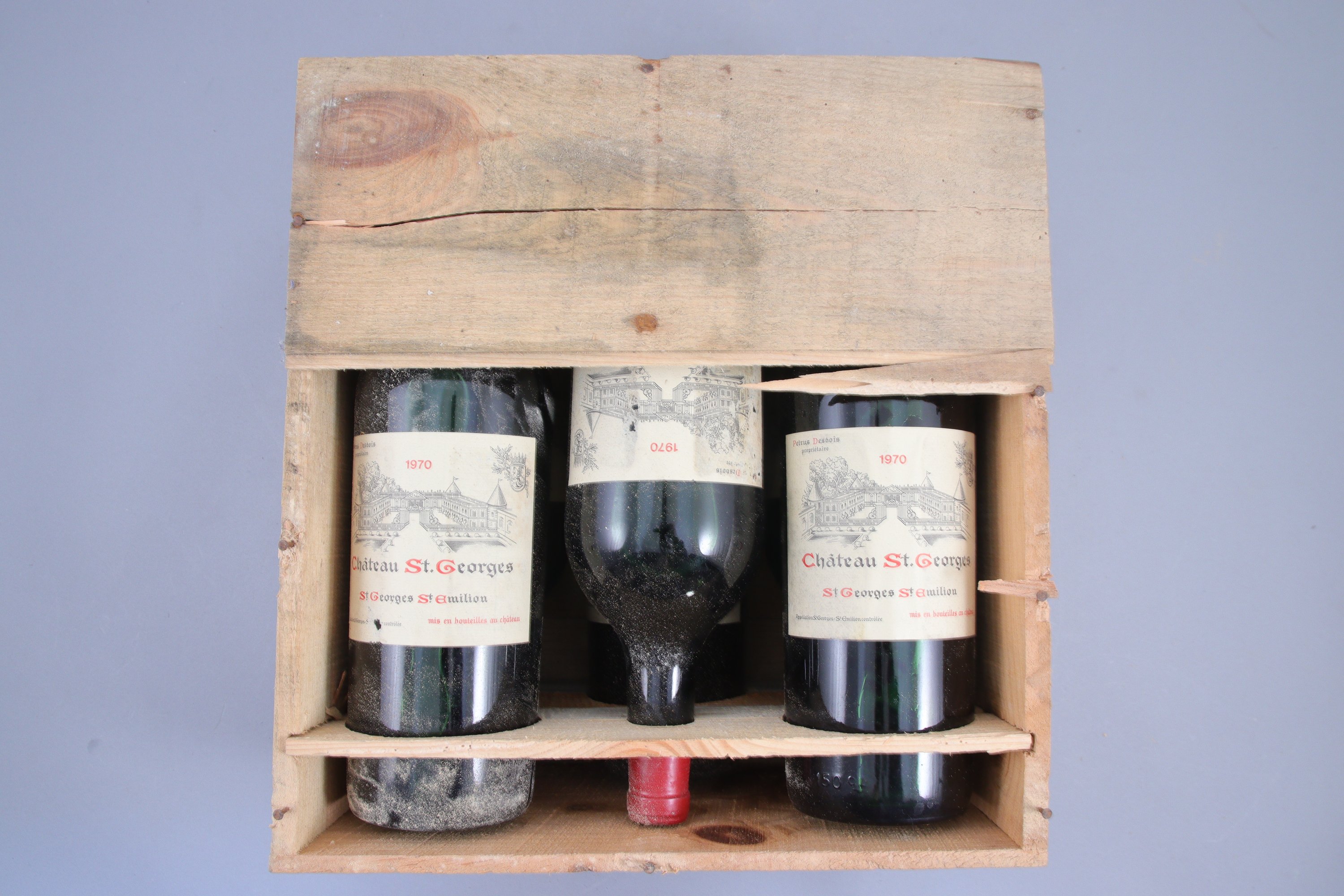 SAINT-EMILION, Château Saint-Georges, 1970, 6 magnums. Niveau variable entre bas goulot et très légèrement bas. Dans leur caisse ouverte.