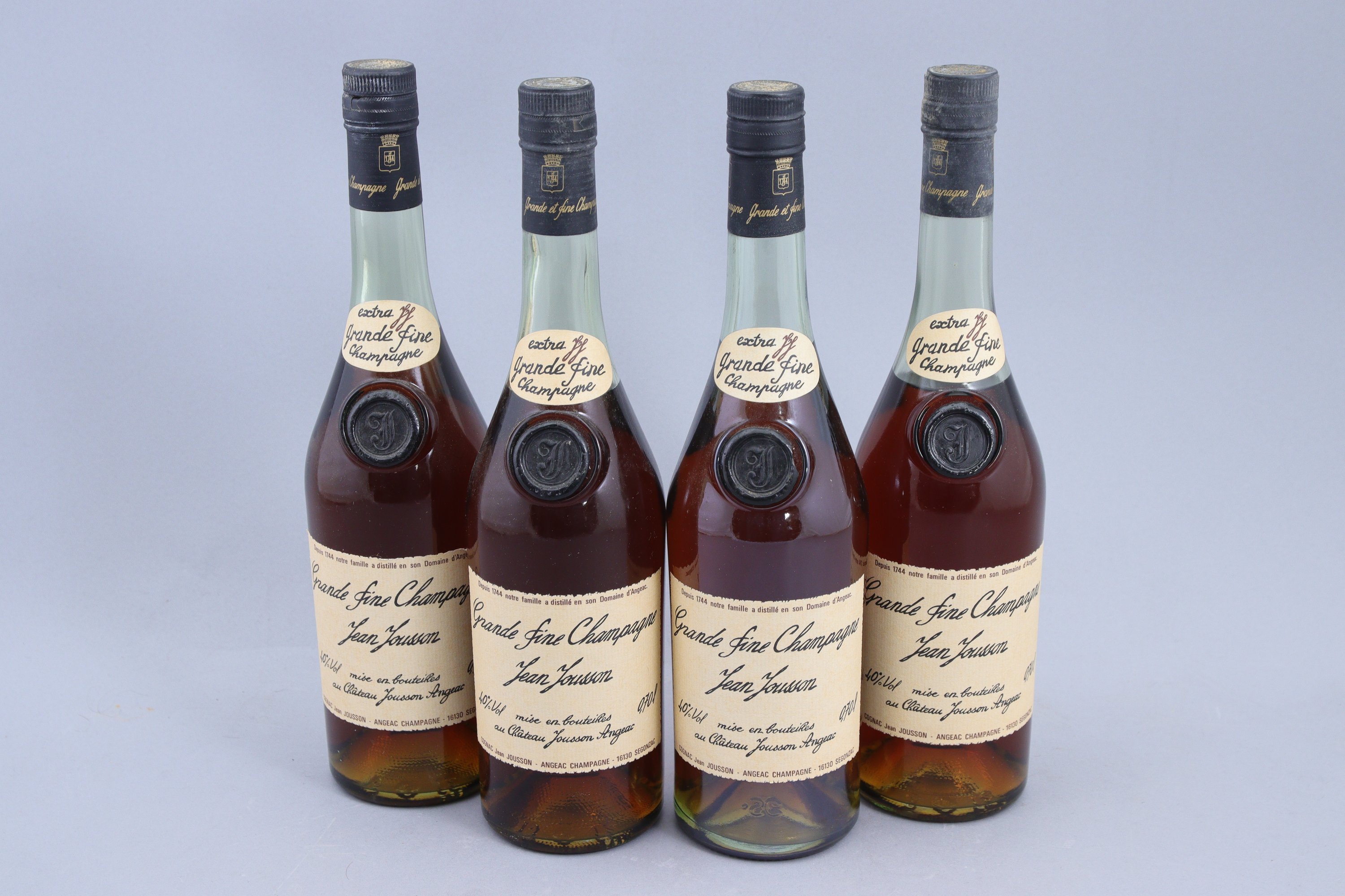 COGNAC, Jean Jousson, Grande Fine Champagne extra J, 70 cl, 4 bouteilles. Une étiquette légèrement abimée.