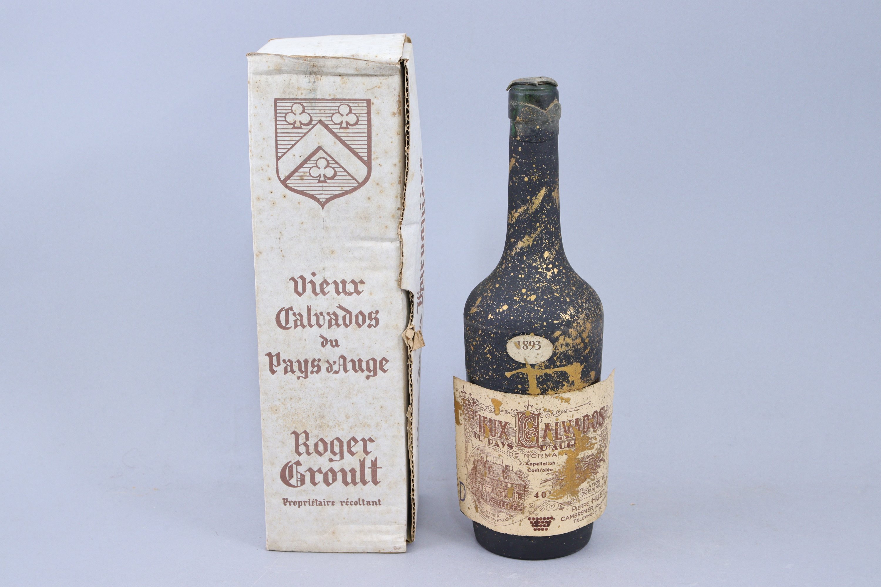 CALVADOS, Vieux Calvados du Pays d'Auge, Domaine Pierre Huet, 1893, 1 bouteille, 75 cl. Dans un carton, capsule de verre endommagée au goulot et étiquette à refixer.