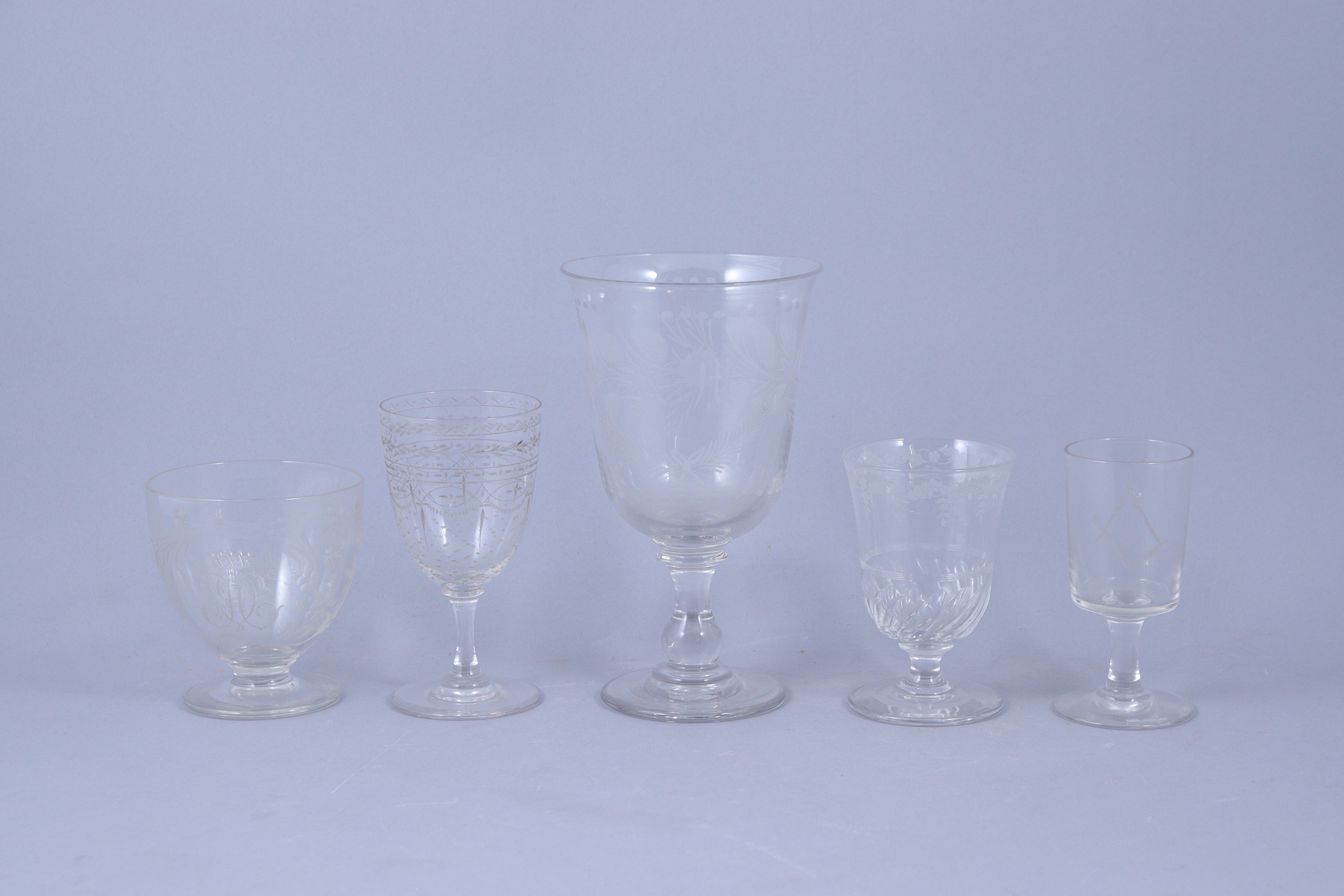 - Grand verre tulipe de mariage en verre à décor gravé d'une couronne florale entourant le monogramme "AM". Milieu du XIXe siècle. Haut. 20,5 cm.