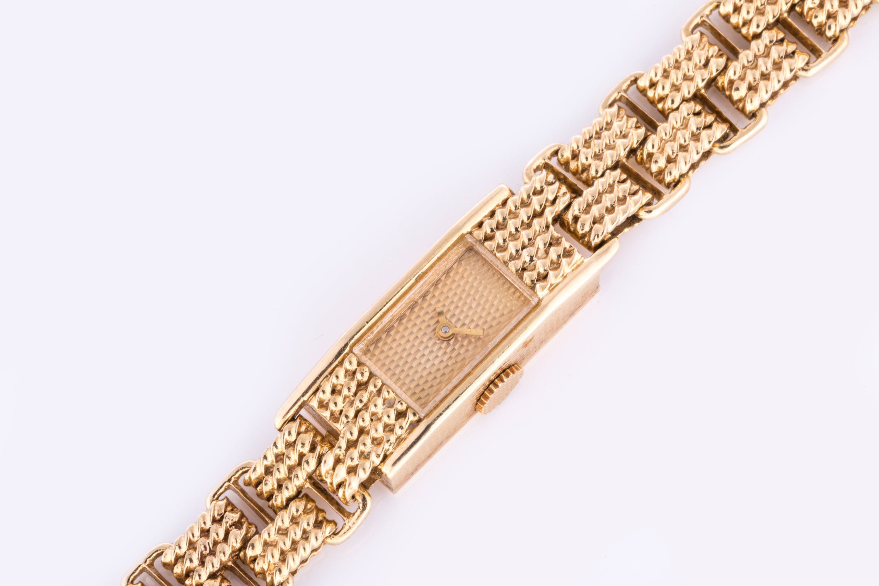 en or jaune 750 millièmes. Boîtier rectangulaire, cadran à décor en pointes de diamant. Mouvement à remontage mécanique. Signée "Boucheron Paris" au revers du boîtier.