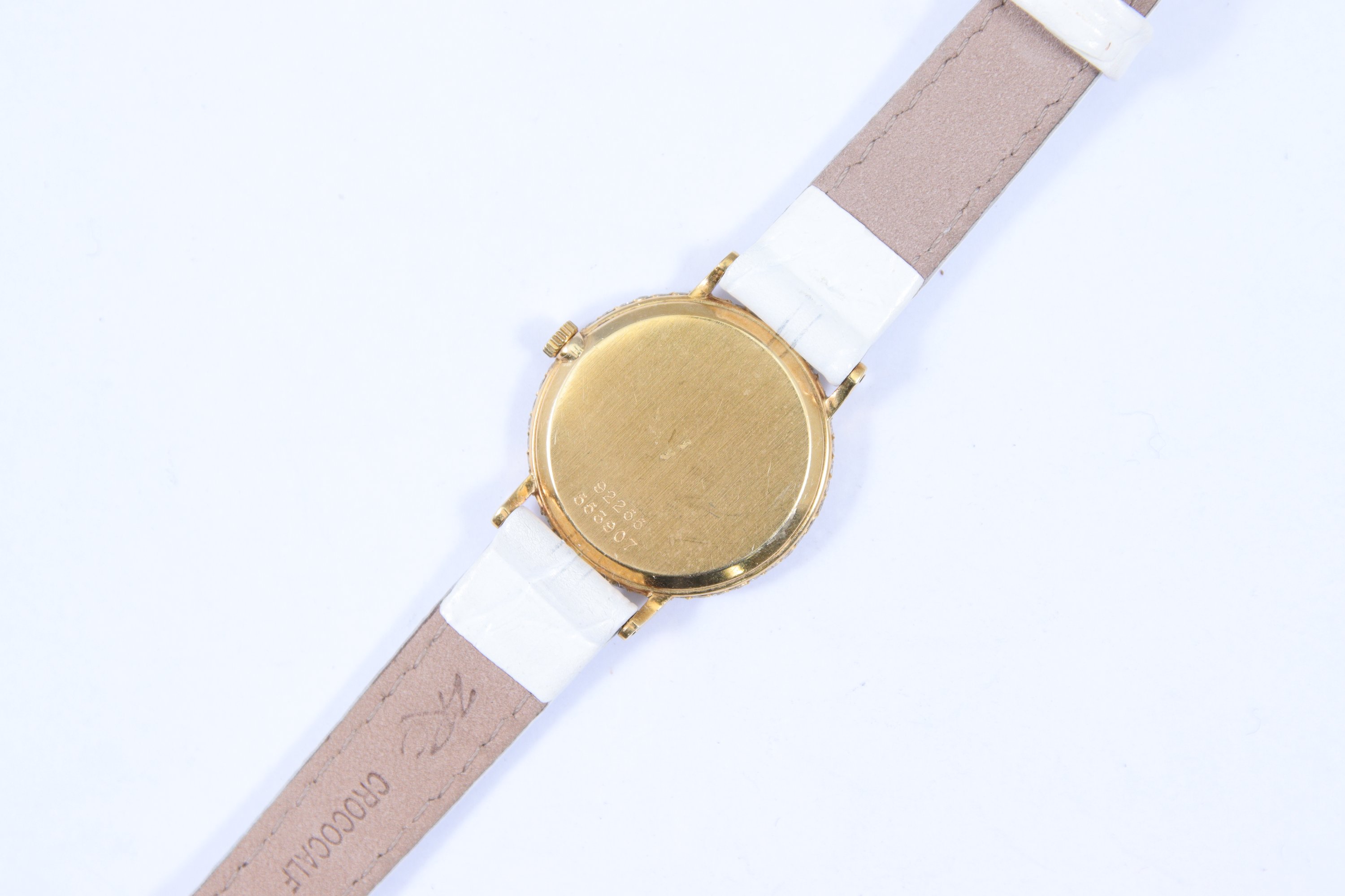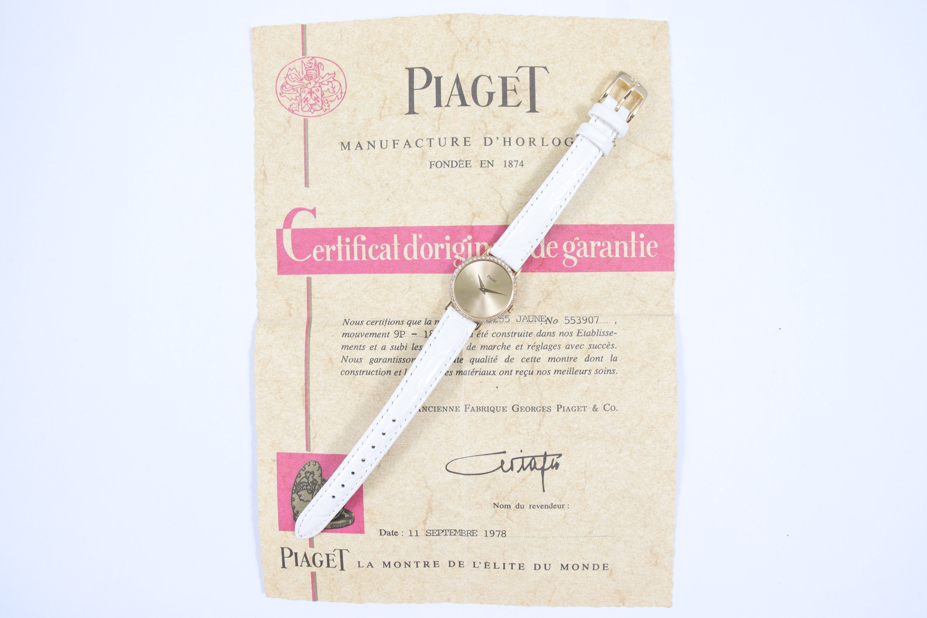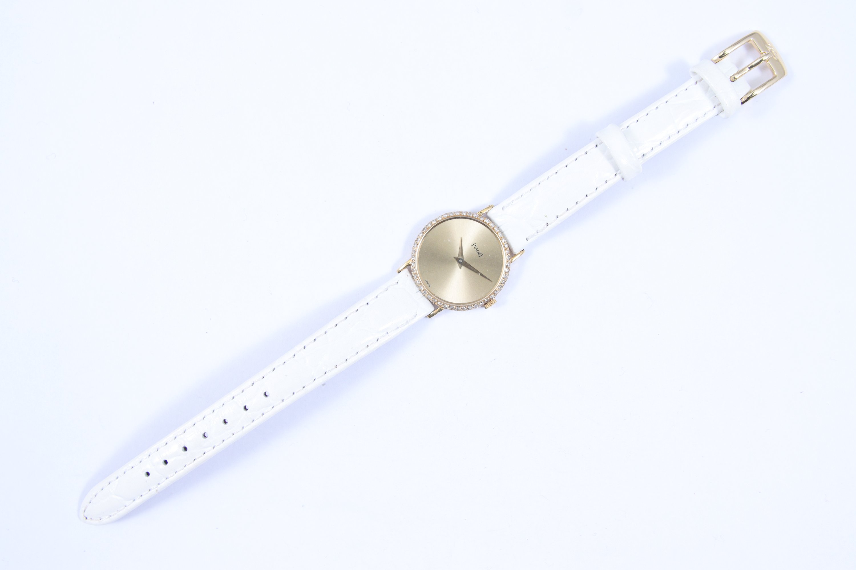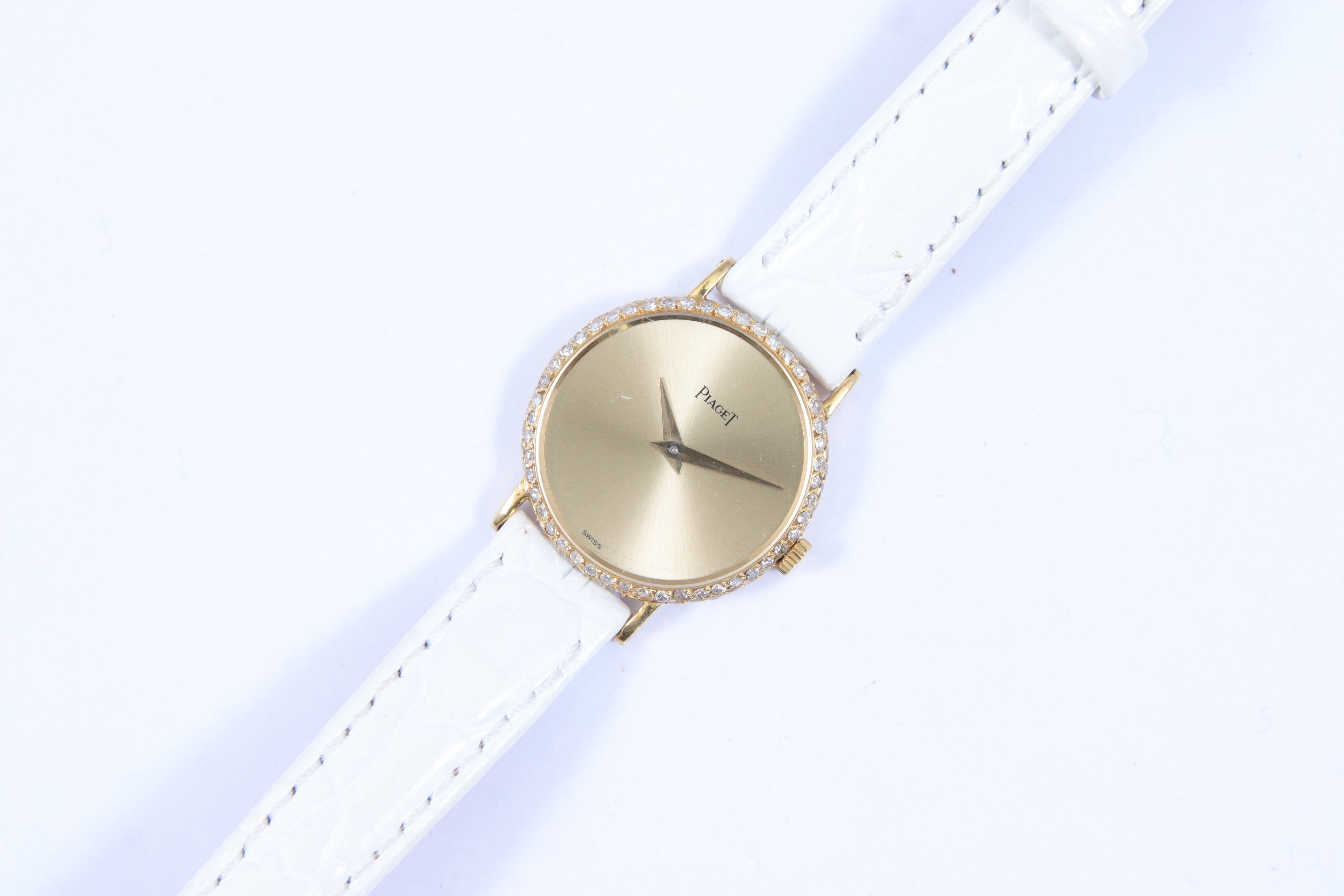 en or jaune 750 millièmes. Le boîtier serti de diamants taille brillant entourant un cadran rond à fond doré signé Piaget. Numérotée "553907".