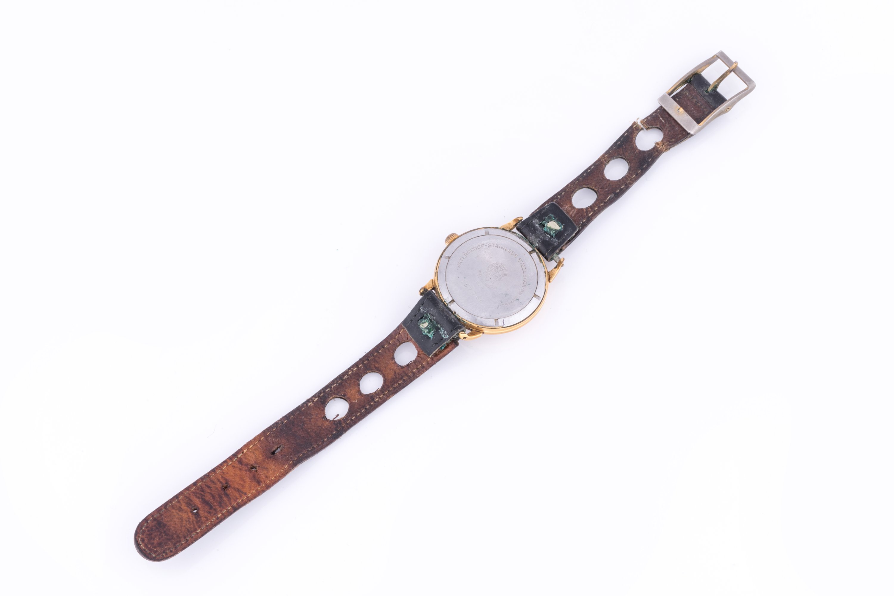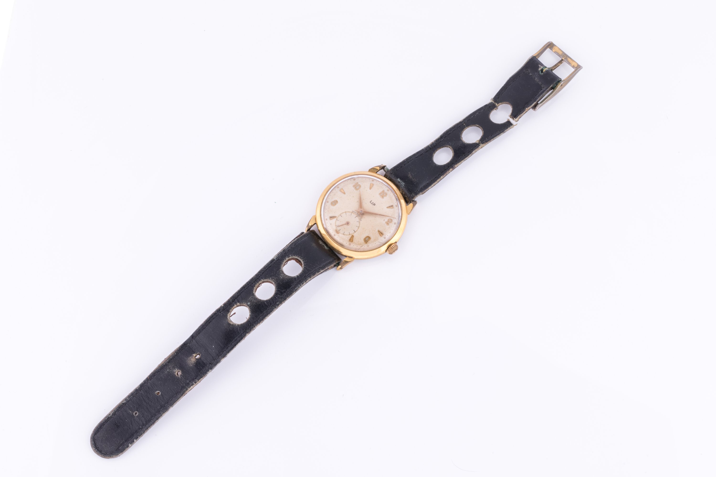 en métal doré et acier. Le cadran indiquant les heures en chiffres arabes, les minutes par des pointillés. Petite trotteuse à 6 heures. Numérotée 157066. Mouvement mécanique.