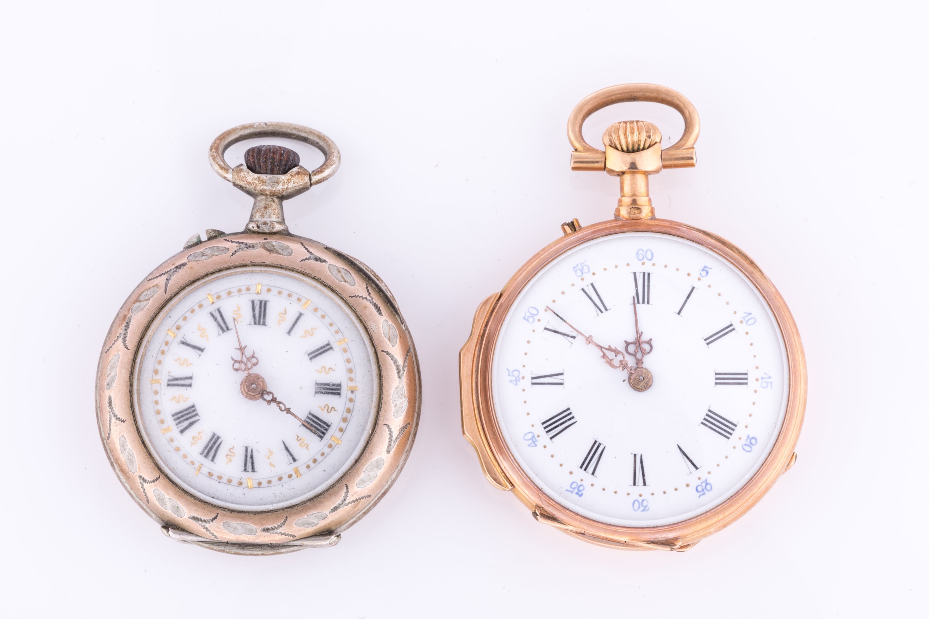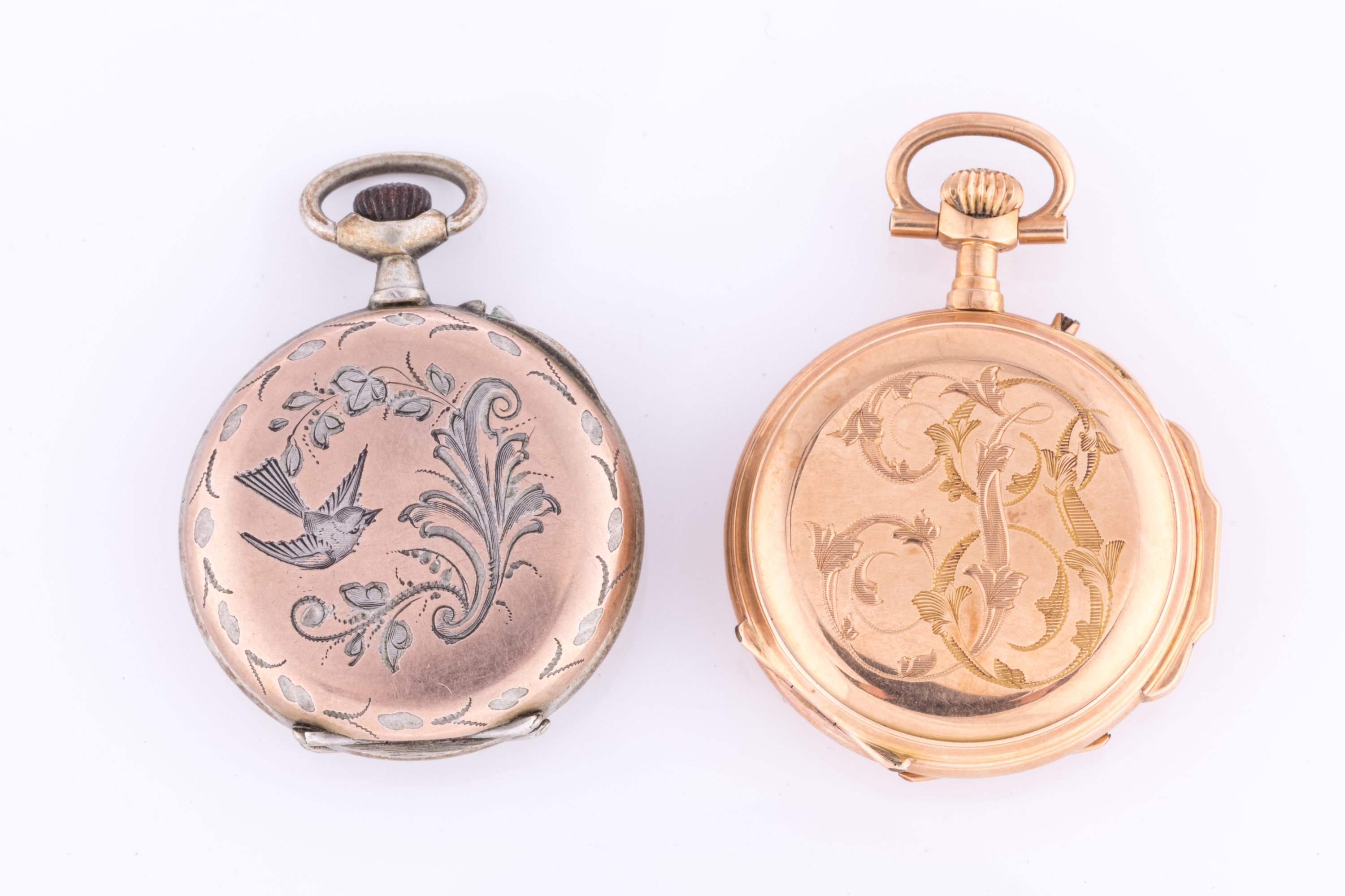 Jointe: montre de col en argent anciennement vermeillé. Le cadran émaillé blanc indiquant les heures en chiffres romains, les minutes par un chemin de fer. Le revers à décor d'un oiseau et feuille d'acanthe. Diam. 30 mm. Poids brut 19,9 g (placage effacé).