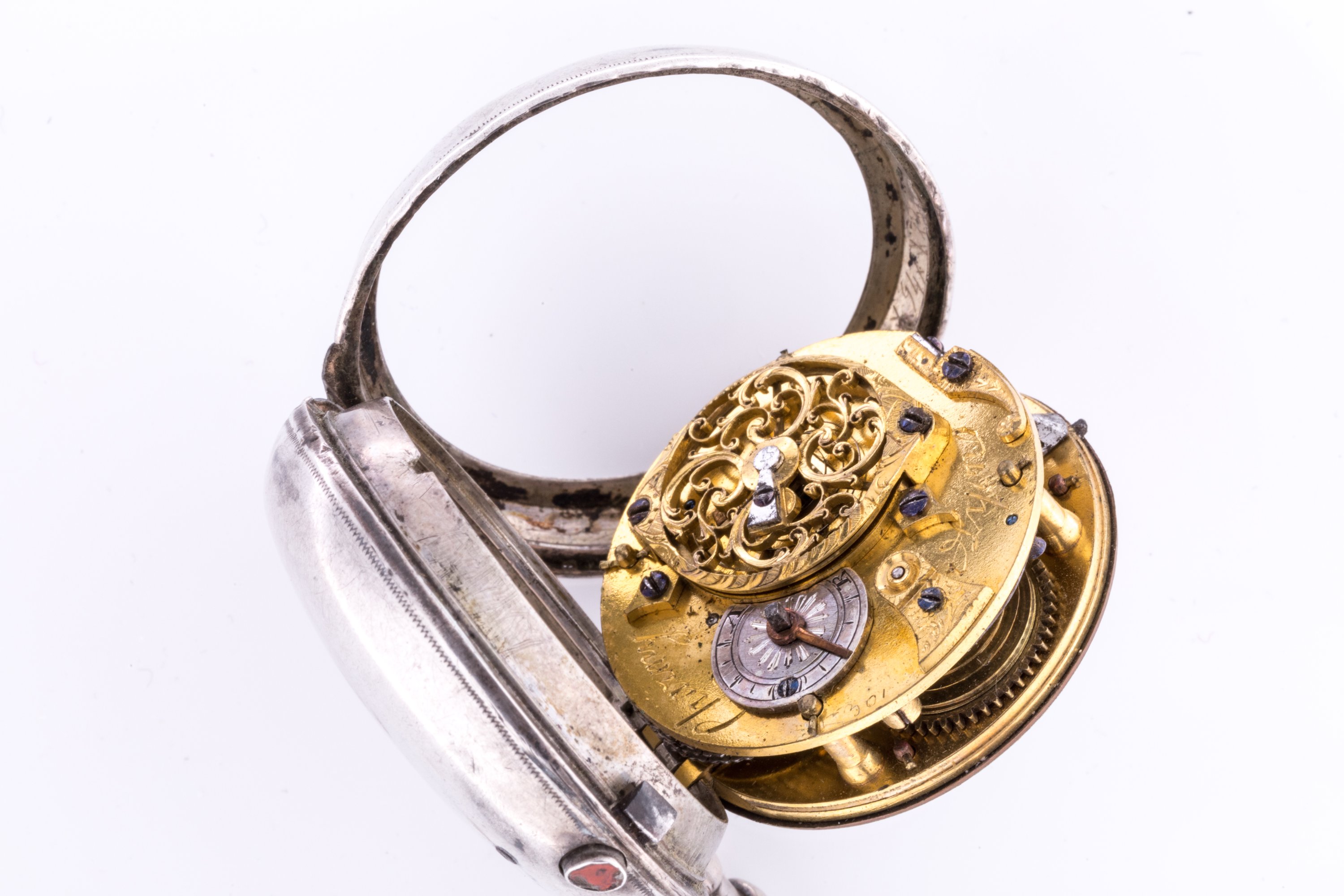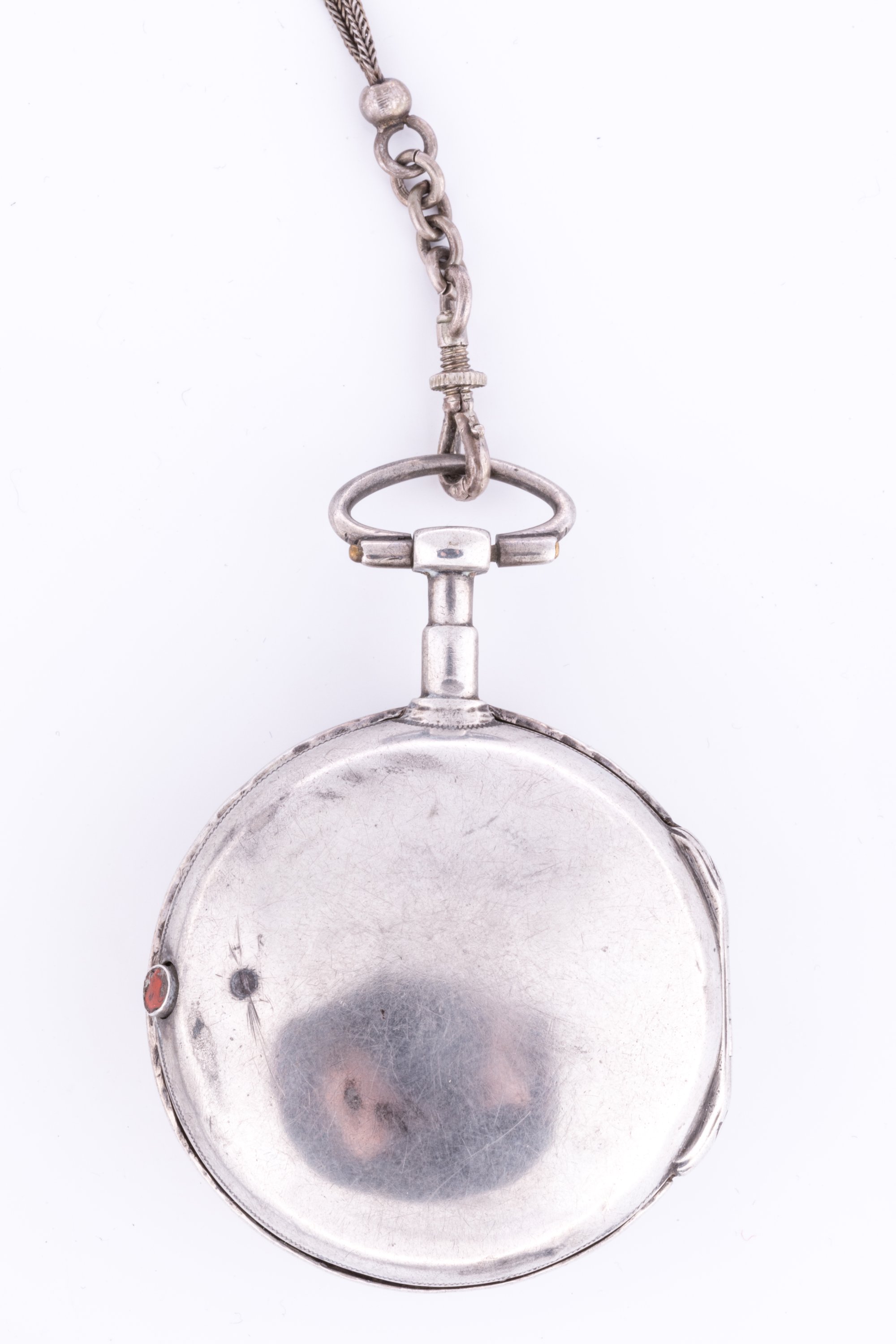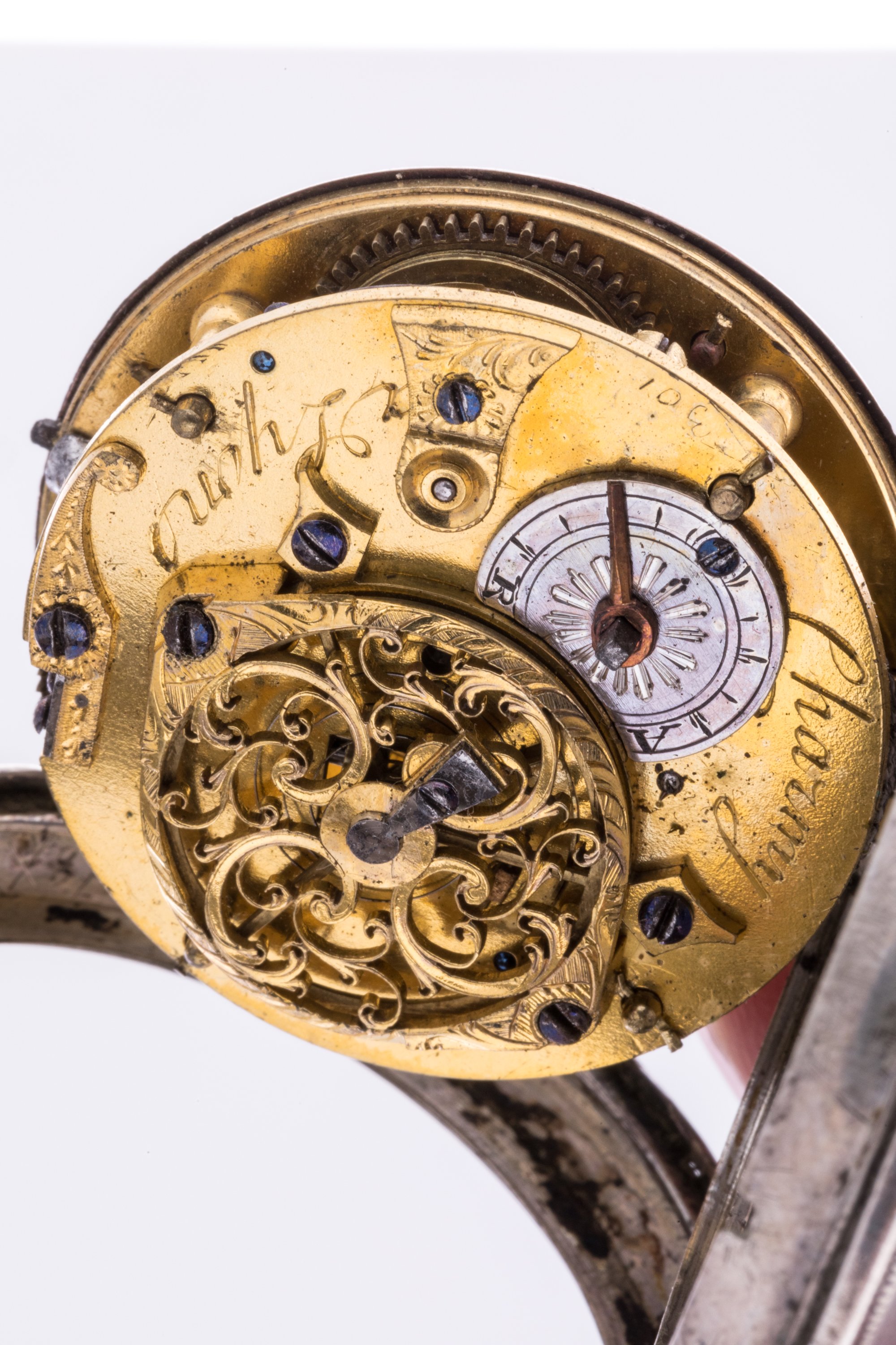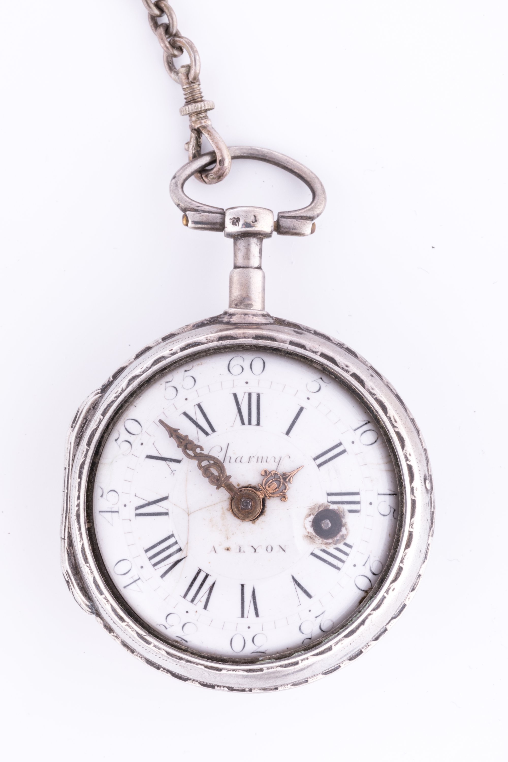 en argent. Le cadran émaillé blanc indiquant les heures en chiffres romains, les minutes par un chemin de fer et chiffres arabes. Remontoir à 3 heures. La platine signée "Charmy Lyon".