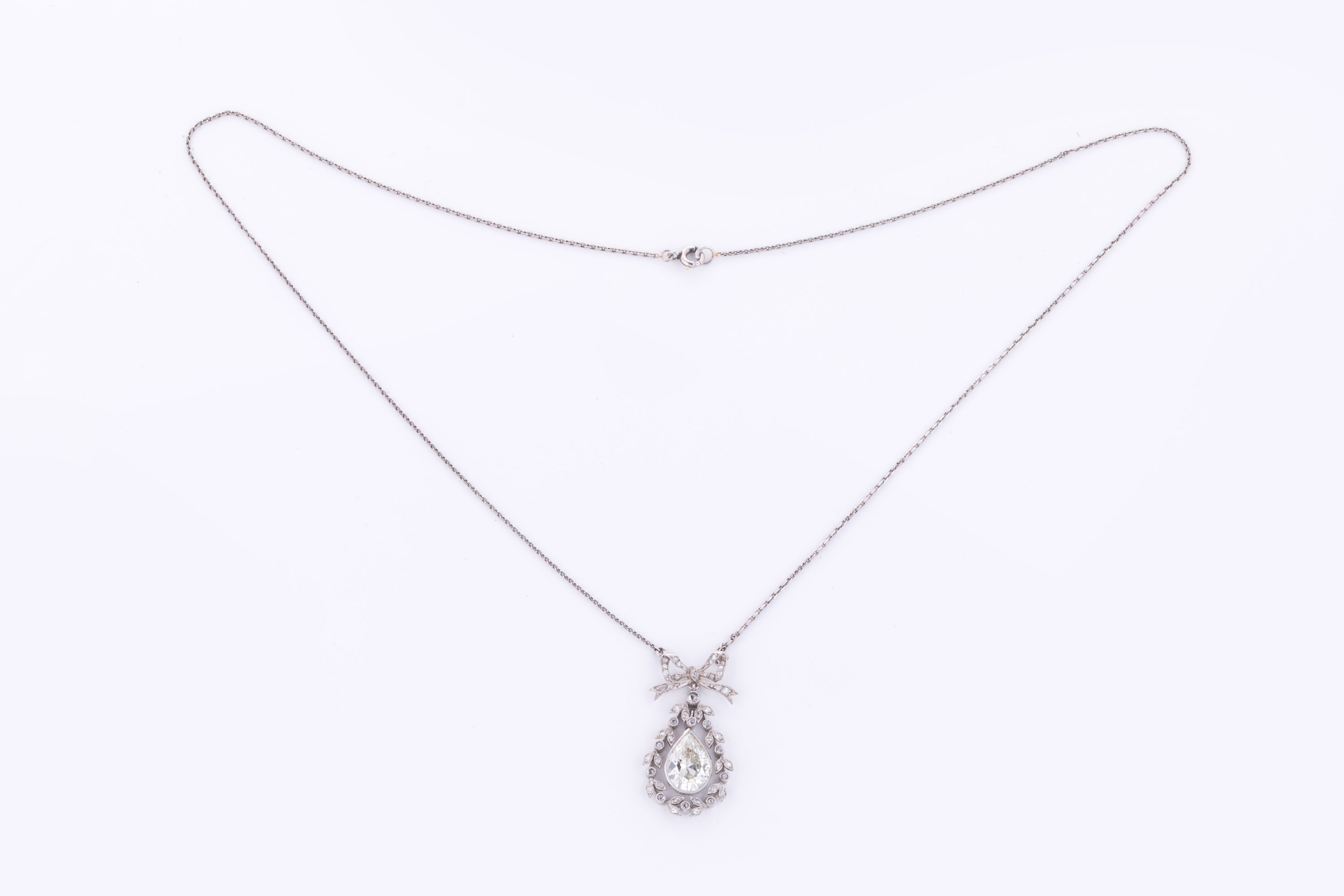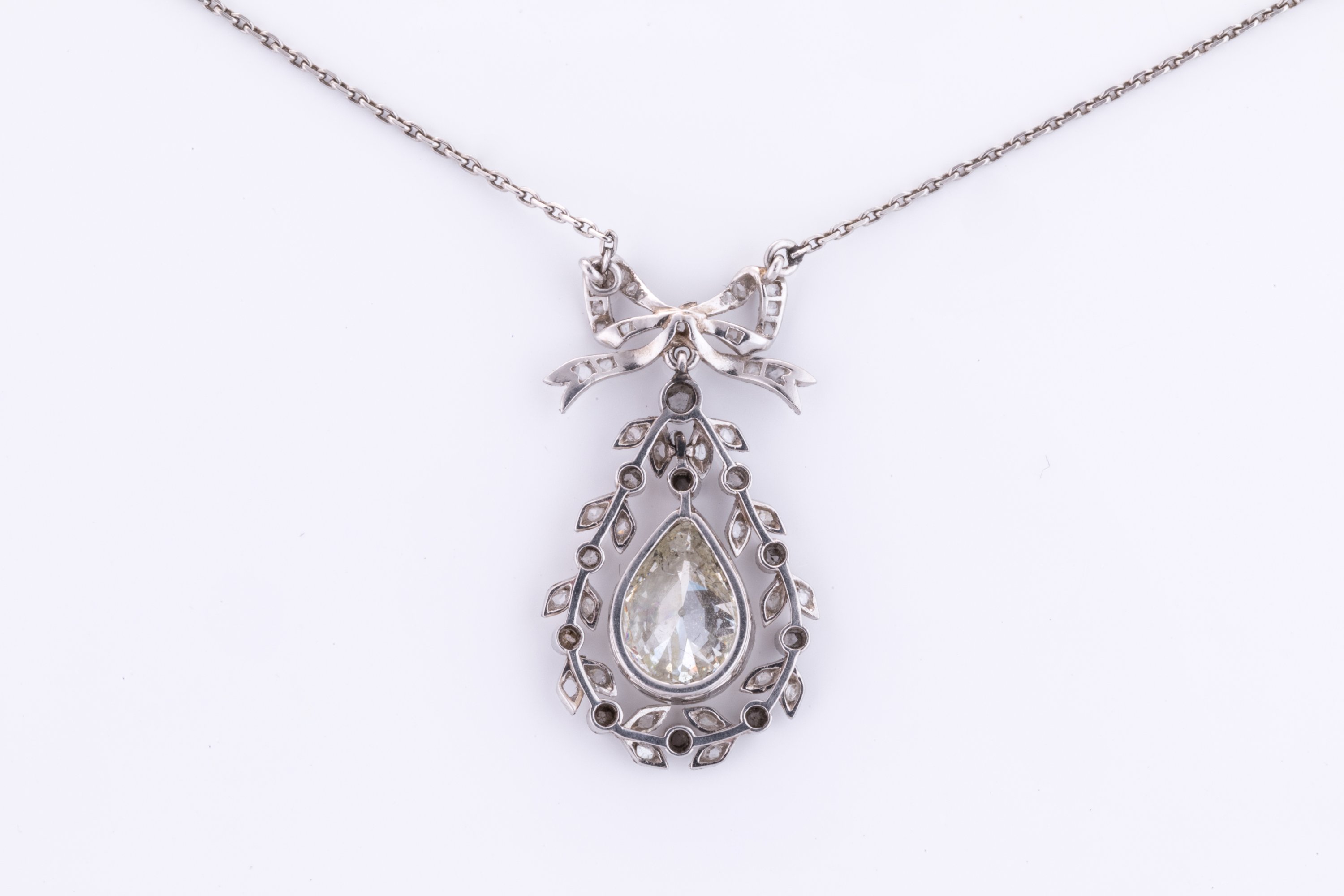 en platine 850 millièmes retenant en pendentif un motif nœud orné de diamants taillés en rose supportant au centre un diamant poire en pampille d'env. 1.60/2.00 ct. dans un entourage feuillagé également serti de diamants taillés en rose.