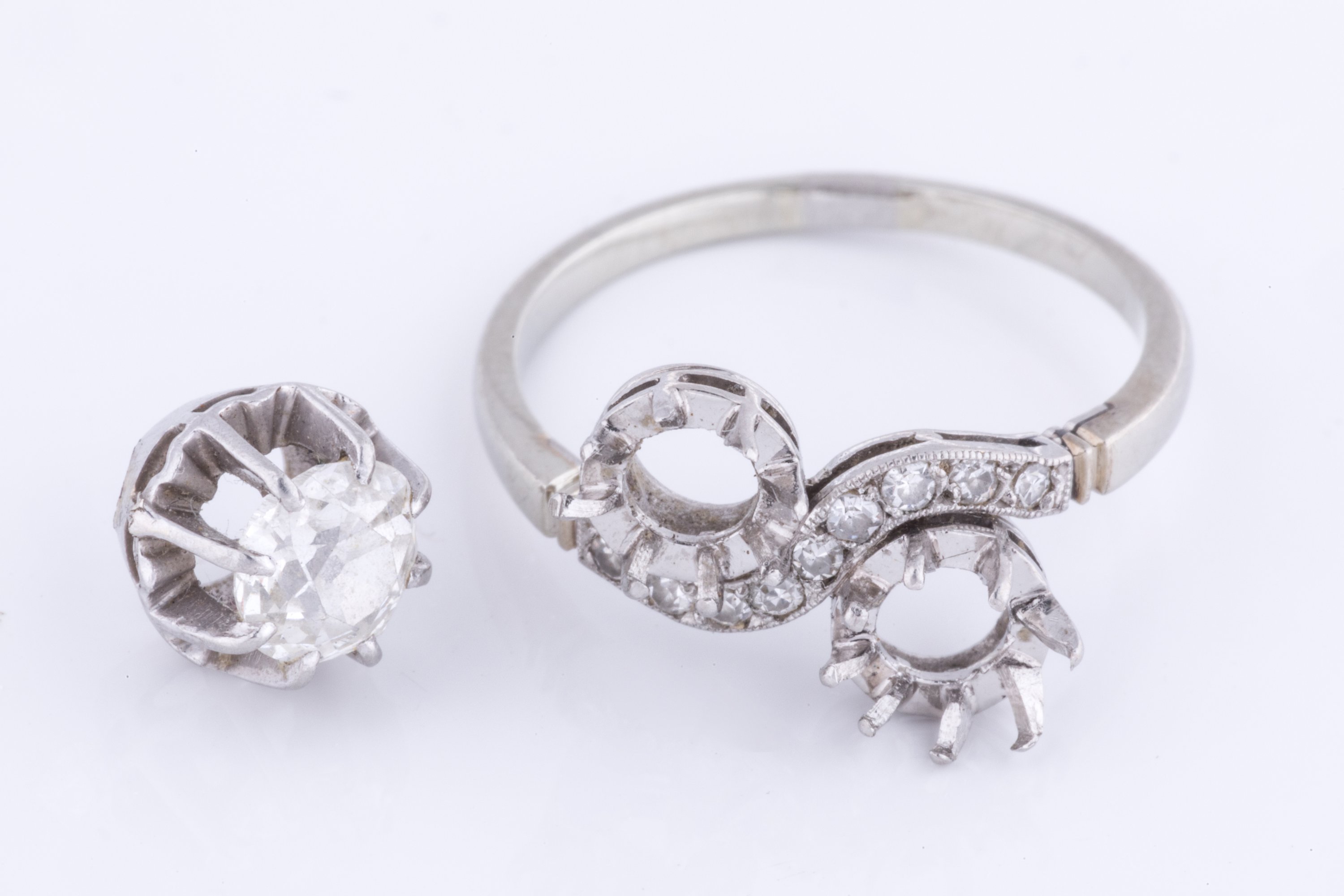de taille ovale ancienne, envion 0,35 ct, avec le reste d'une monture en or gris ou platine.