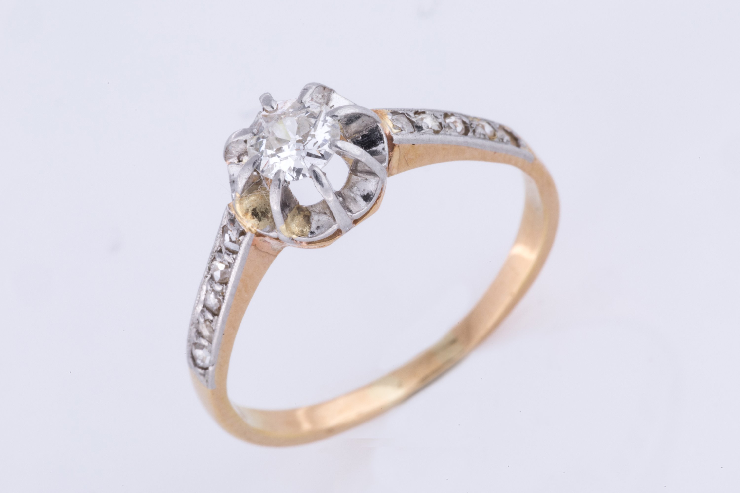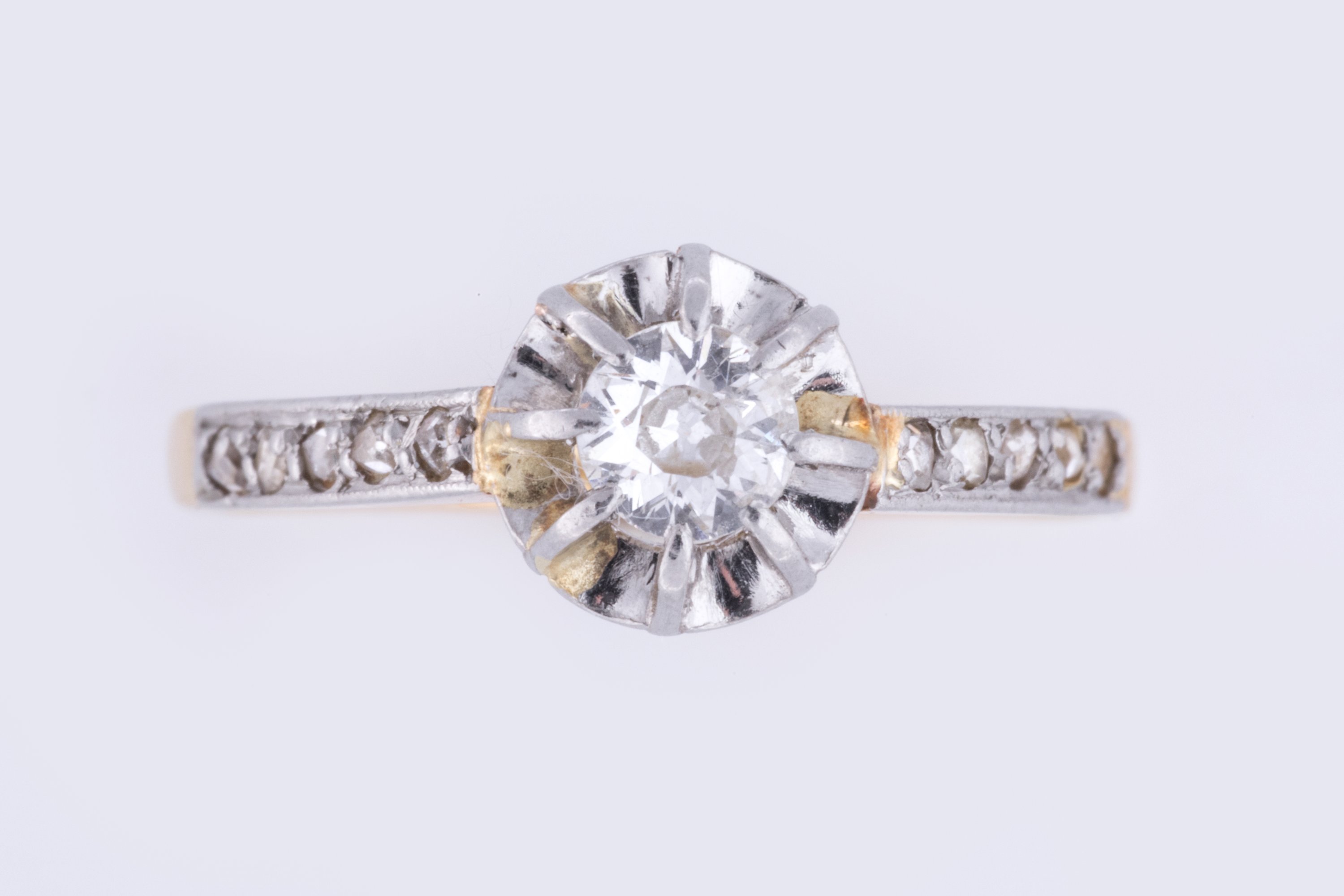 en or jaune 750 millièmes et platine, ornée d'un diamant de taille ancienne d'environ 0,2 ct sur une collerette. La monture pavée de brillants.