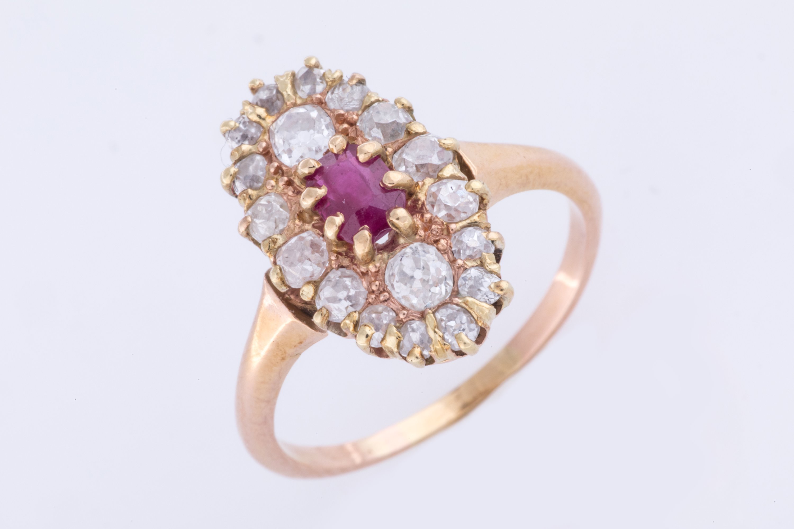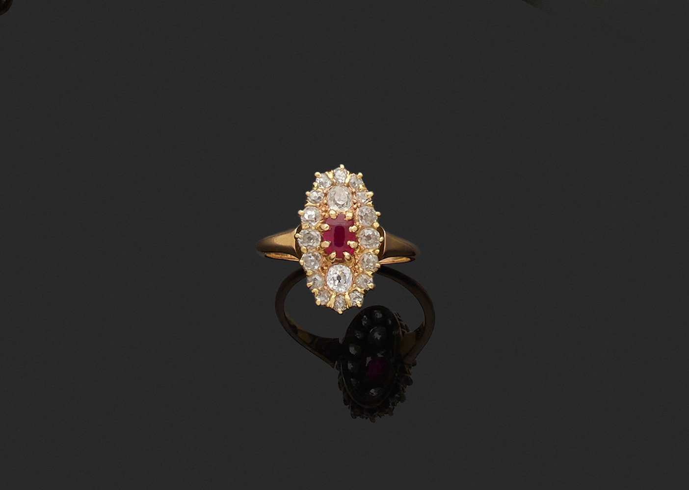 en or jaune 750 millièmes, le centre de forme navette orné d'un rubis coussin dans un entourage de diamants ronds et coussins de taille ancienne.