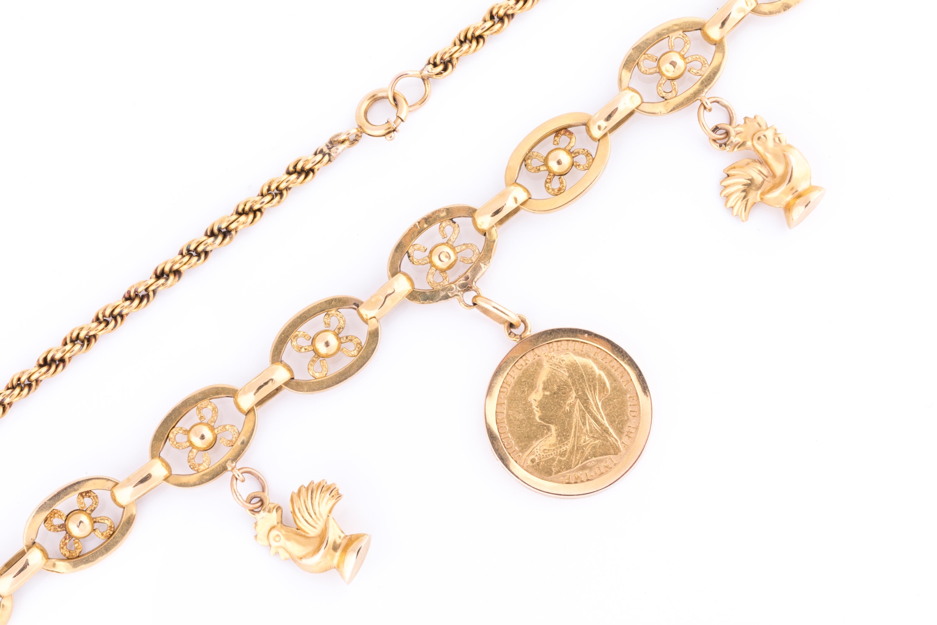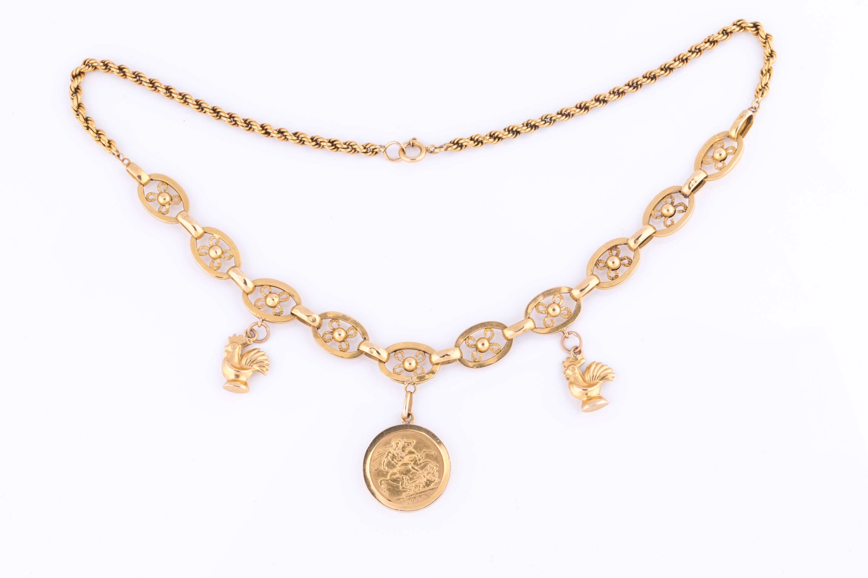 en or jaune 750 millièmes, à mailles corde et mailles cheval stylisées aux fleurettes, orné de deux pendentifs au coq et un souverain Victoria 1900 dans une monture.