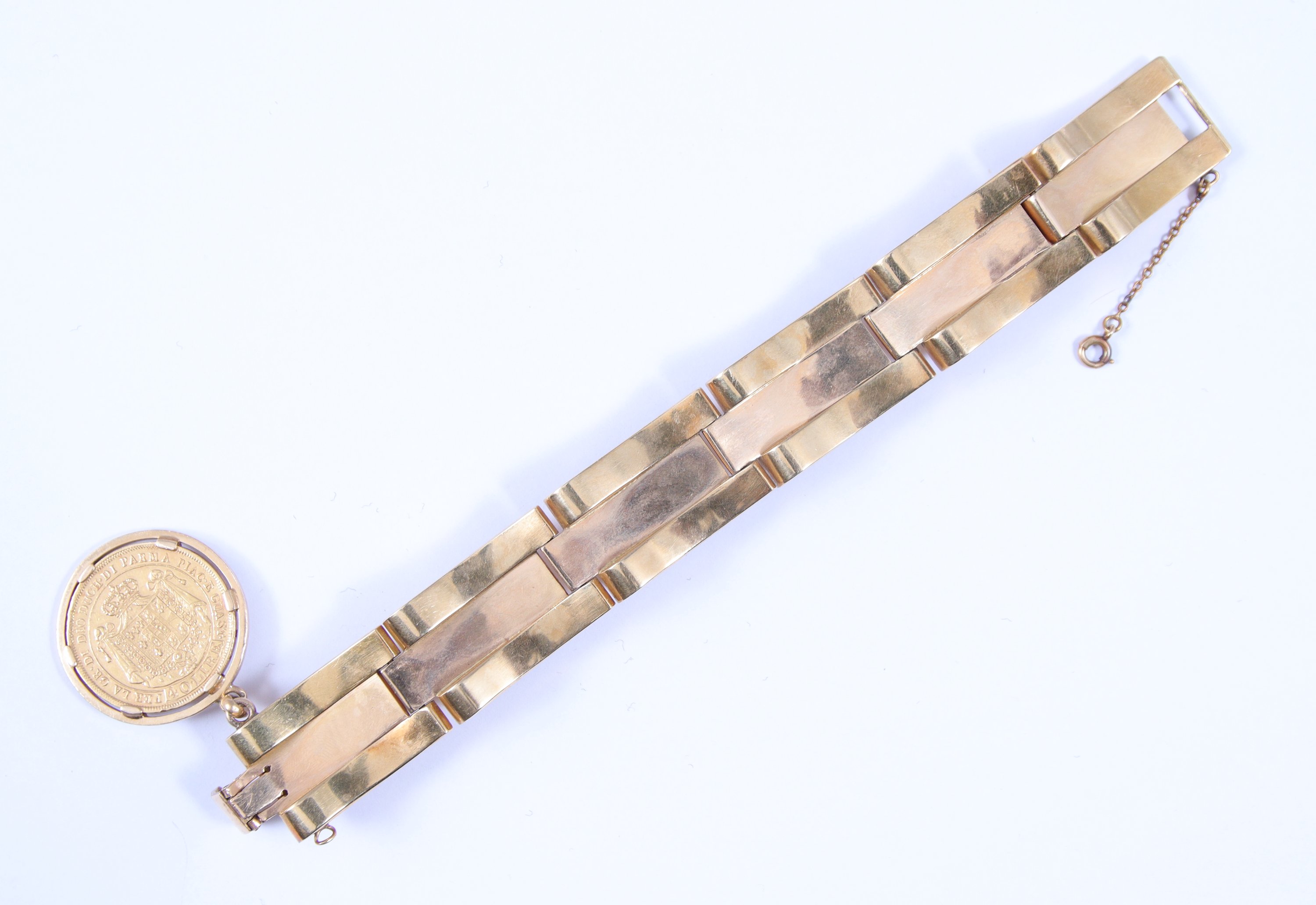 en or jaune 750 millièmes retenant une pièce de 40 lires or Maria Luigia 1815, dans une monture en or jaune 750 millièmes. Chaînette de sécurité.