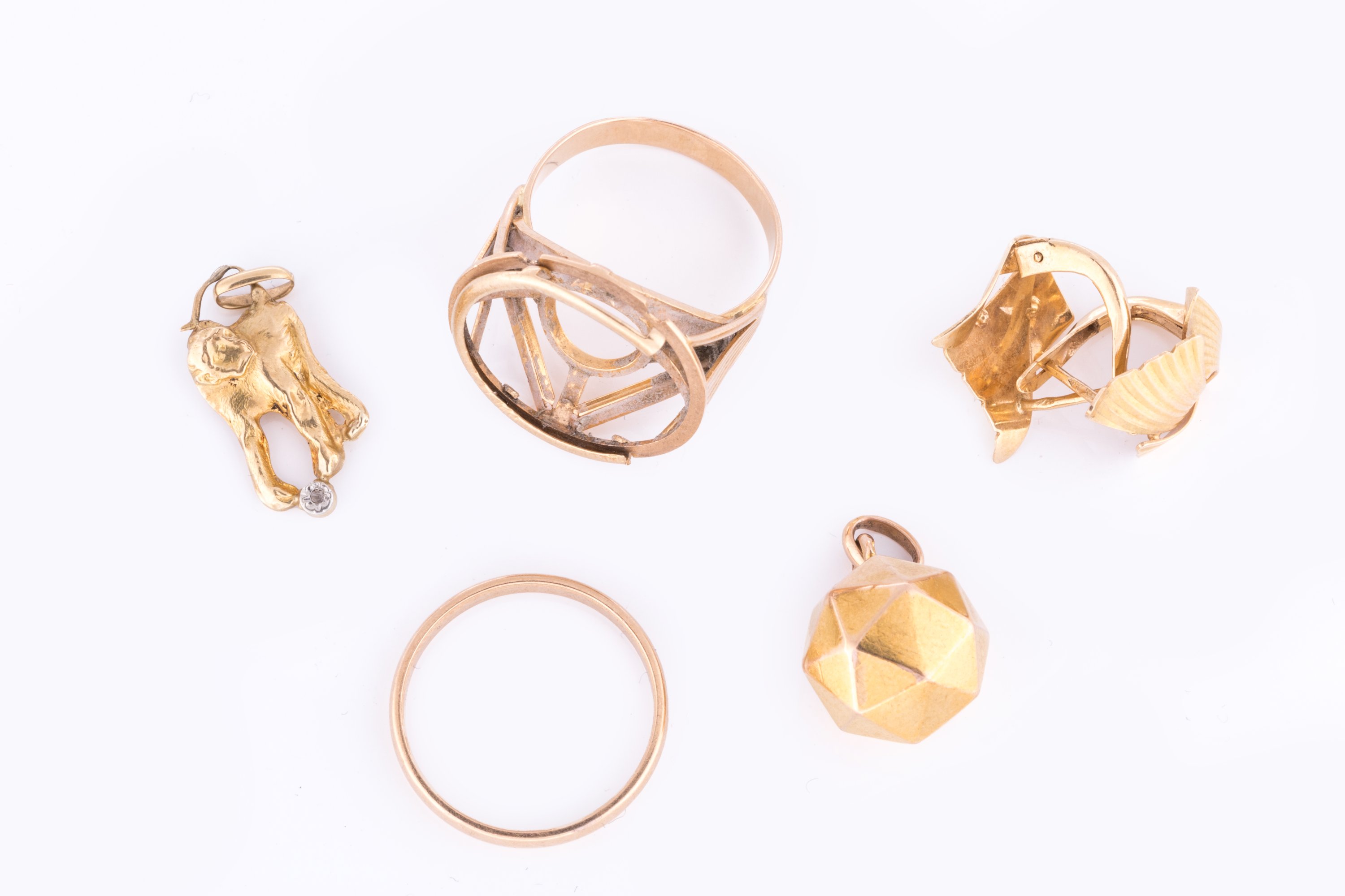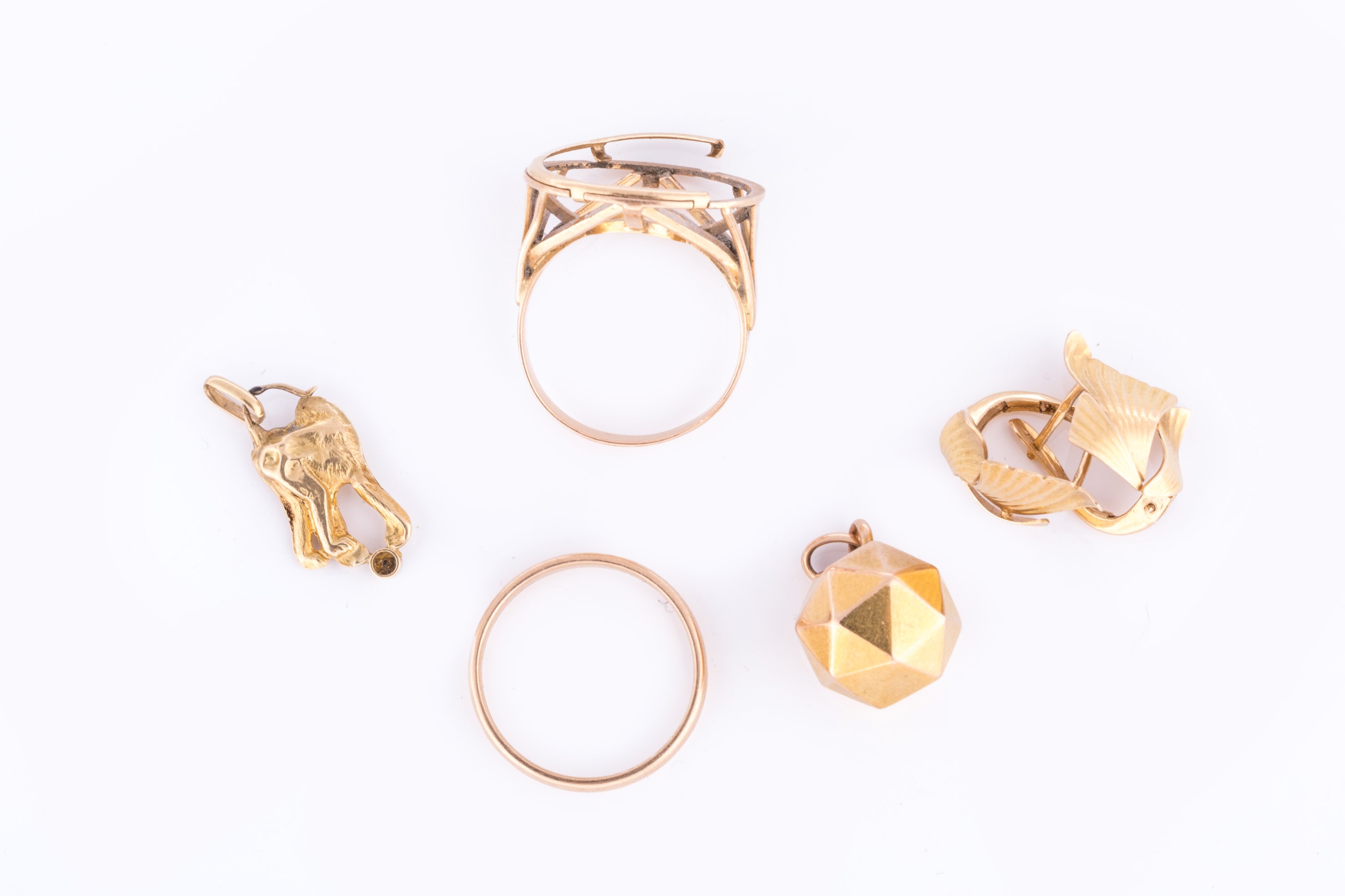 Un pendentif sphère, un pendentif "singe" serti d'une pierre blanche, une paire de boucles d'oreilles, une alliance et une monture de bague