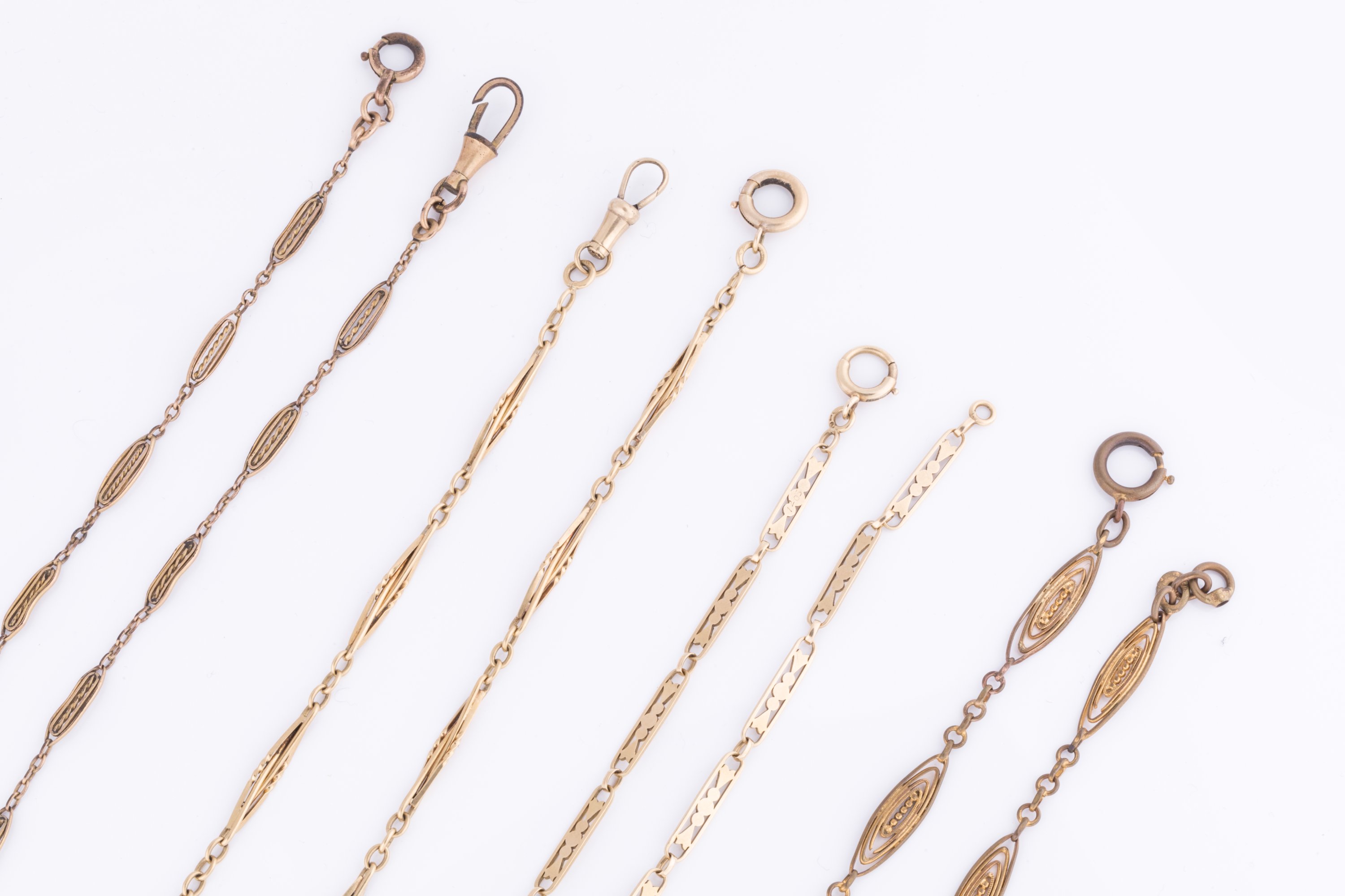 Jointes: deux chaînes de montre giletières, l'une en plaqué or à mailles filigrane (Long. 38 cm), l'autre en métal doré à mailles stylisées (Long. 34 cm).