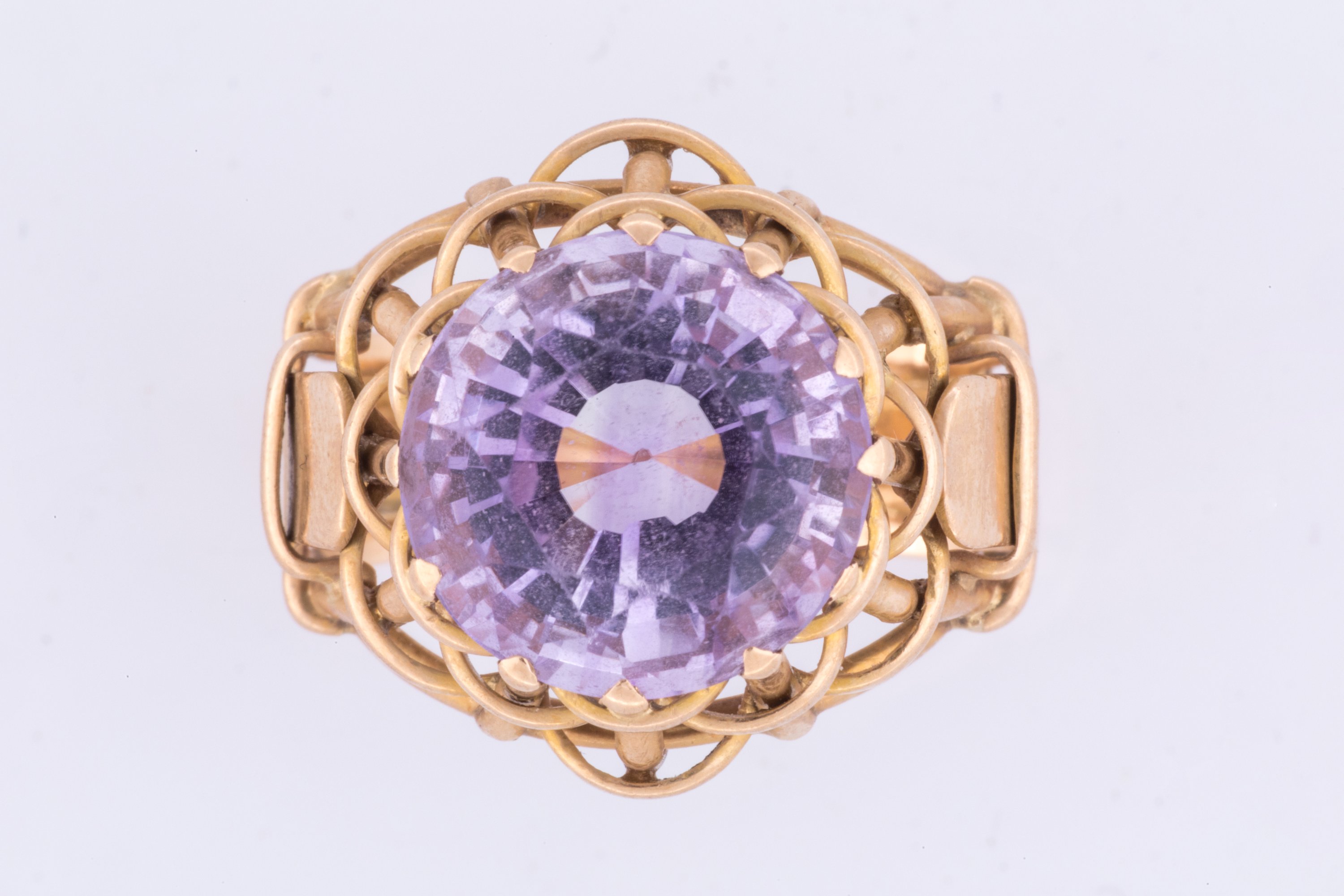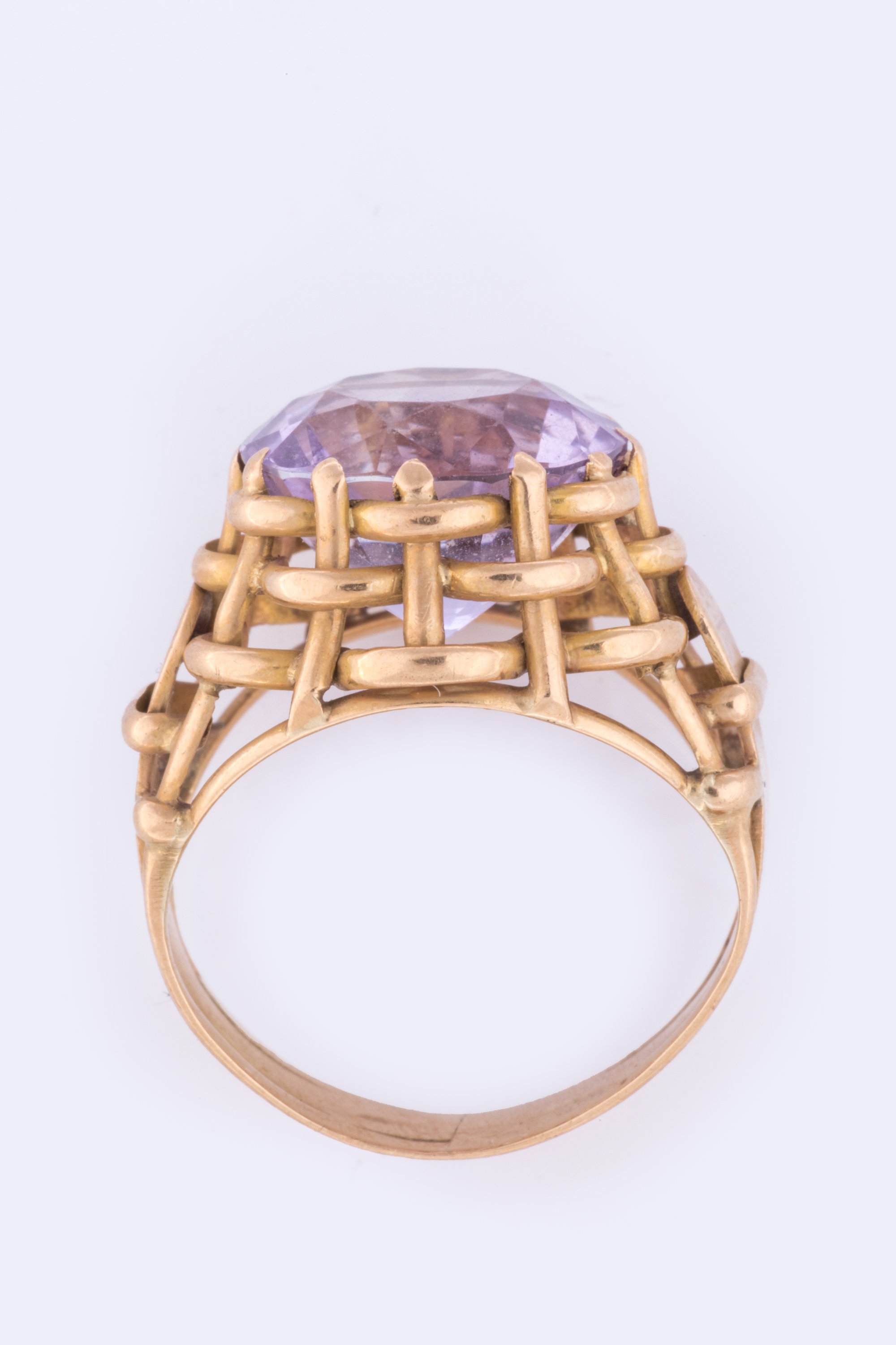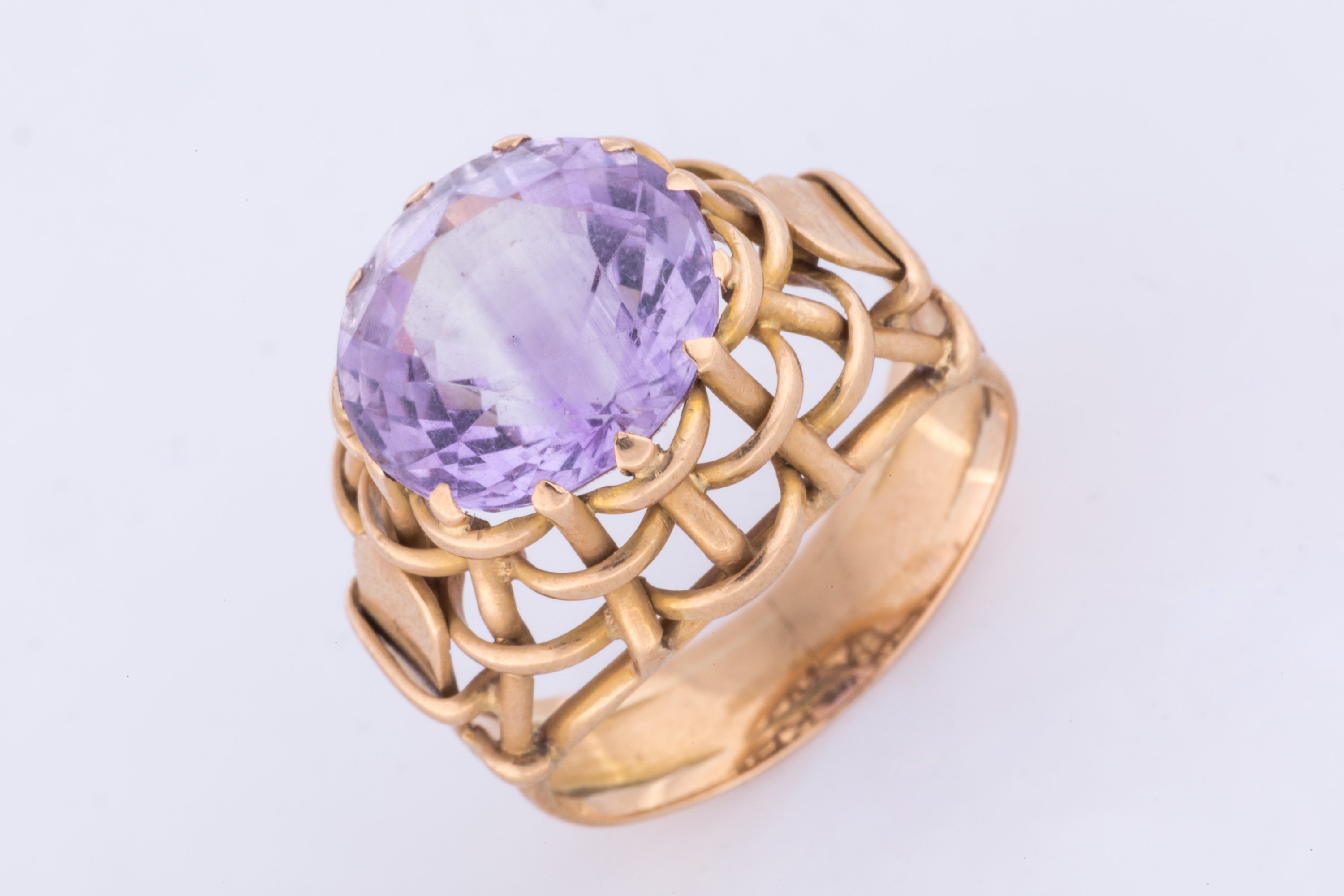 en or jaune 750 millièmes, sertie d'une améthyste dans un motif de vannerie.