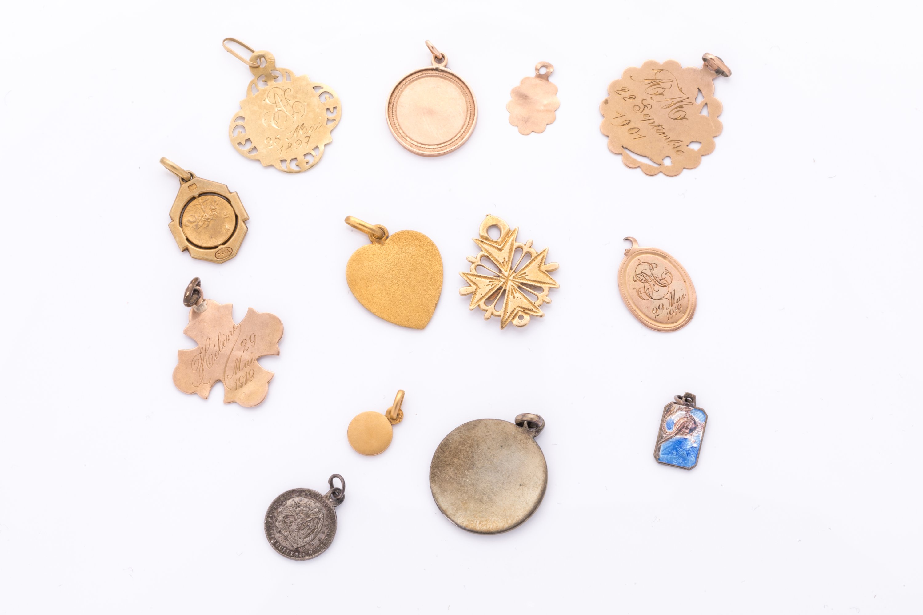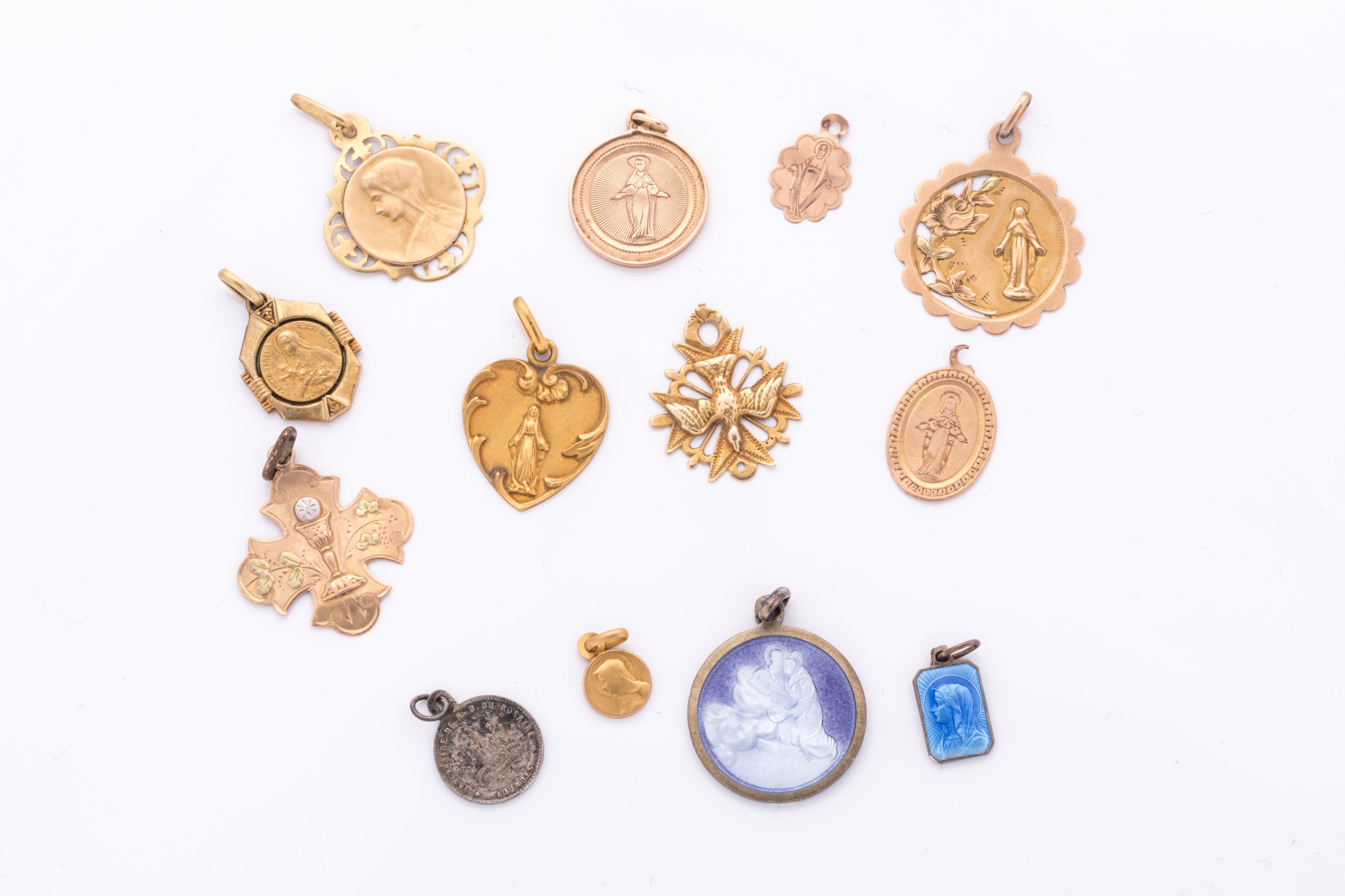 en or jaune 750 millièmes, six représentant la Vierge Marie, une figurant le Saint-Esprit et une à décor d'un calice.