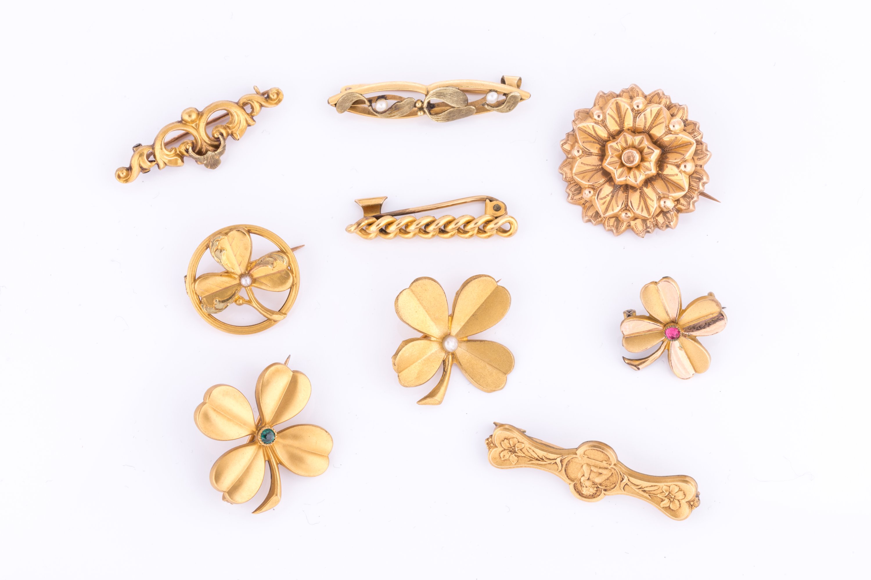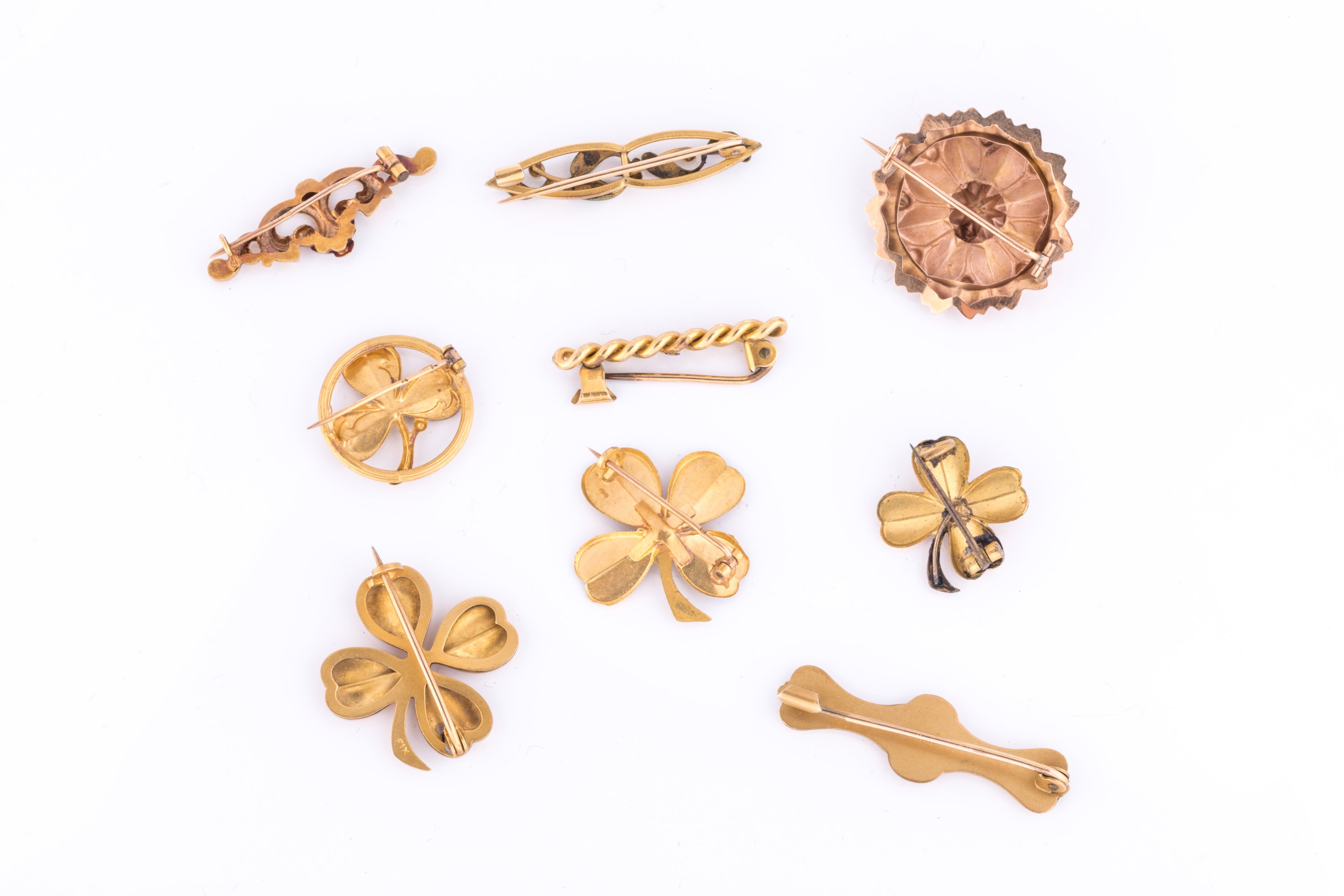 en or jaune 750 millièmes. Trois de forme barette à décor d'entrelacs ou motifs végétaux, quatre à motifs végétaux dont trois en forme de trèfle. Certaines serties de petites perles ou pierre.