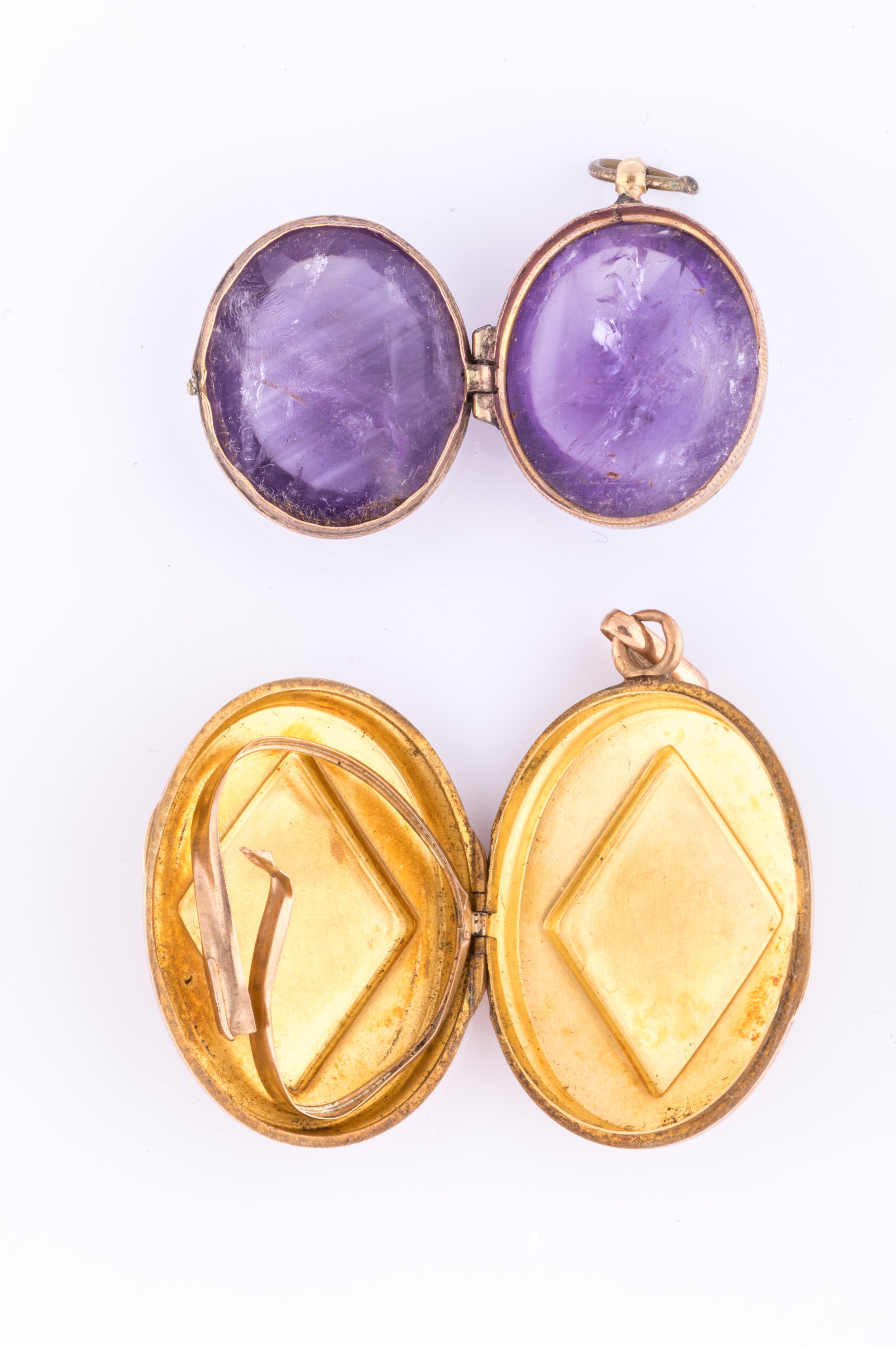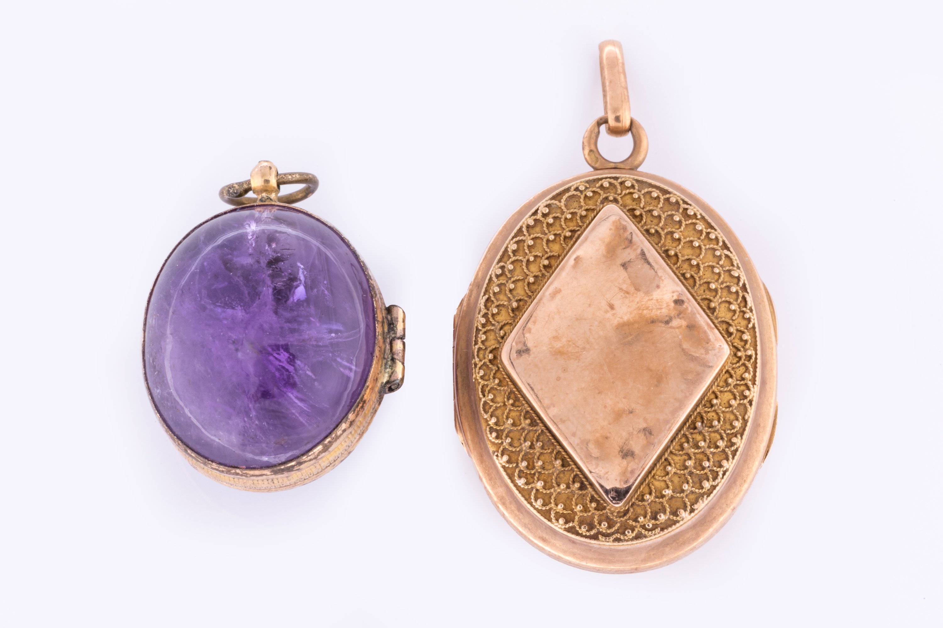 Joint: médaillon en métal doré et améthyste. Haut. 22 mm.