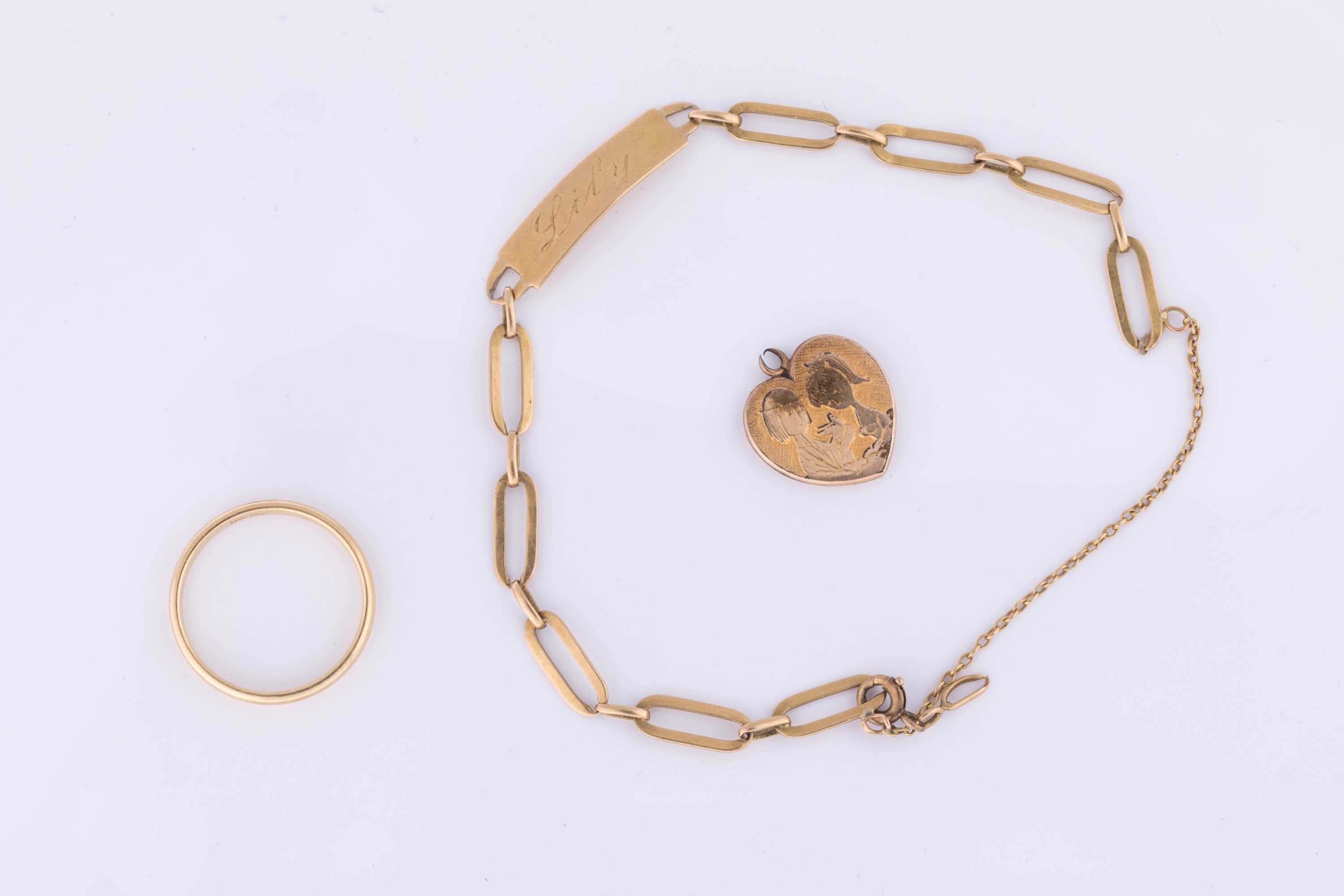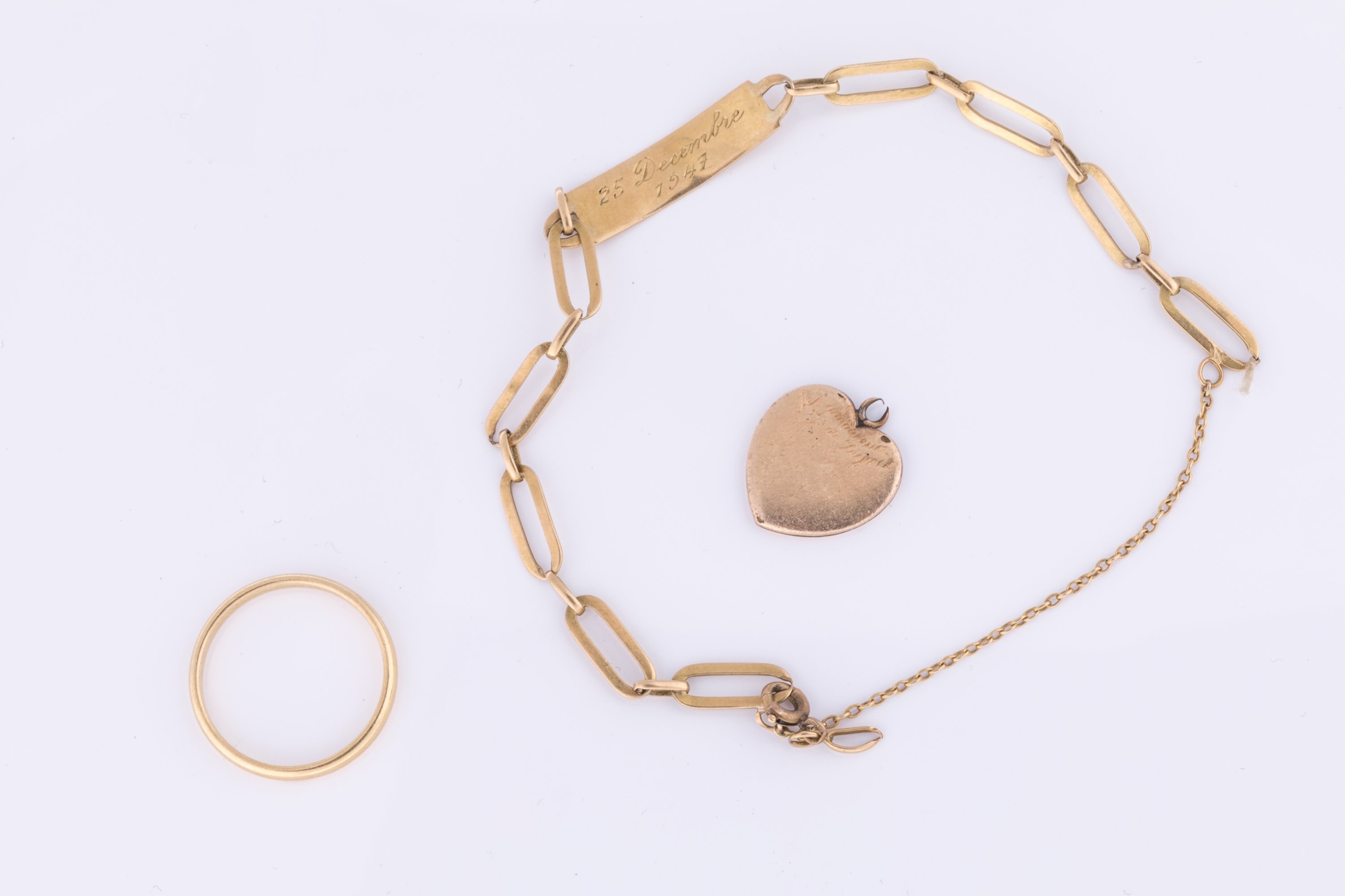 en or jaune 750 millièmes, gravée "Lily" sur une face et "25 Décembre 1947" sur l'autre. Chaînette de sécurité.