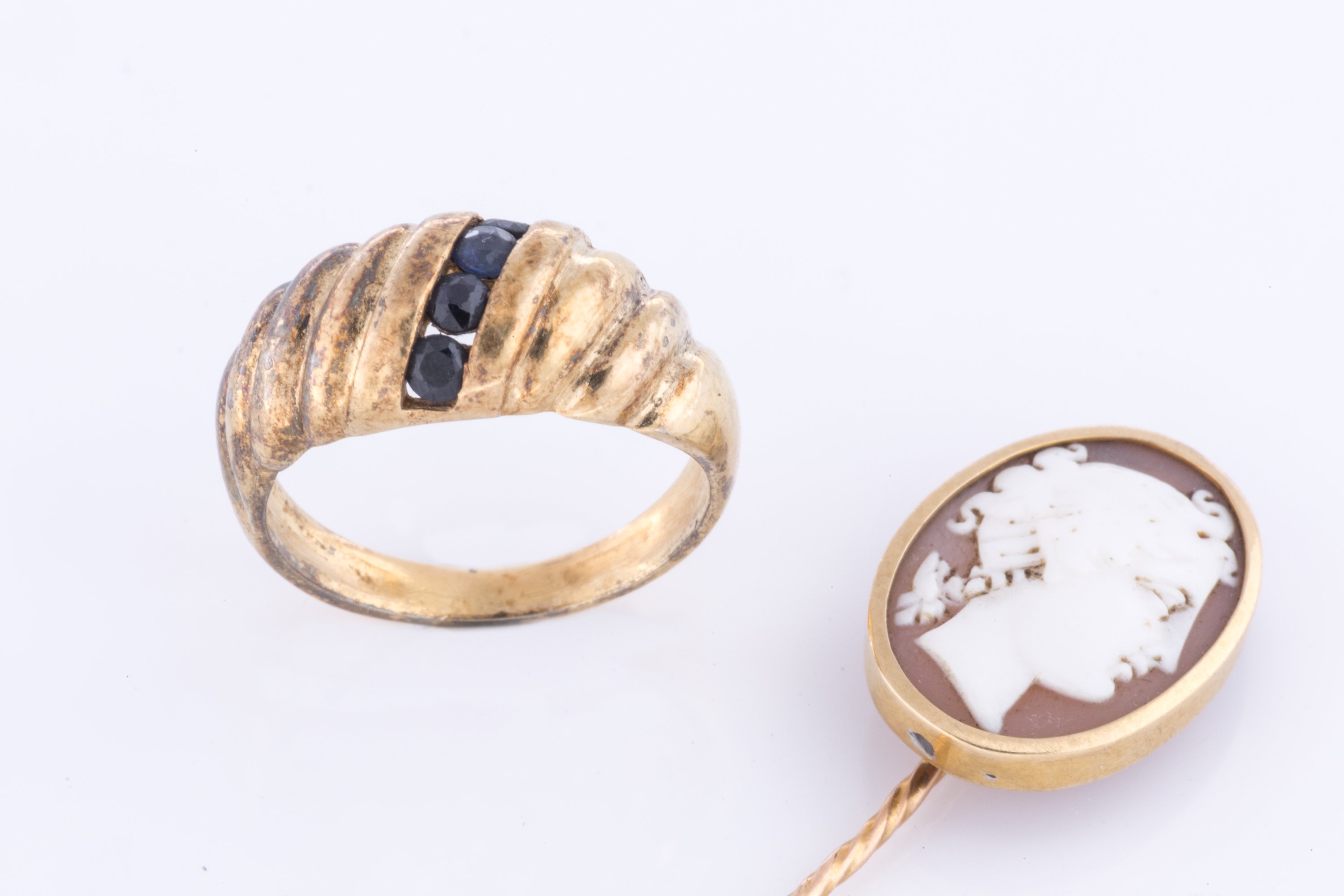 Jointe: une épingle de cravate en or jaune 750 millièmes sertie d'un camée coquille au portrait féminin de profil. Poids brut 2,4 g.