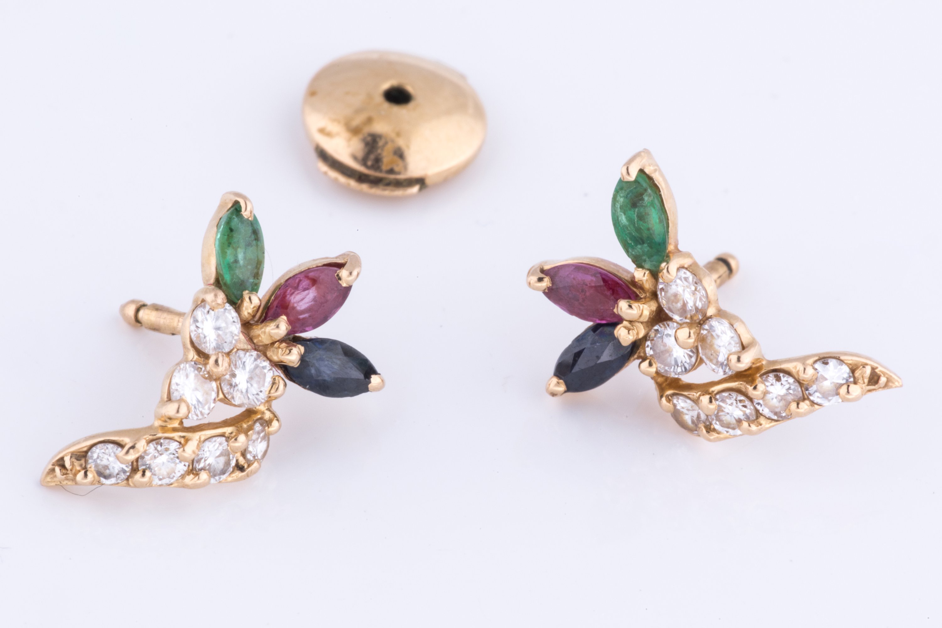 en or jaune 750 millièmes en forme de grappes de raisin, serties pour les feuilles d'un saphir, une émeraude et un rubis. Les grains sertis de brillants.