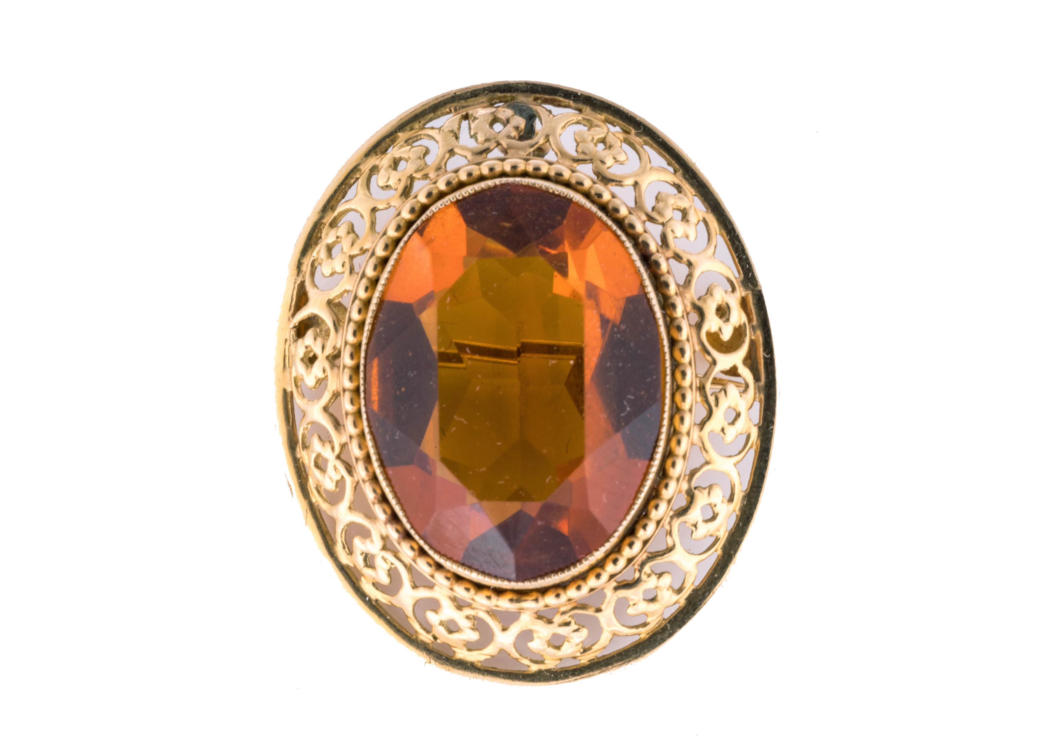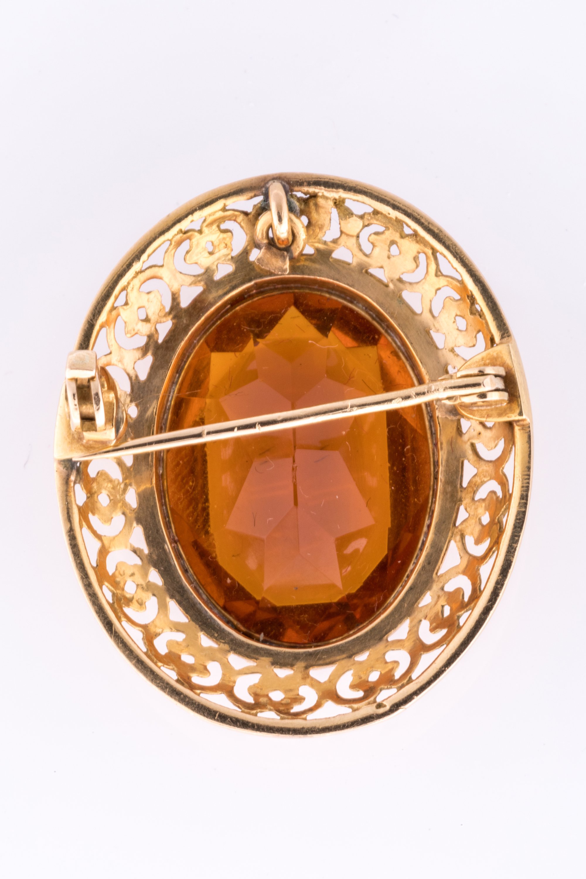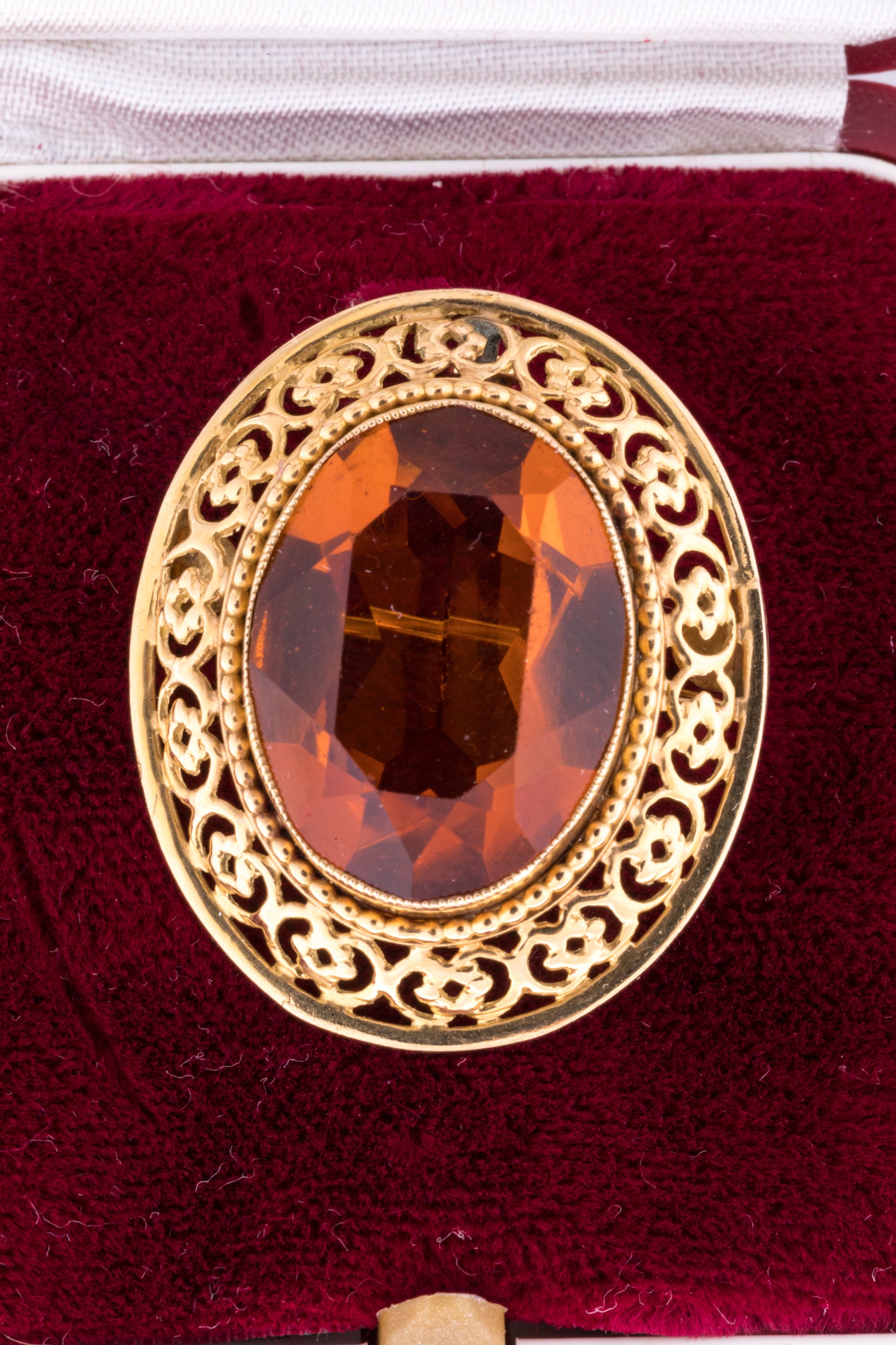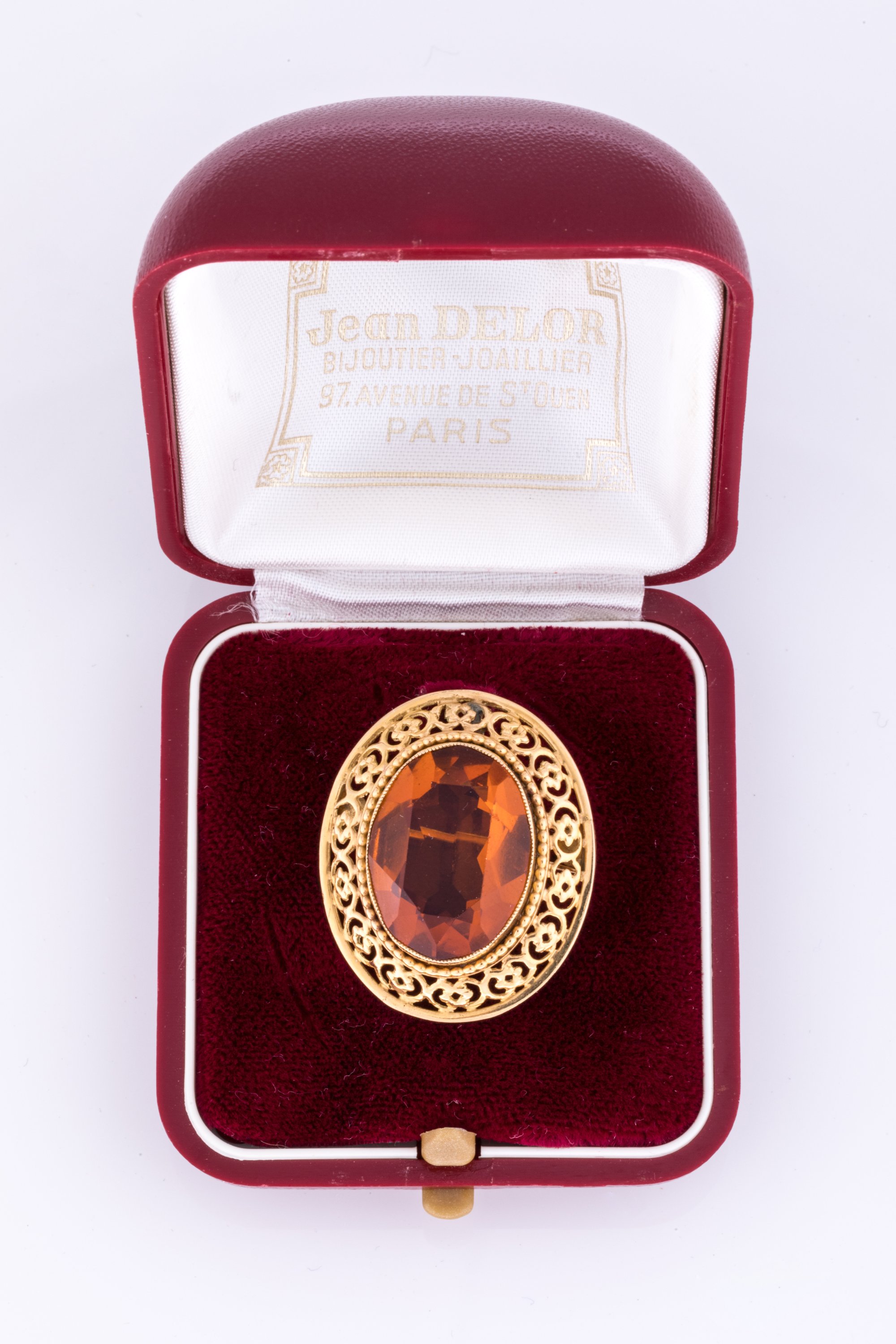 en or jaune 750 millièmes de forme ovale, à décor ajouré de rinceaux et sertie au centre d'une citrine.