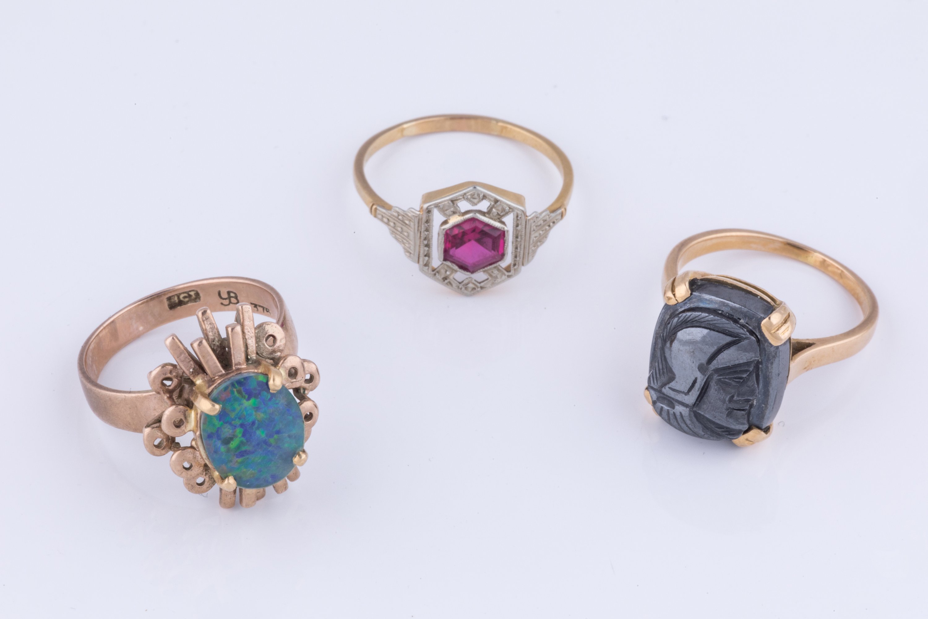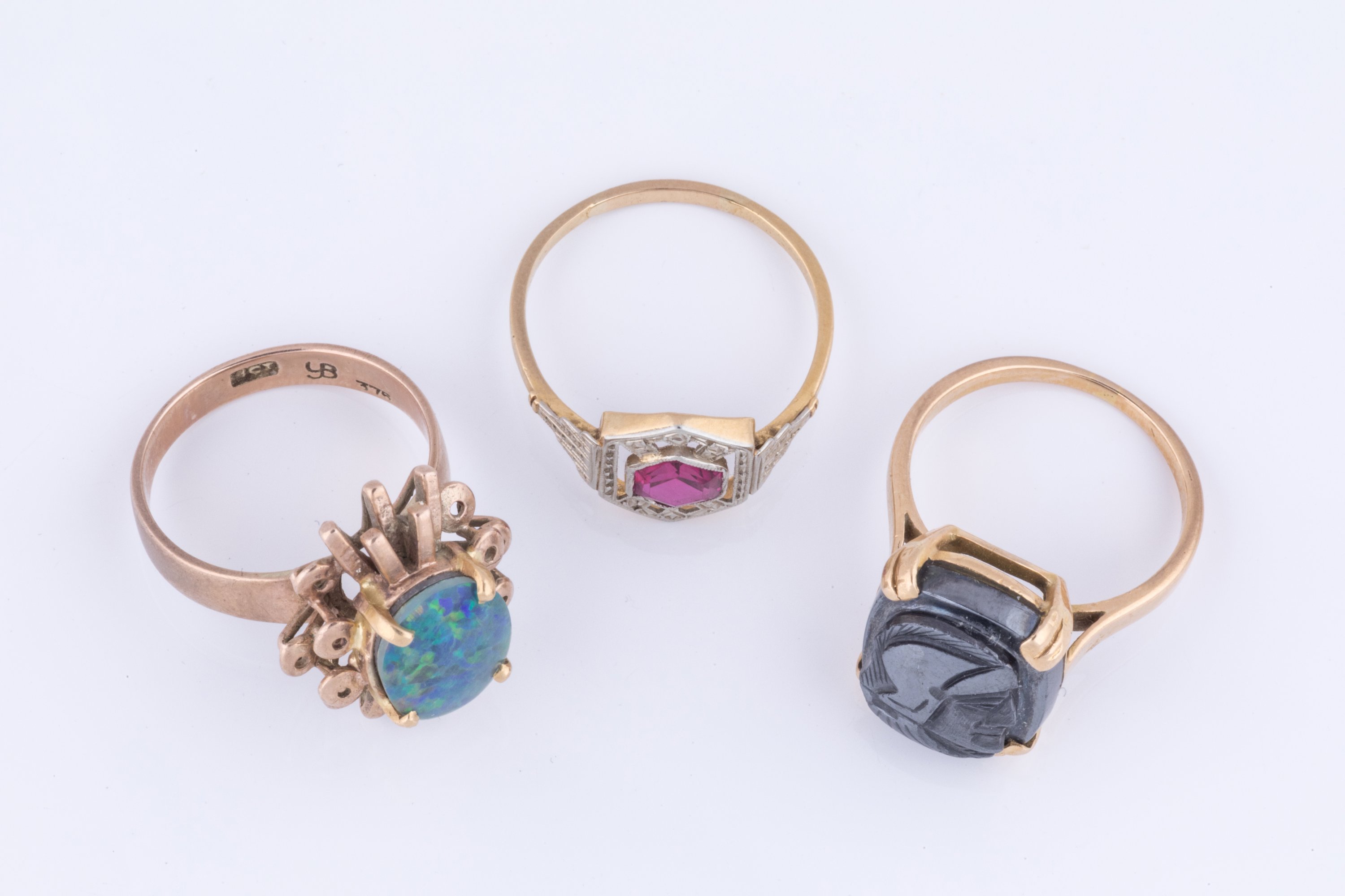 - La deuxième en or jaune et or gris 750 millièmes sertie d'une pierre rouge dans une monture Art déco.