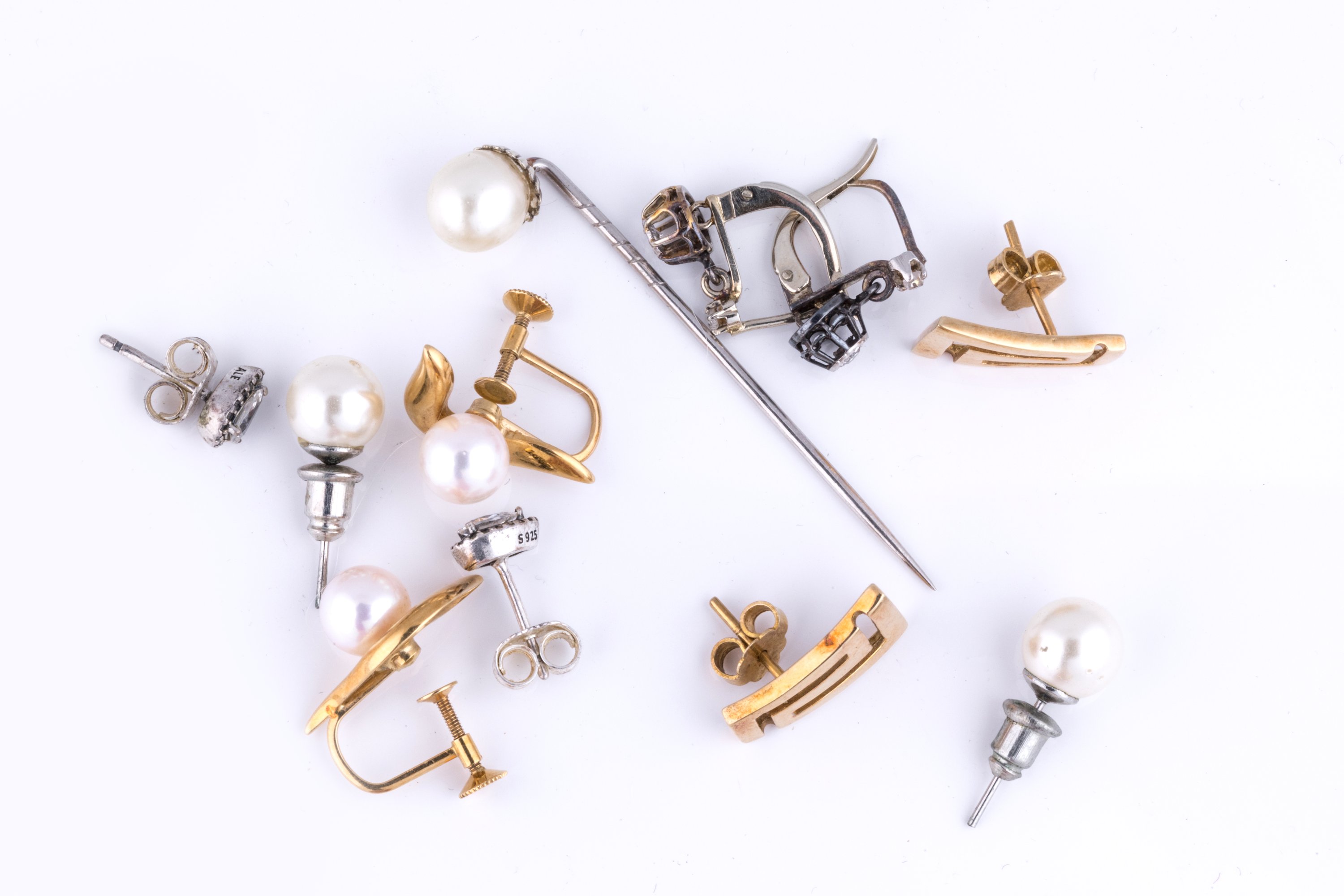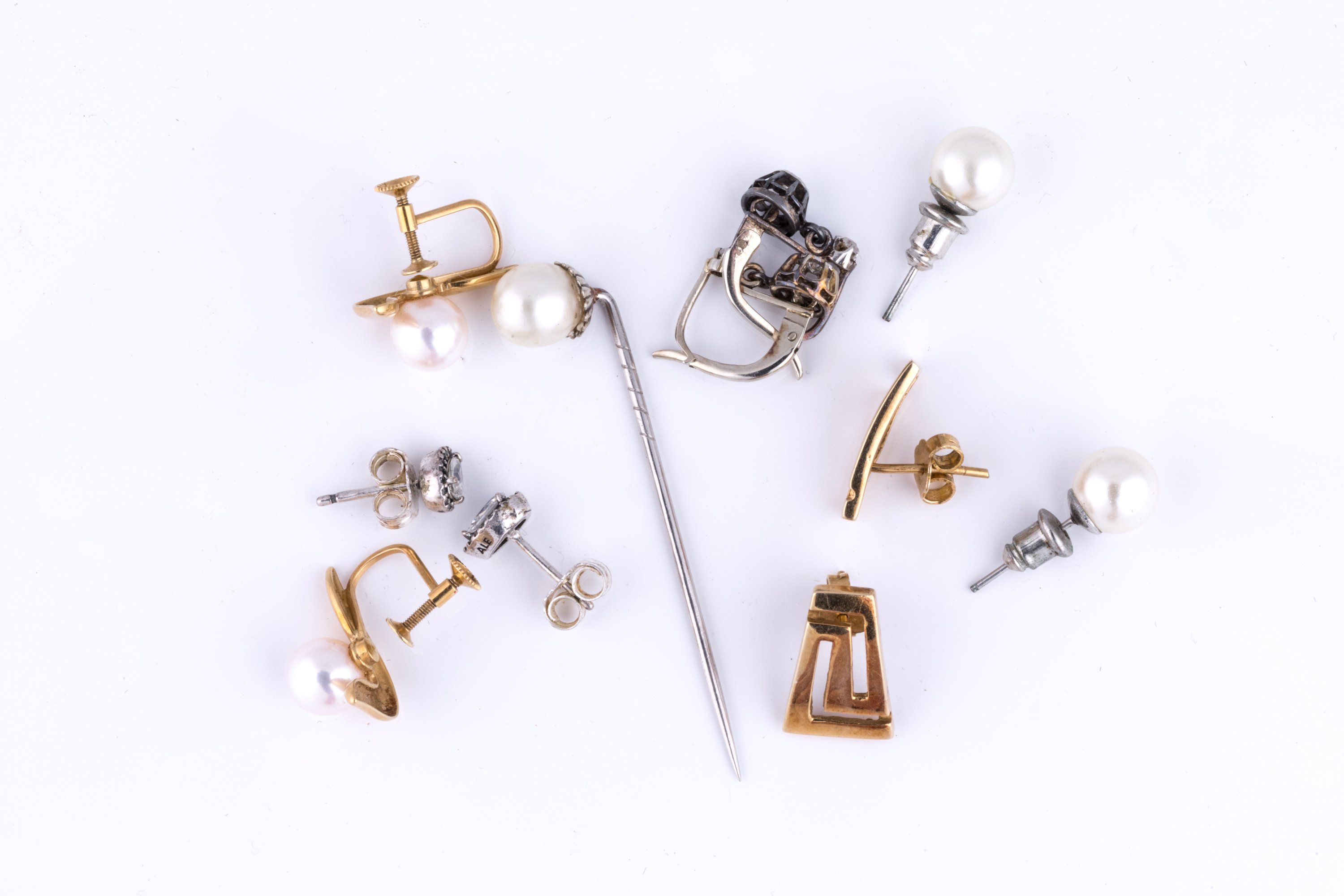 en or jaune ou gris 750 millièmes. Une paire de boucles ornée de perles, la seconde de diamants taillés en rose. L'épingle ornée d'une perle.