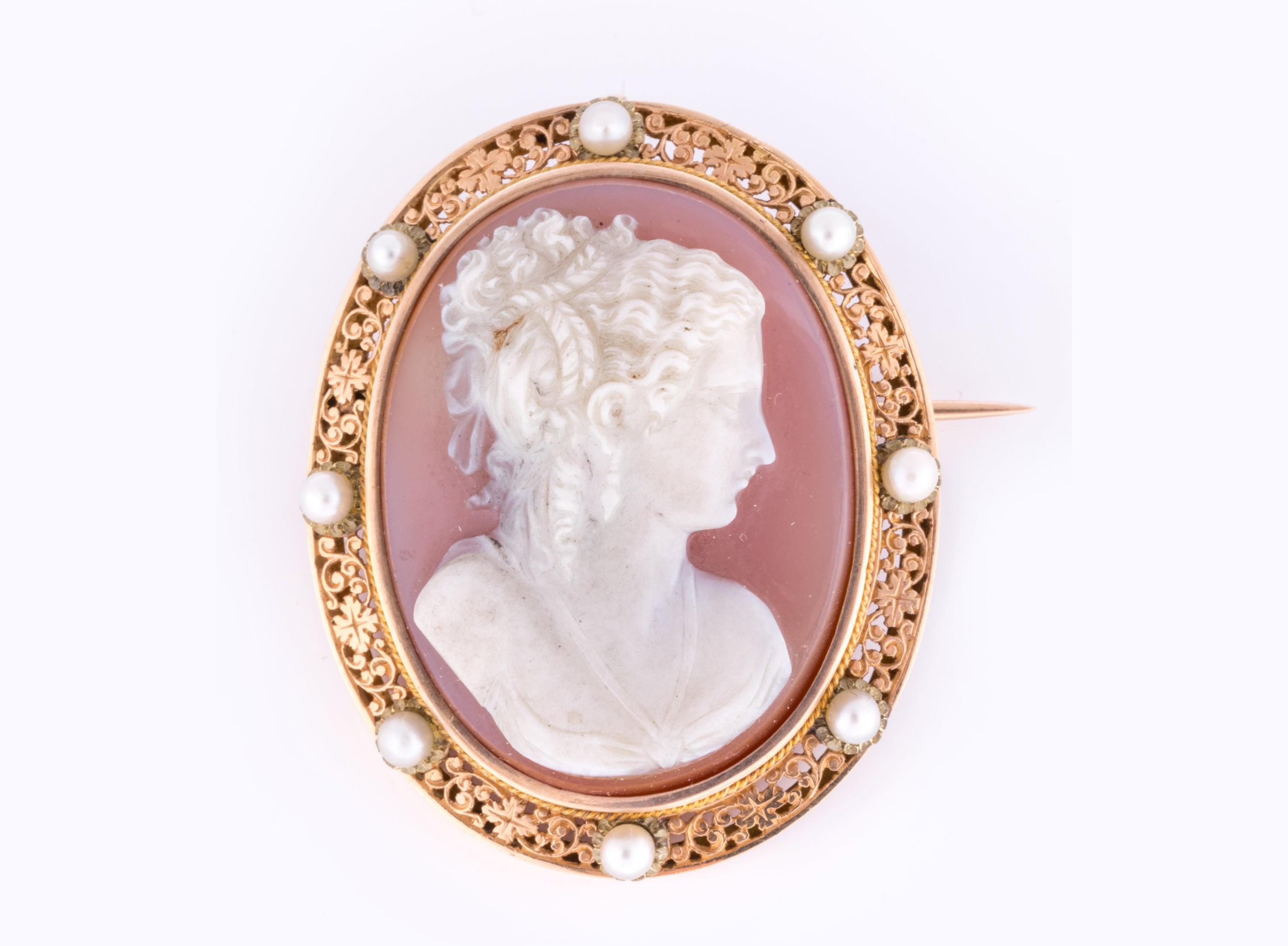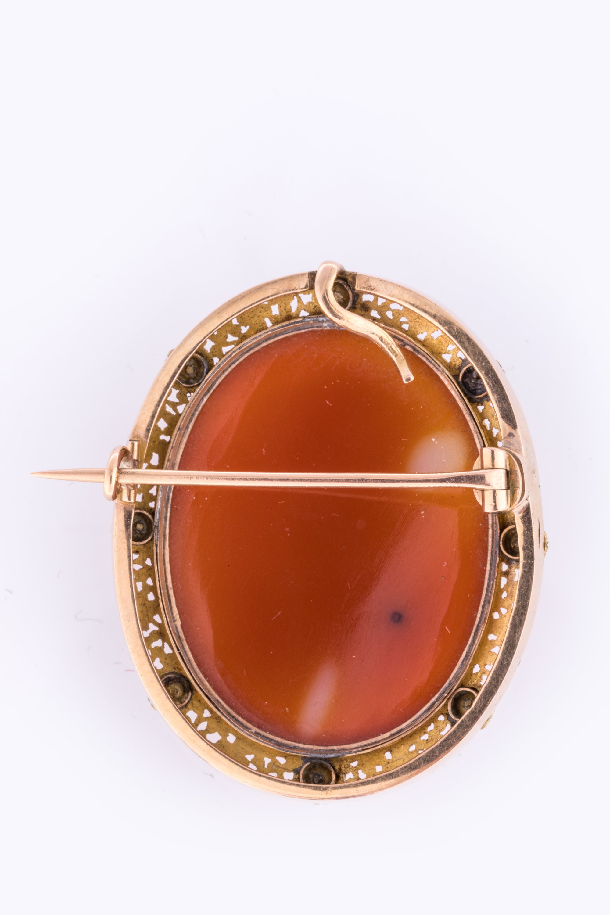 en or jaune 750 millièmes, ornée d'un camée en agate sculpté d'un profil de femme à l'antique tourné vers la droite, dans un entourage de huit semences de perles.