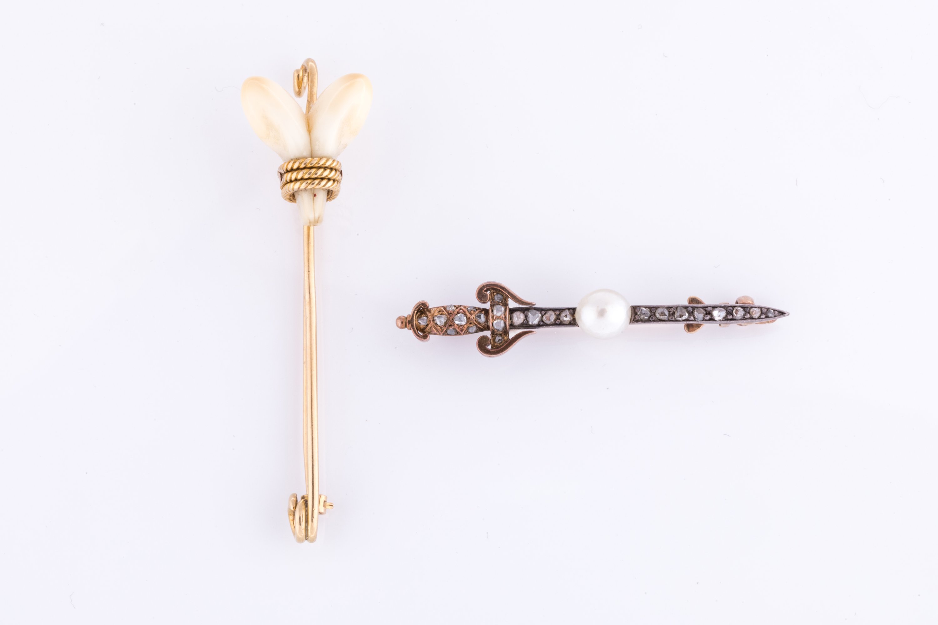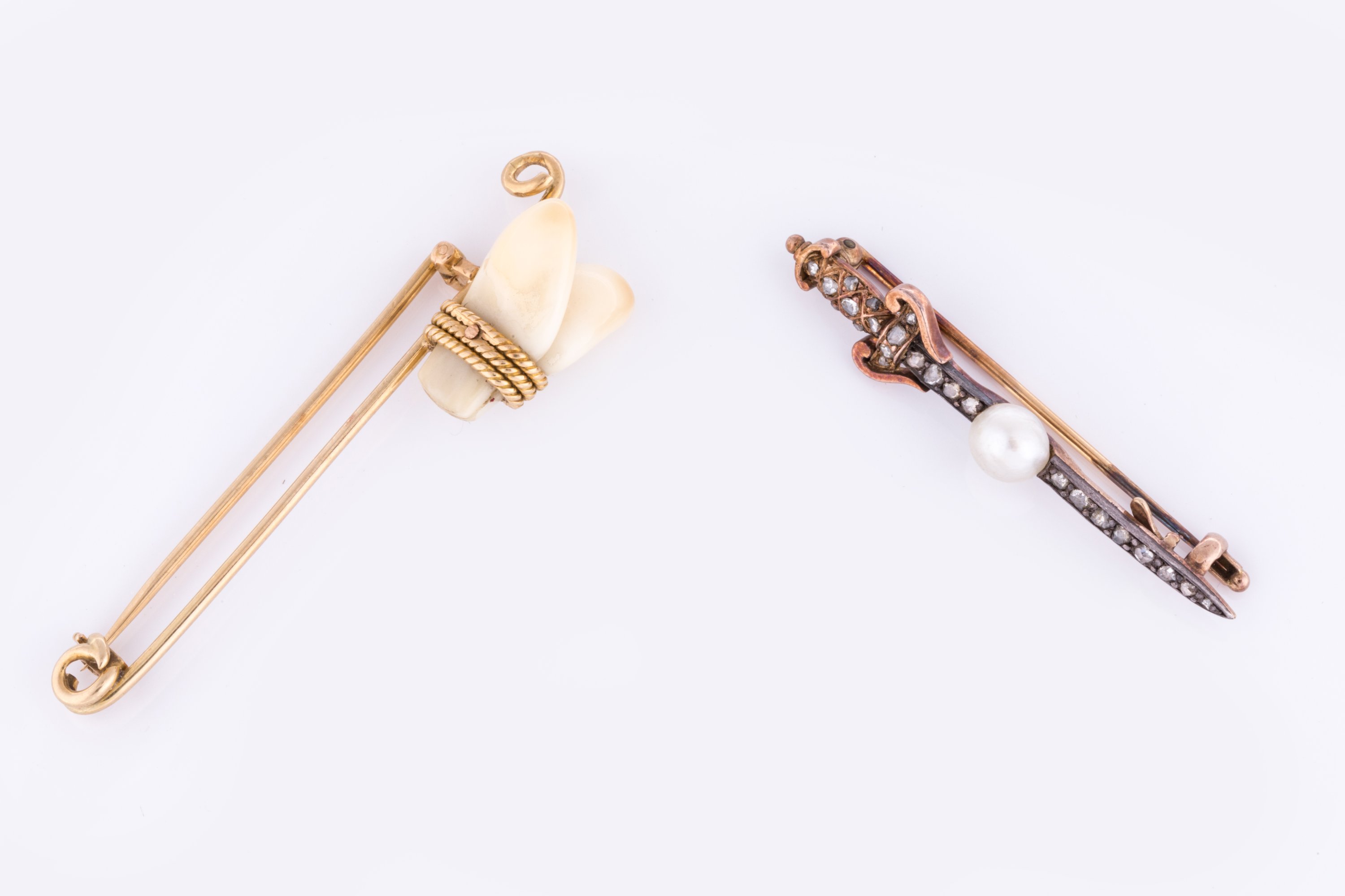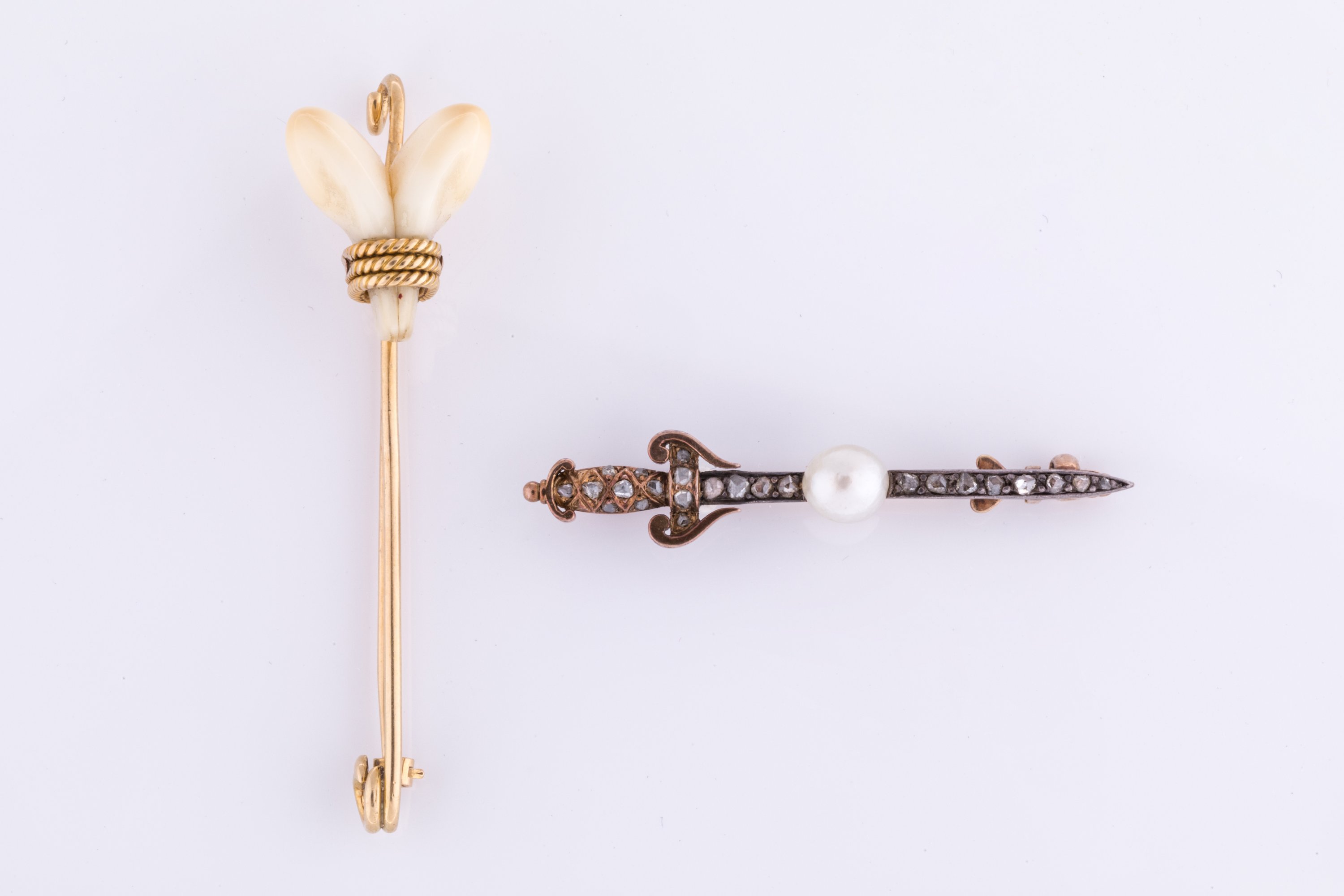 en or jaune 750 millièmes, l'une de vénerie, ornée d'un croc de cerf, l'autre en forme de glaive pavé de diamants avec une perle baroque.