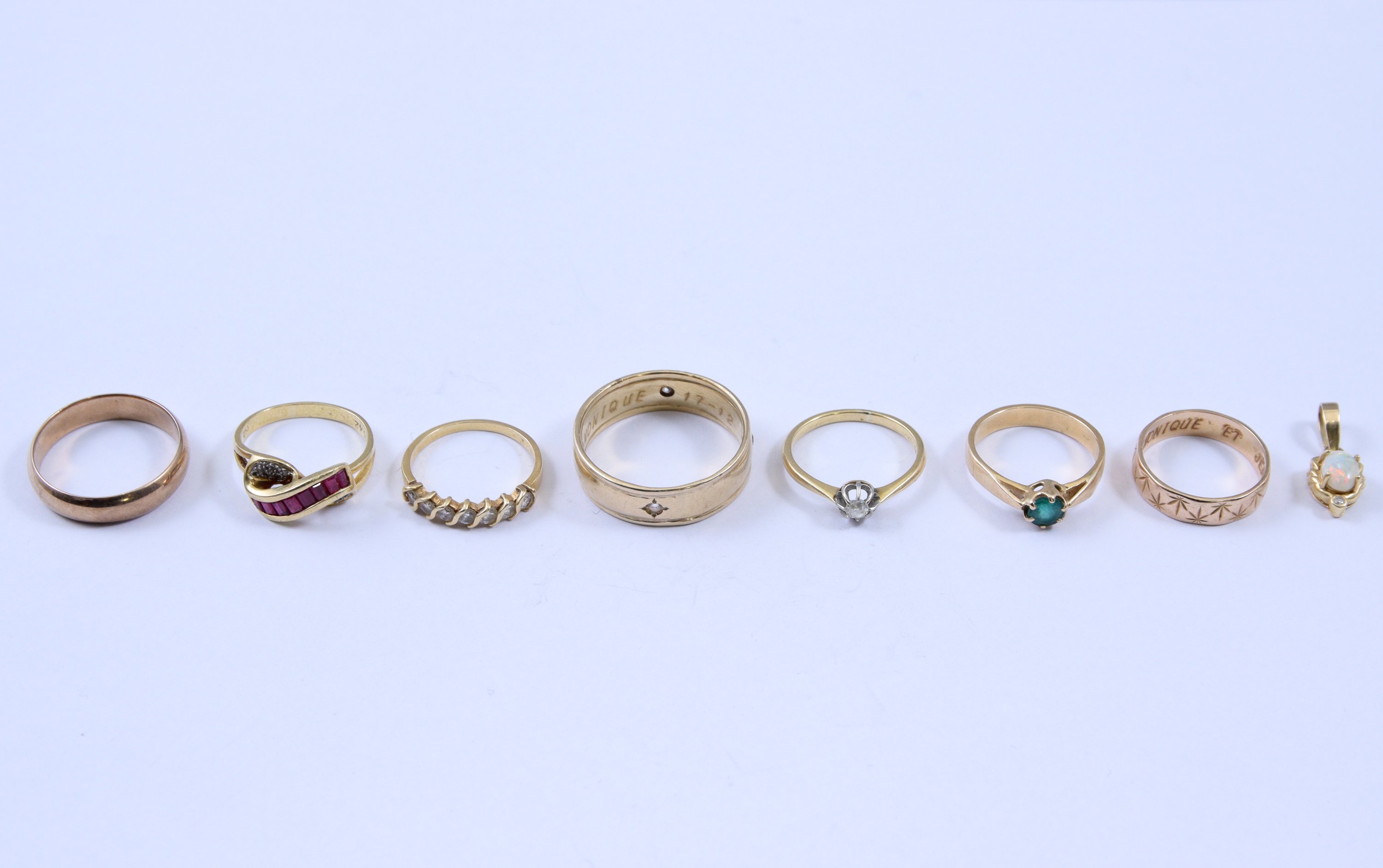 en or jaune 750 millièmes. La première sertie d'un diamant brillant d'environ 0,10 ct., la deuxième sertie de 7 petits diamants, la troisième sertie d'une émeraude, la quatrième en jonc, la cinquième pavée de rubis et le pendentif serti d'une opale.
