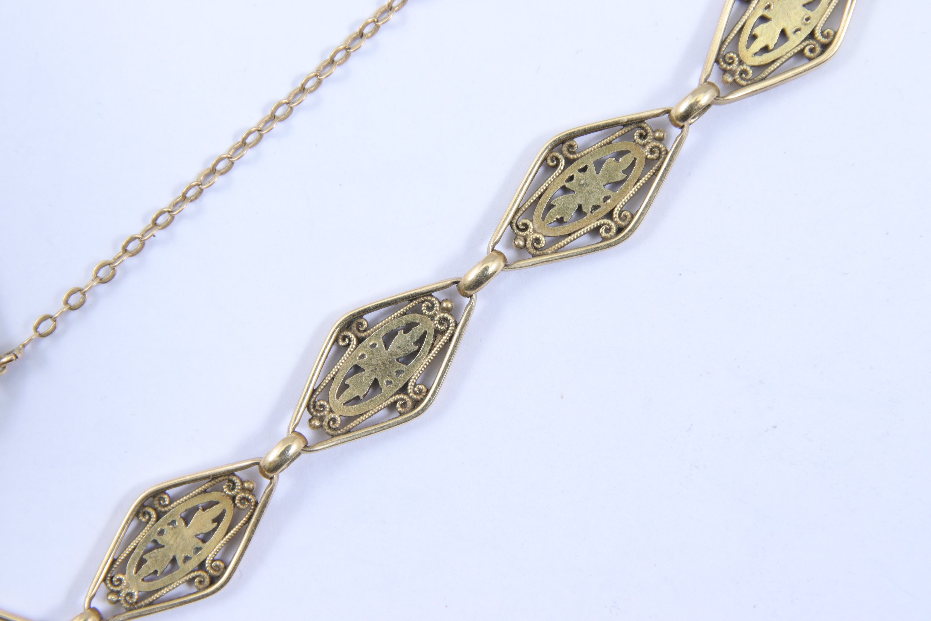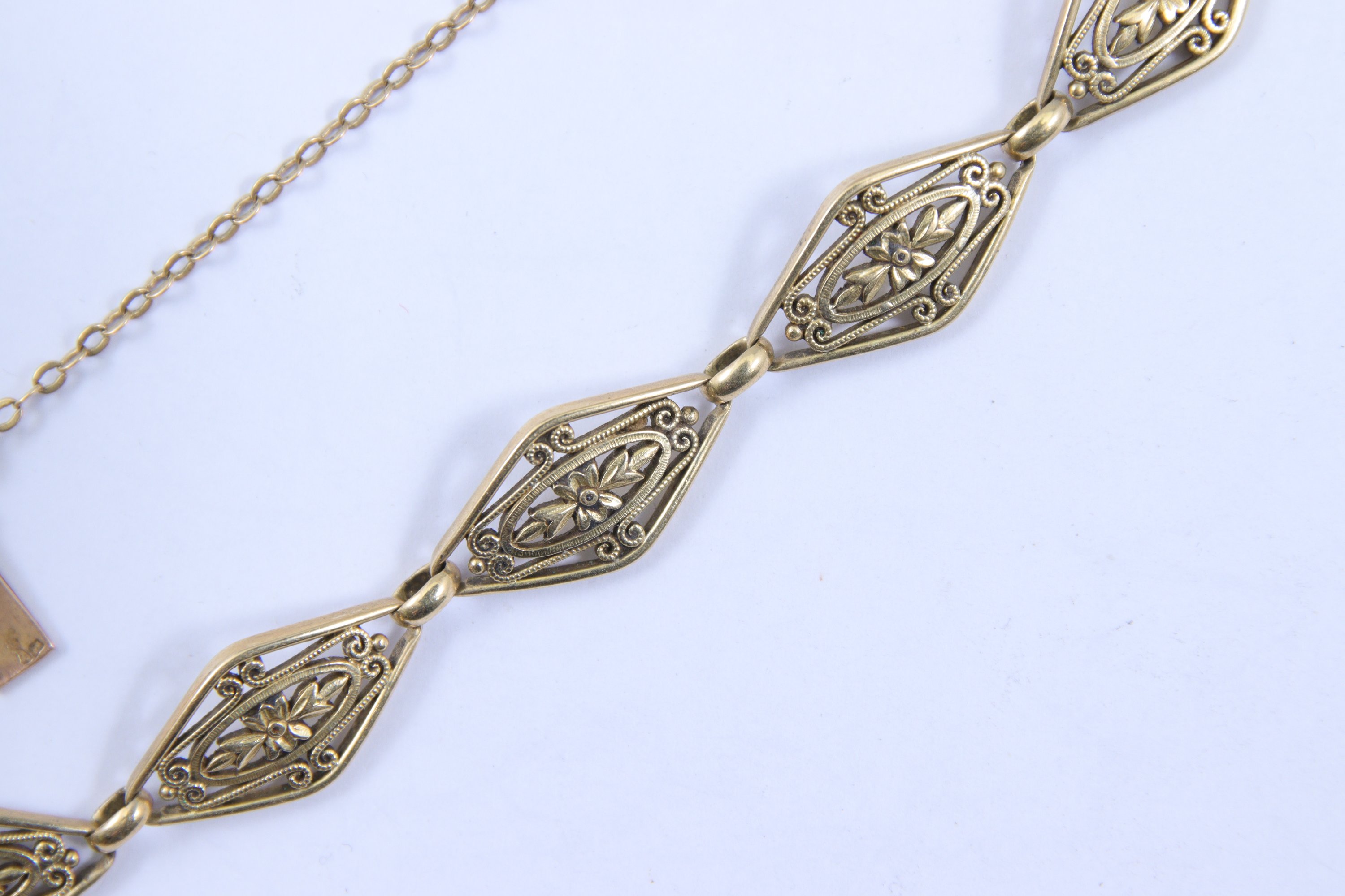 en or jaune 750 millièmes, à mailles losangées à décor d'enroulements et motifs floraux. Chaînette de sécurité.