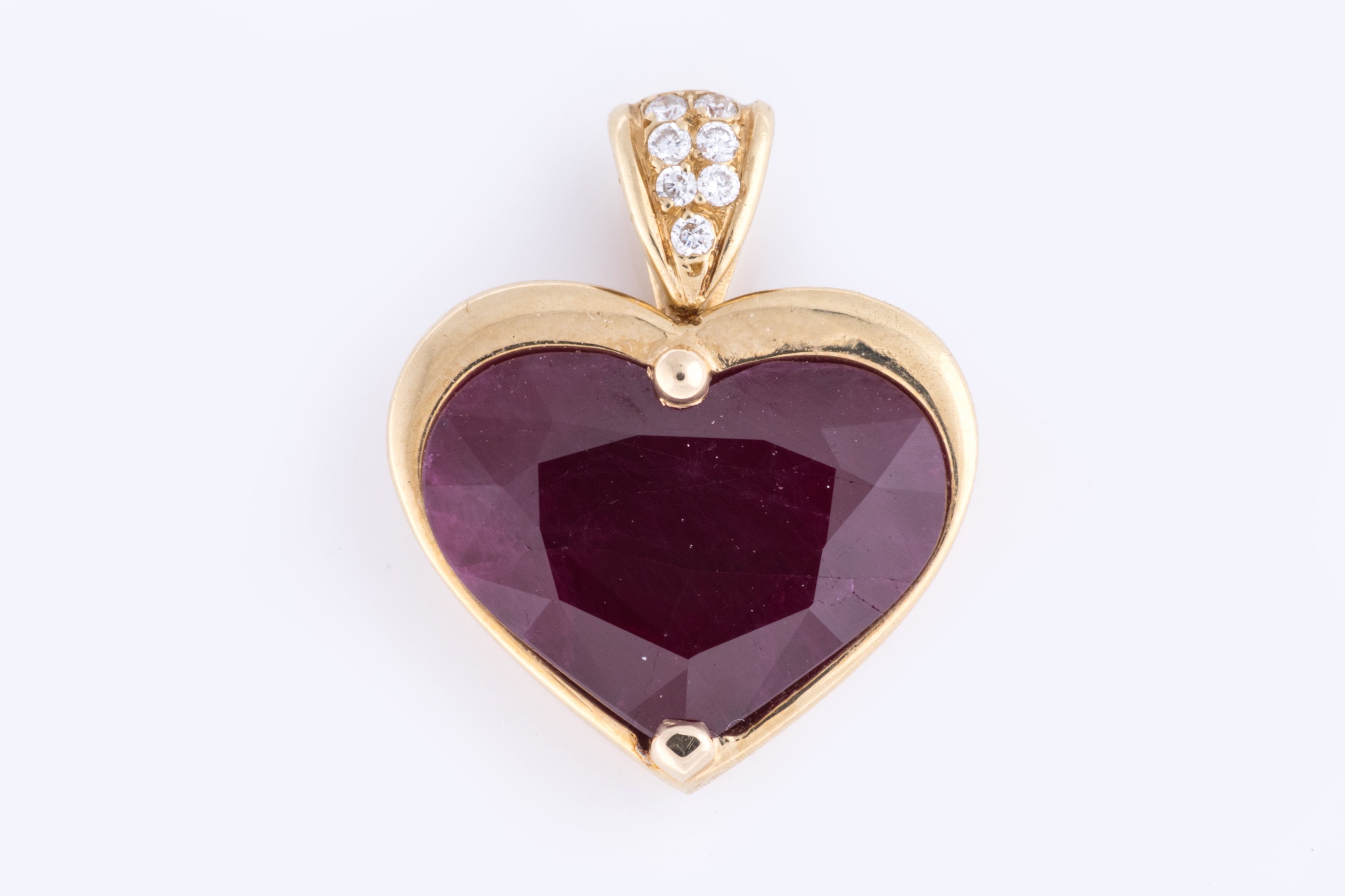 en or jaune 750 millièmes orné d'une pierre rouge taillée en coeur (rubis?), la bélière ornée de sept petits diamants.