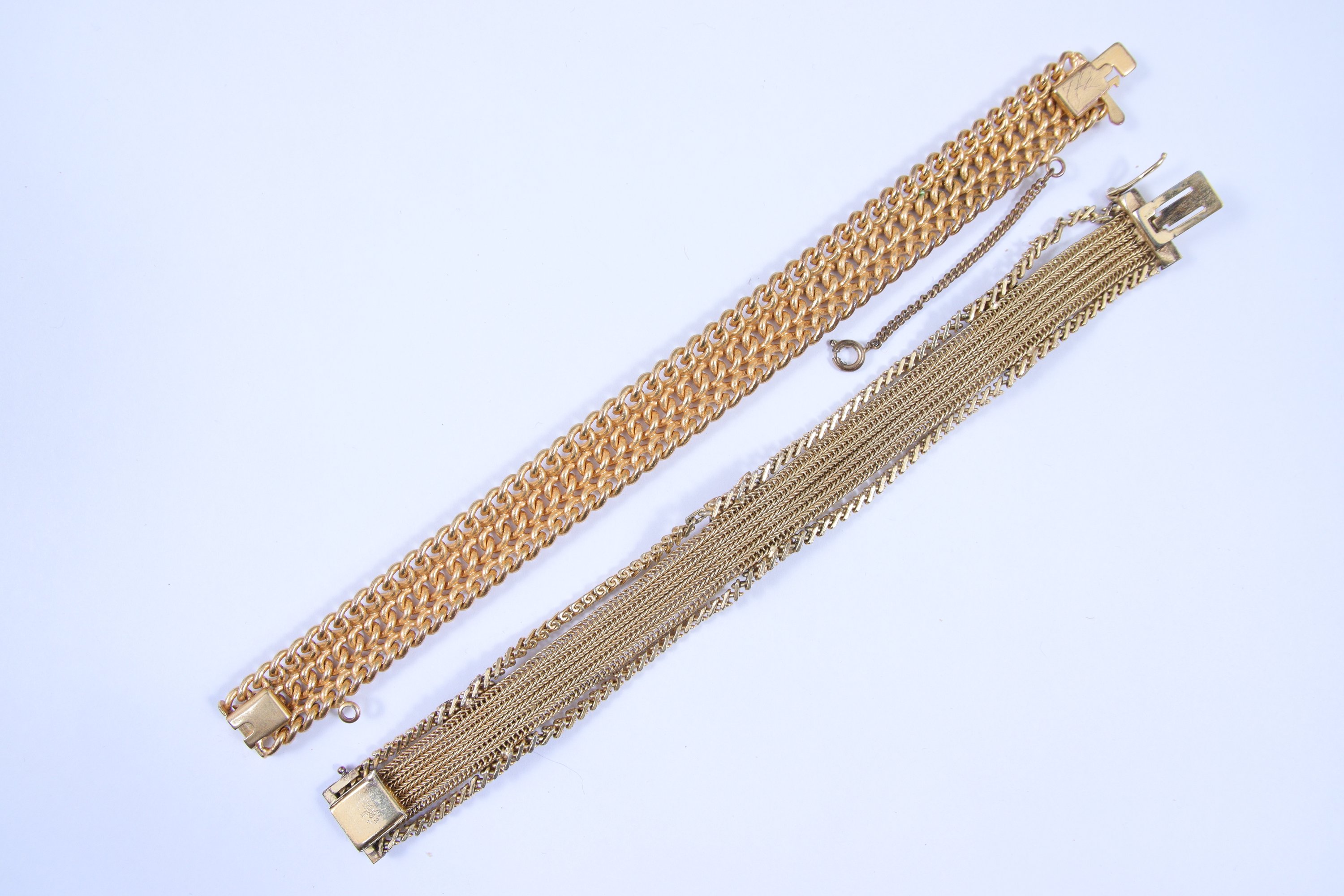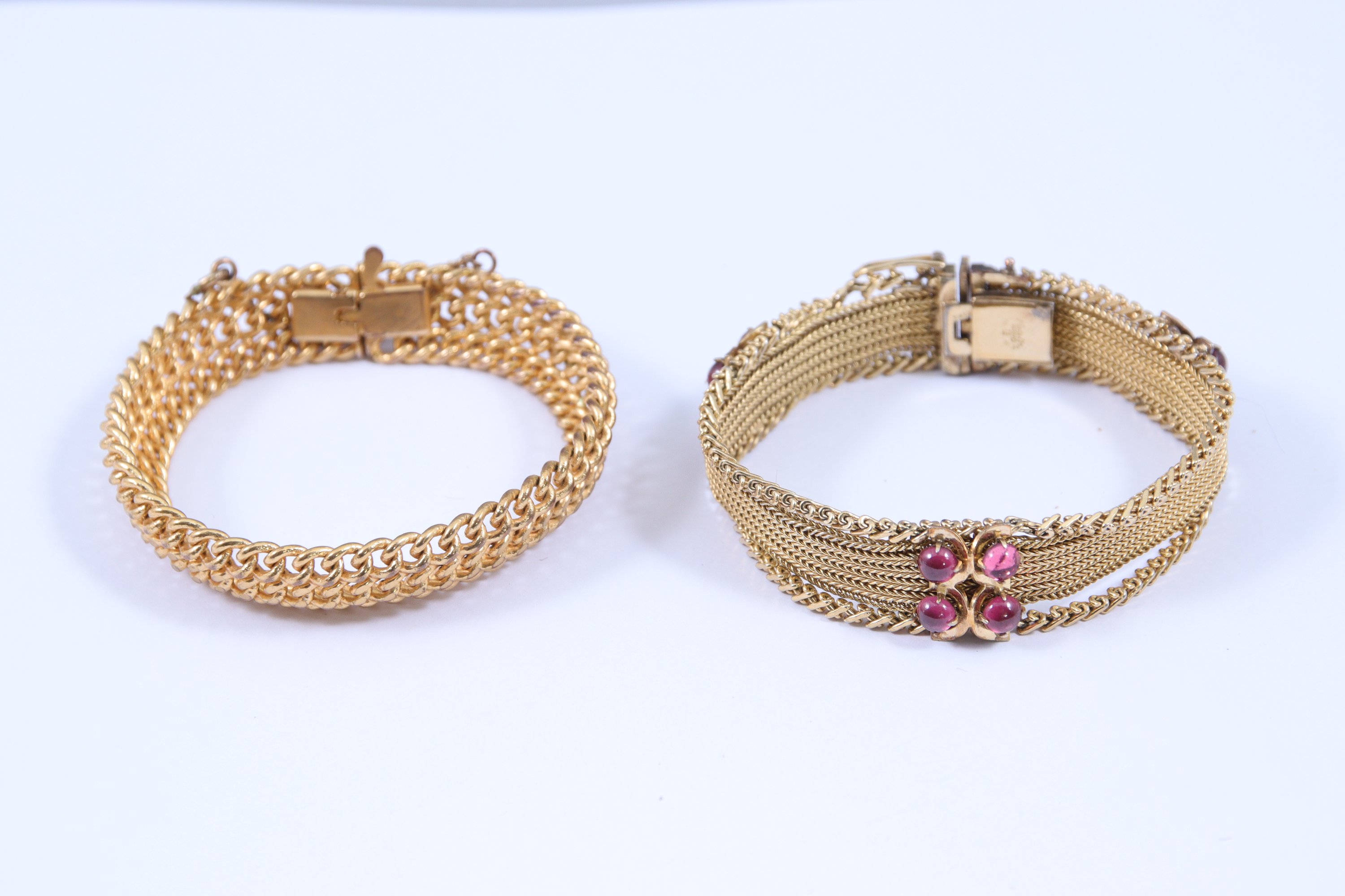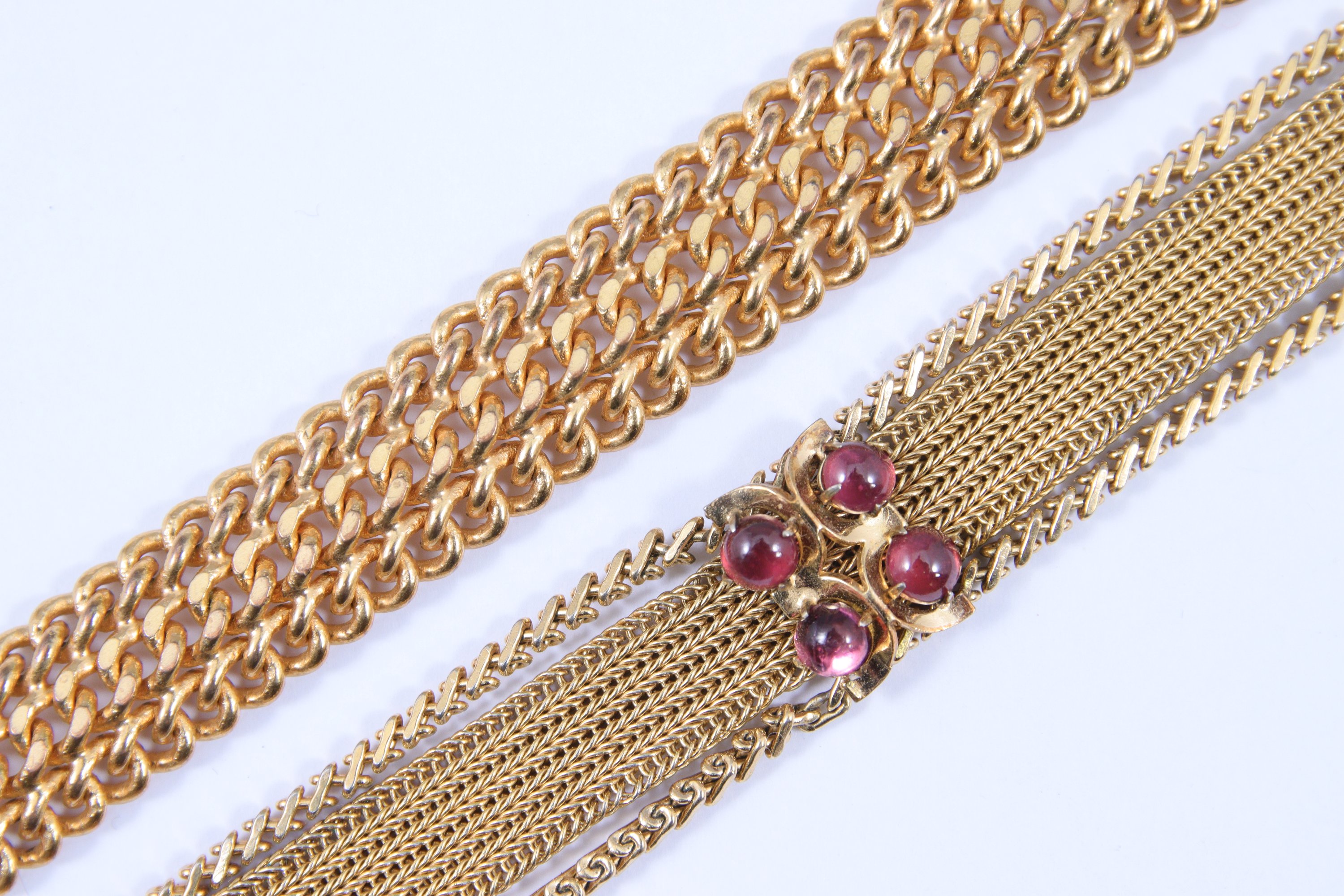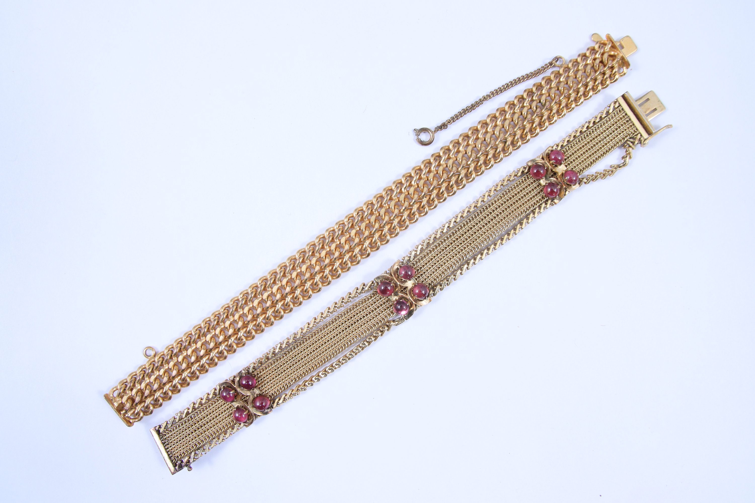 en métal doré. L'un à mailles américaines, le second serti de grenat en cabochon.