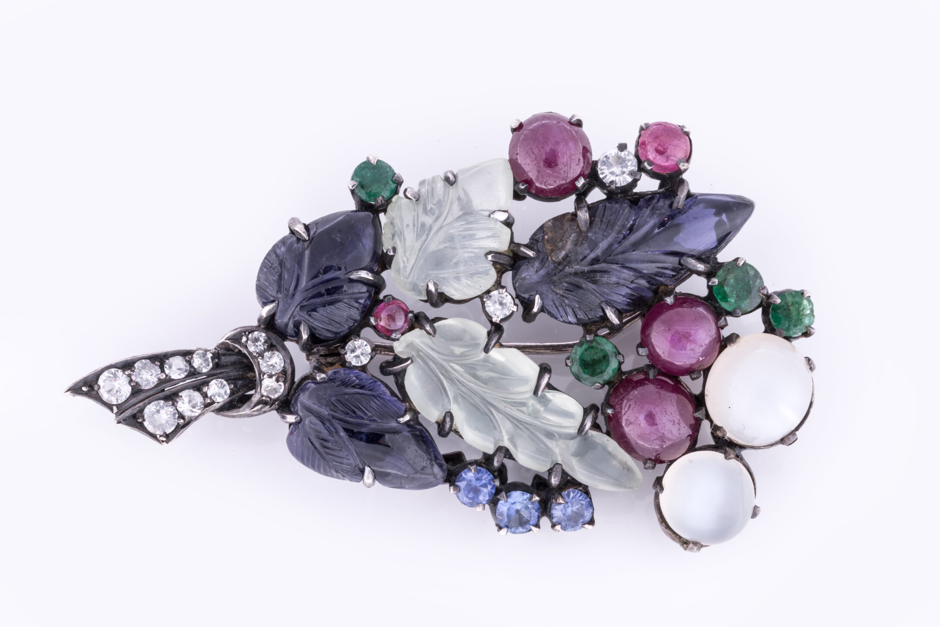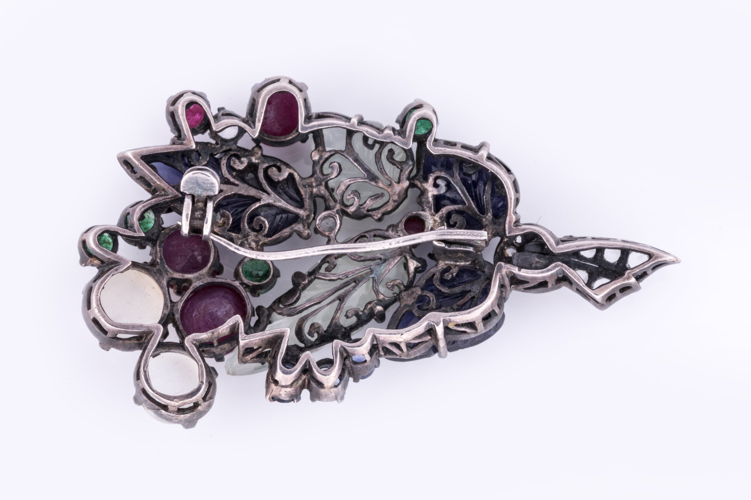 en argent 800 millièmes, sertie de pierres de couleur, cristaux de roche et pierres du Rhin.
