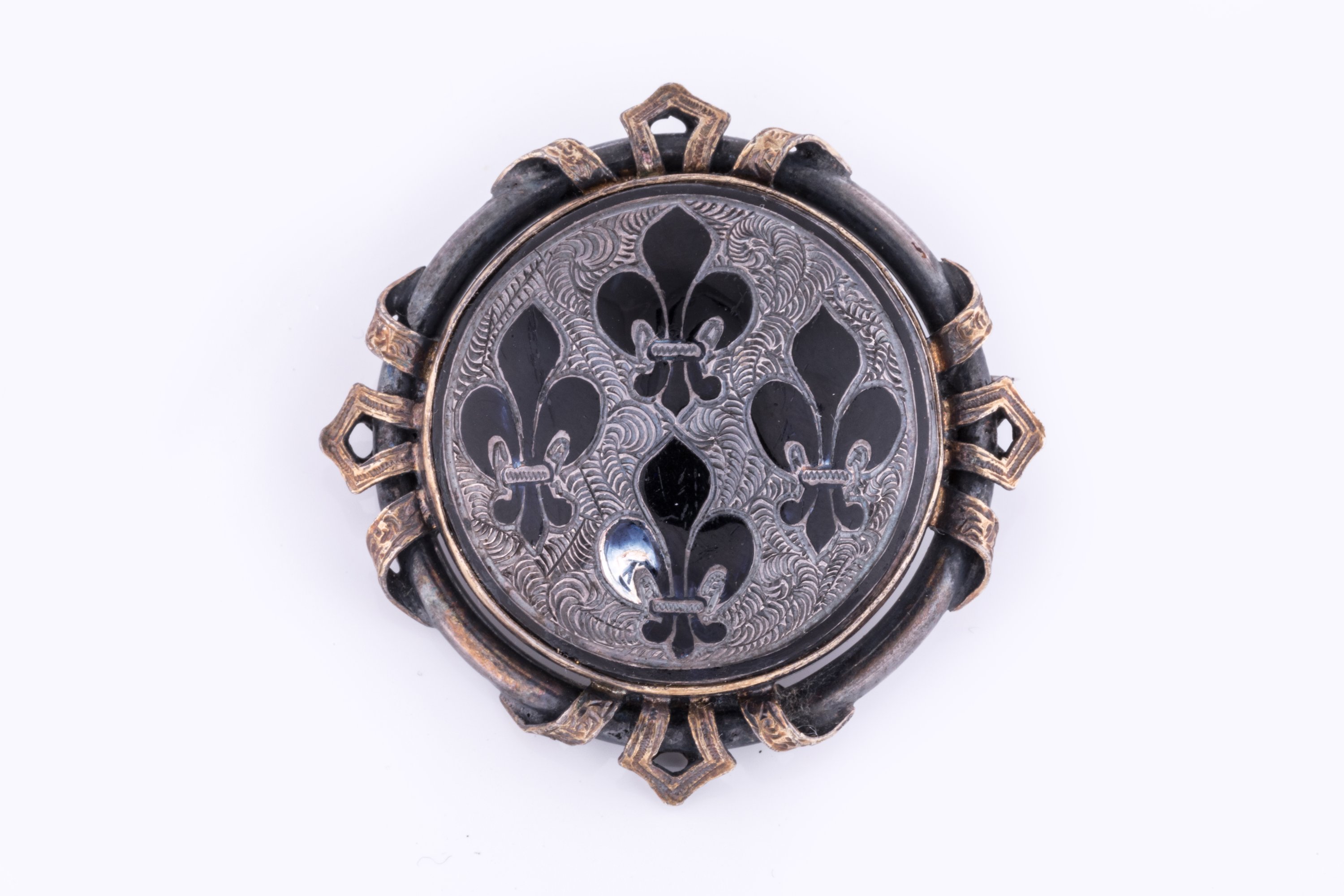 en argent et métal à décor de trois fleurs de lys émaillées noires.