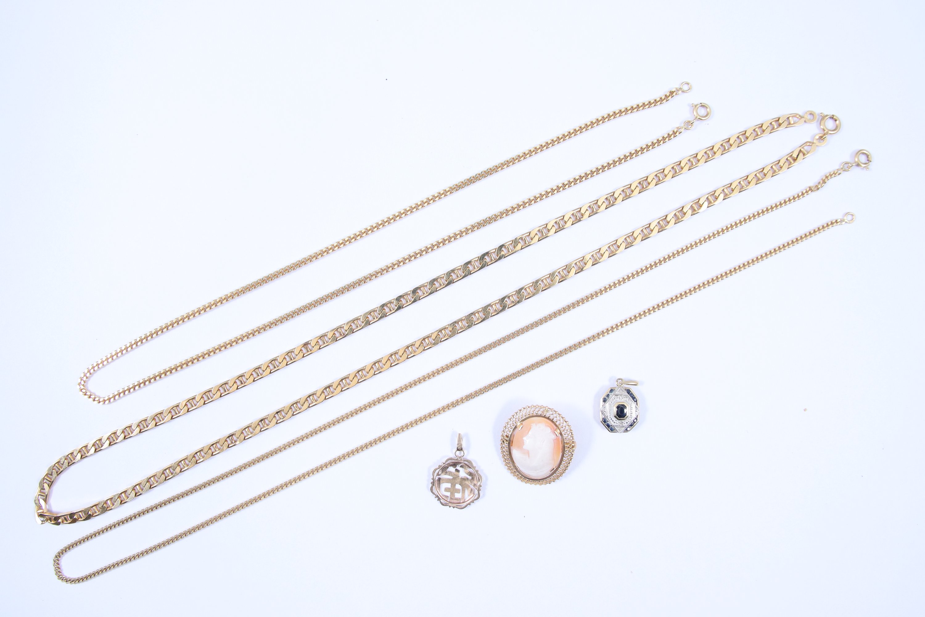 Joint: Pendentif octogonal en or jaune 750 millièmes orné de brillants et de pierres bleuEs (poids brut 2,4 g) et un Cammée coquille en or jaune 750 millièmes orn d'un profil fémini (poids brut 3,8 g.).