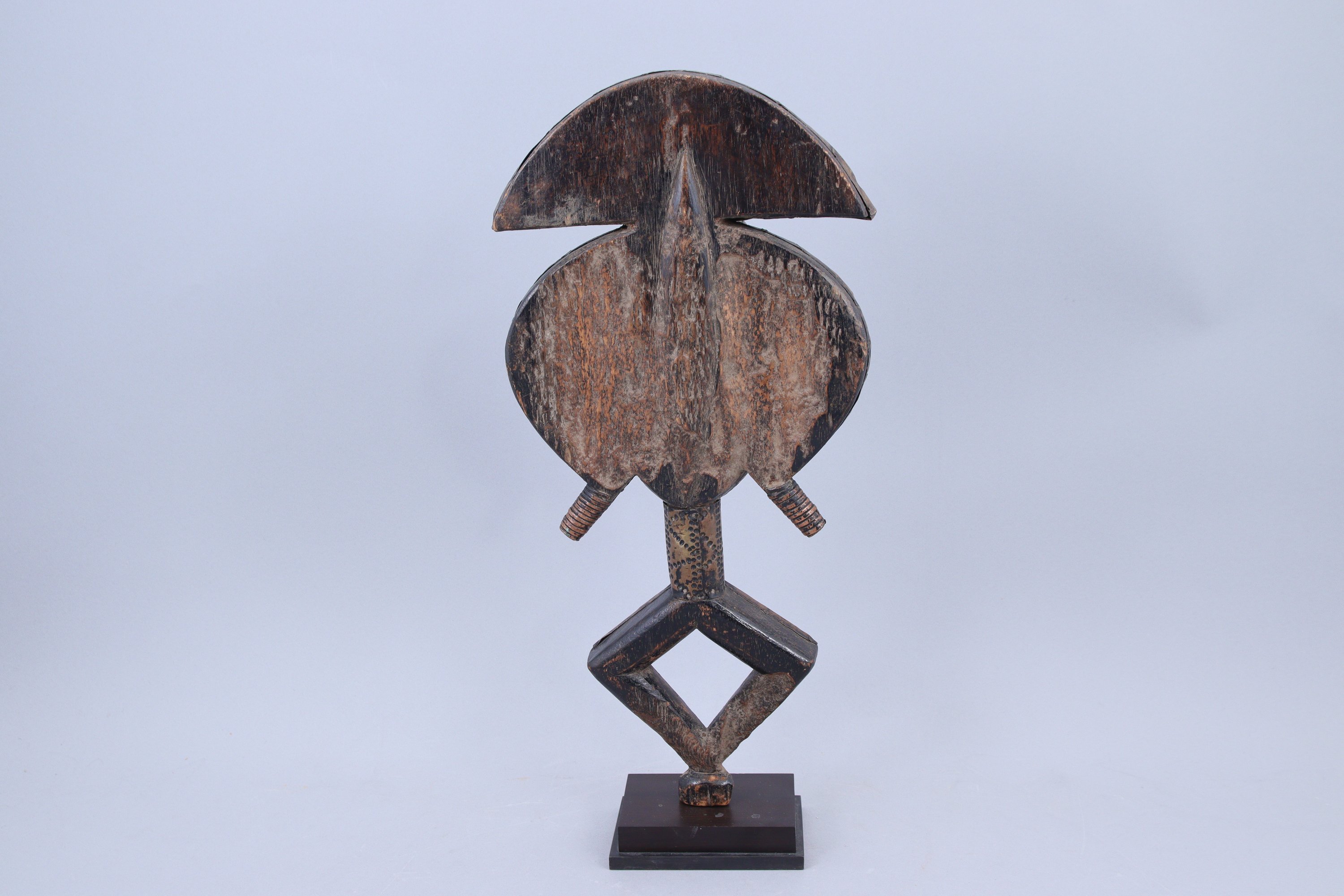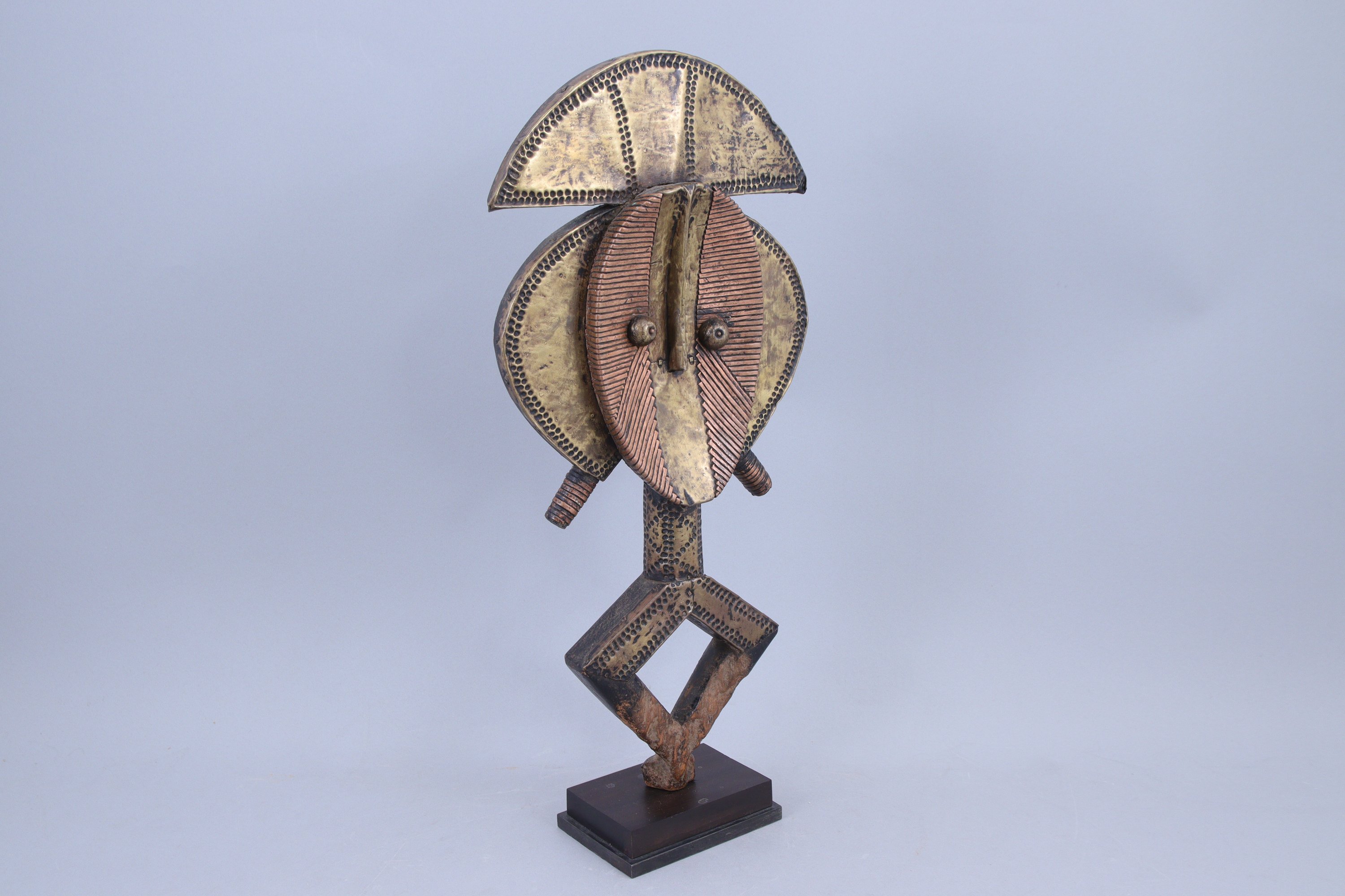 De facture classique, il représente une âme de bois recouverte sur une face de lamelles de cuivre et plaque de laiton agrafées. Bien que de production tardive, cette figure gardienne des reliques ancestrales répond aux exigences du corpus traditionnel existant. Le bois de la base est érodé et la poignée présente une patine de préhension.
