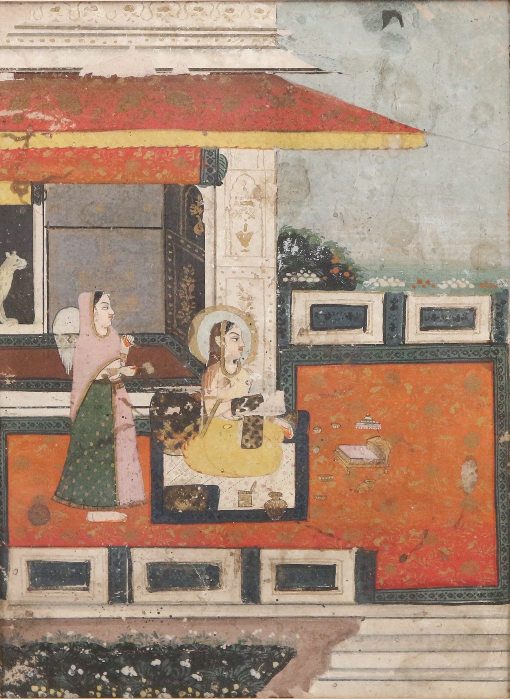 Joint: Inde de l'ouest, Rajasthan, Jaipur, fin XIXe siècle. Danashri Ragini, Illustration d'un Ragamala. Une jeune femme assise sur la terrasse d'un pavillon devant un parterre de fleurs dessine le portrait de son amoureux absent, une servante debout derrière elle tenant un éventail, morshal. L'atmosphère évoque la tristesse et exprime la solitude et l'amour insatisfait. En musique, Danashri s'interprète en automne, l'après midi. Haut. 16 Larg. 1 cm . Cadre: Haut. 31 Larg. 6 cm. (miniature collée sur carton, quelques taches brunes et usures de peinture).