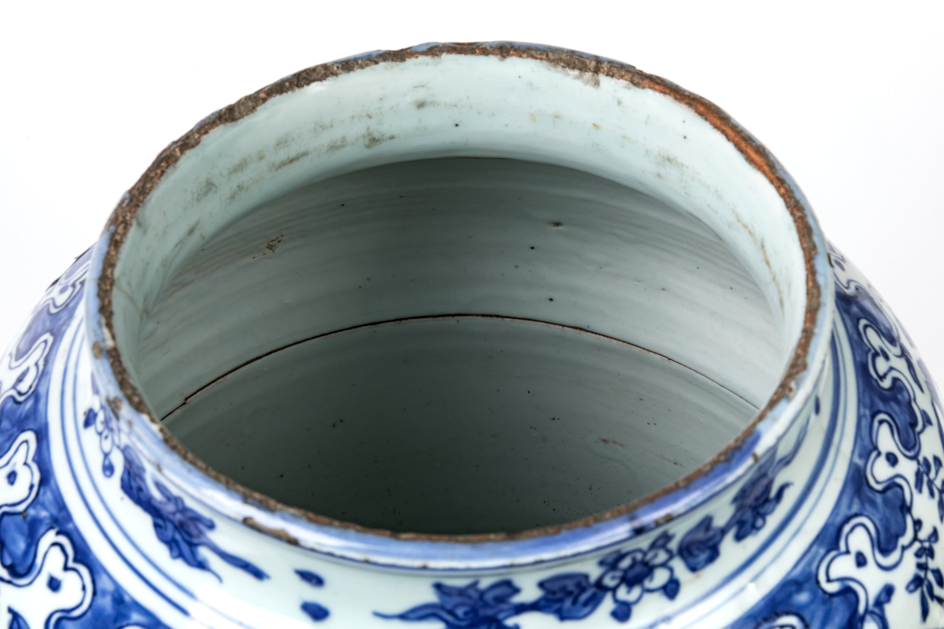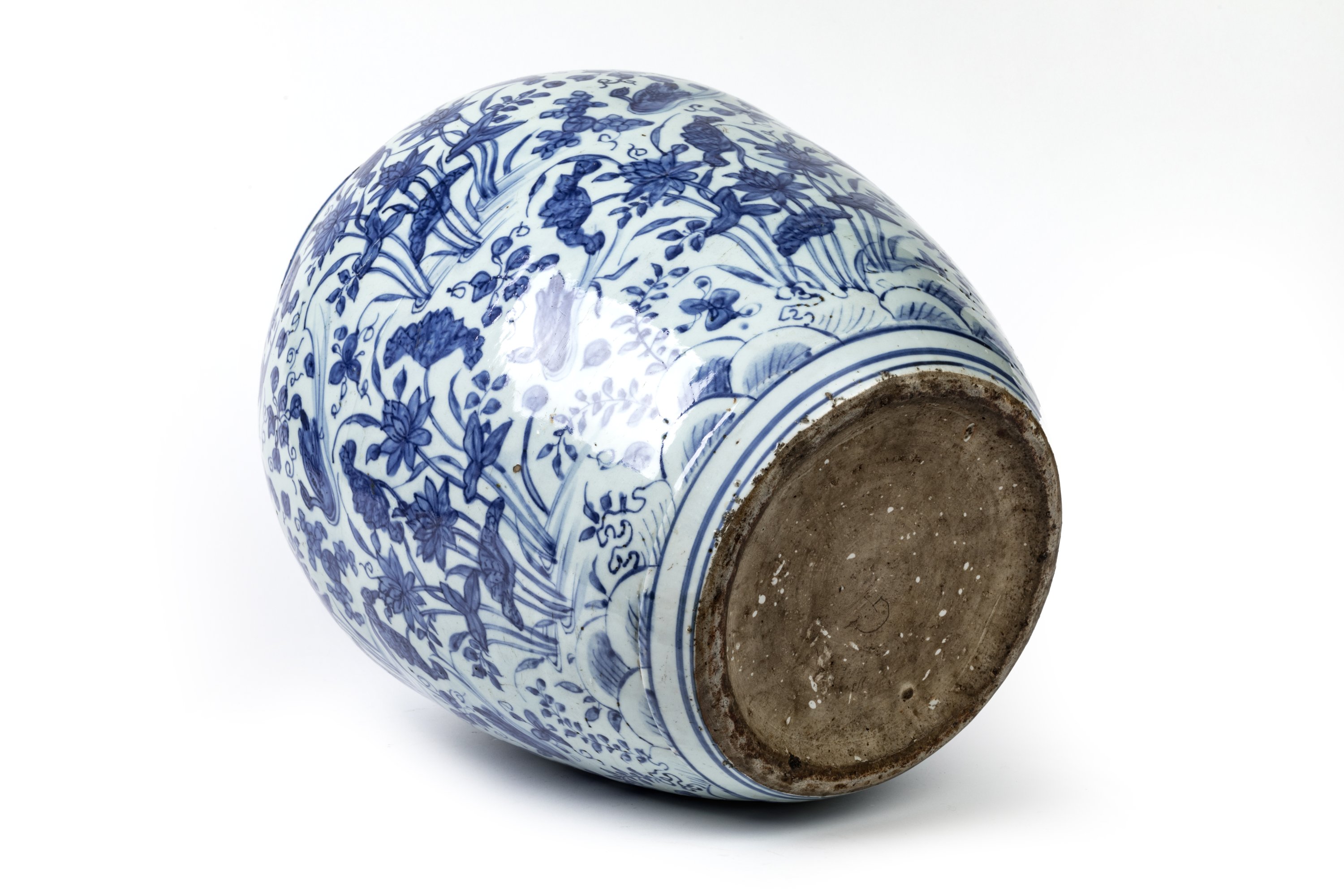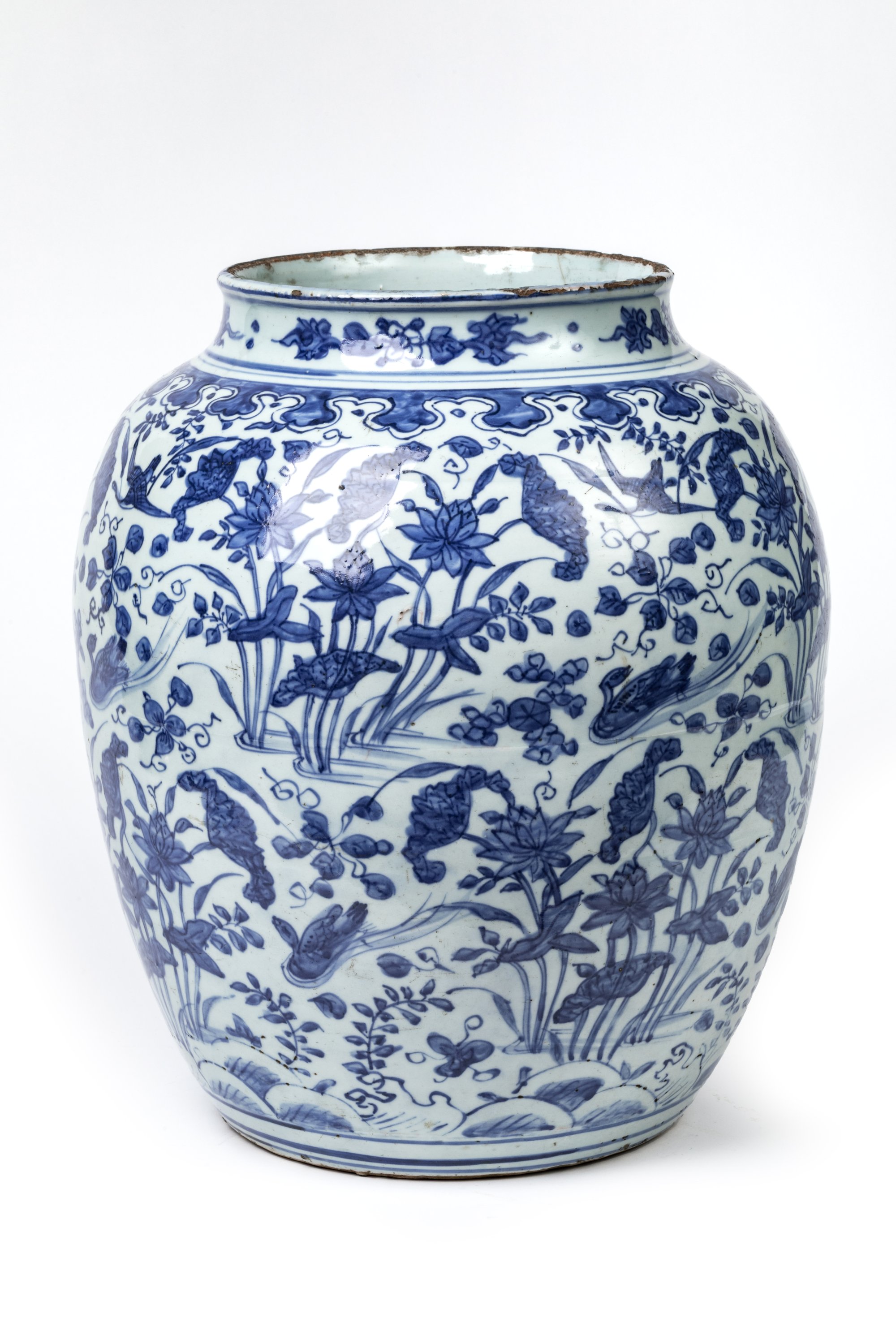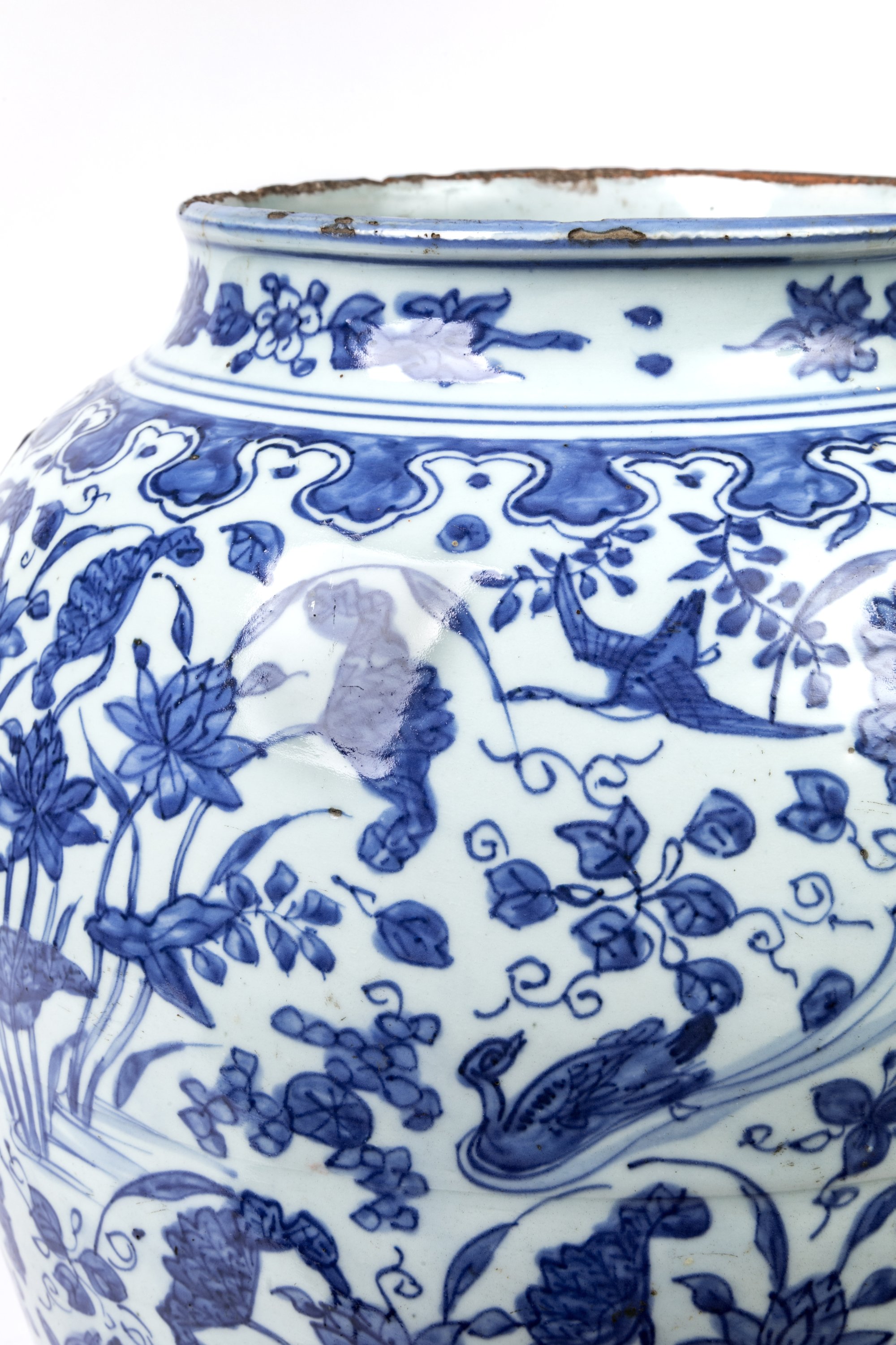 en porcelaine décorée en bleu sous couverte de canards nageant parmi les lotus, des grues les survolant. L'épaulement orné d'une frise de ruyi.