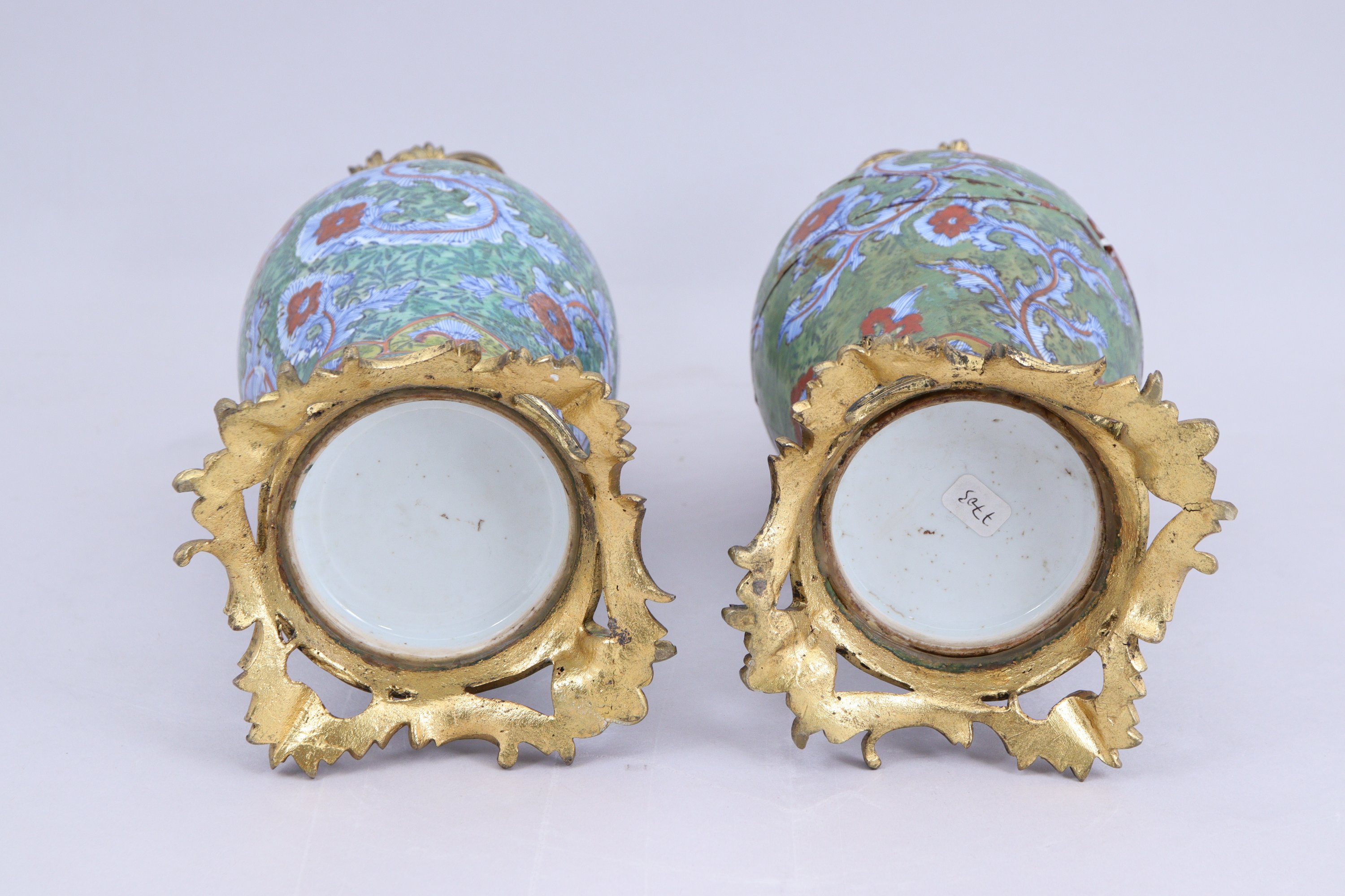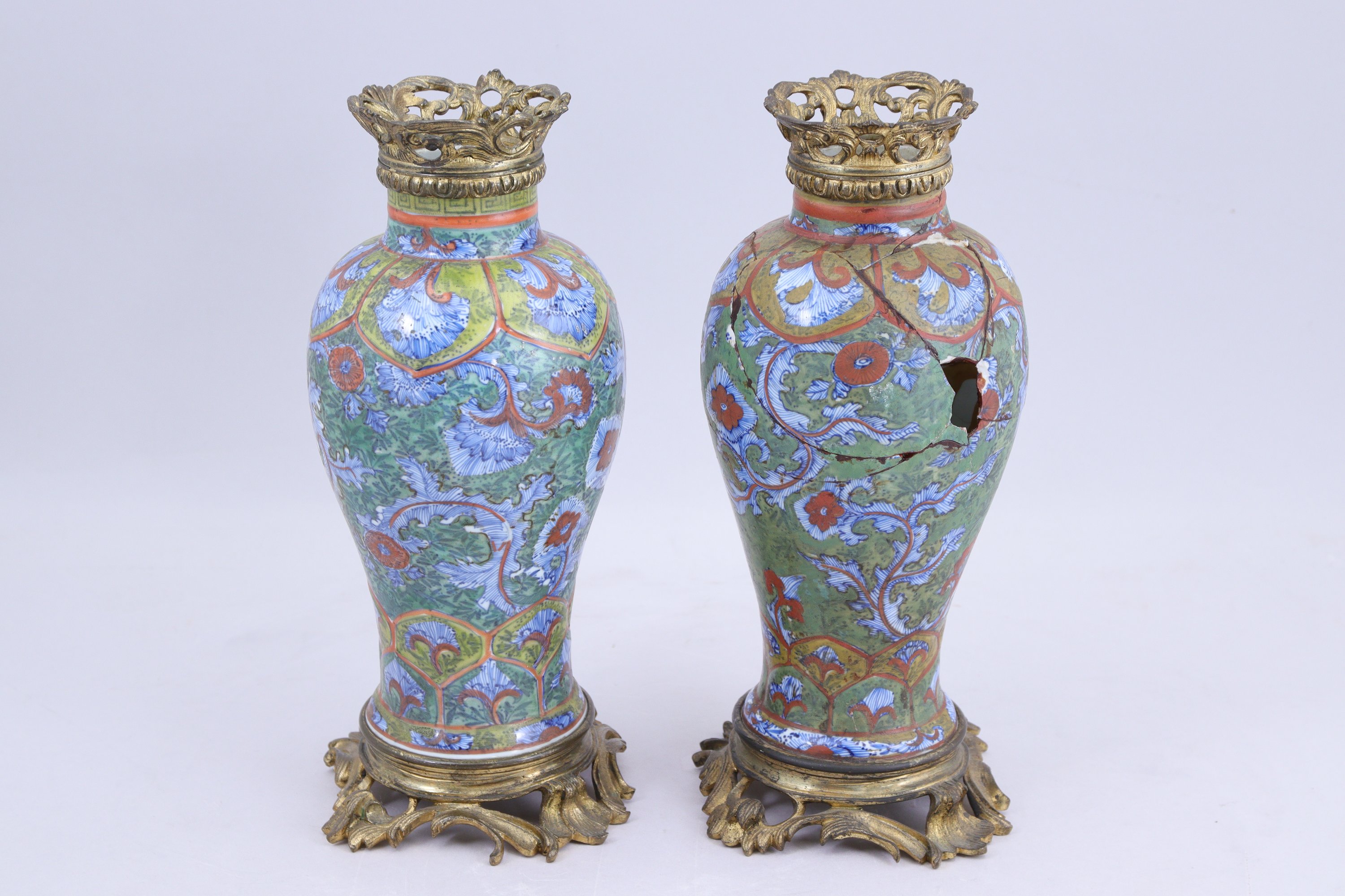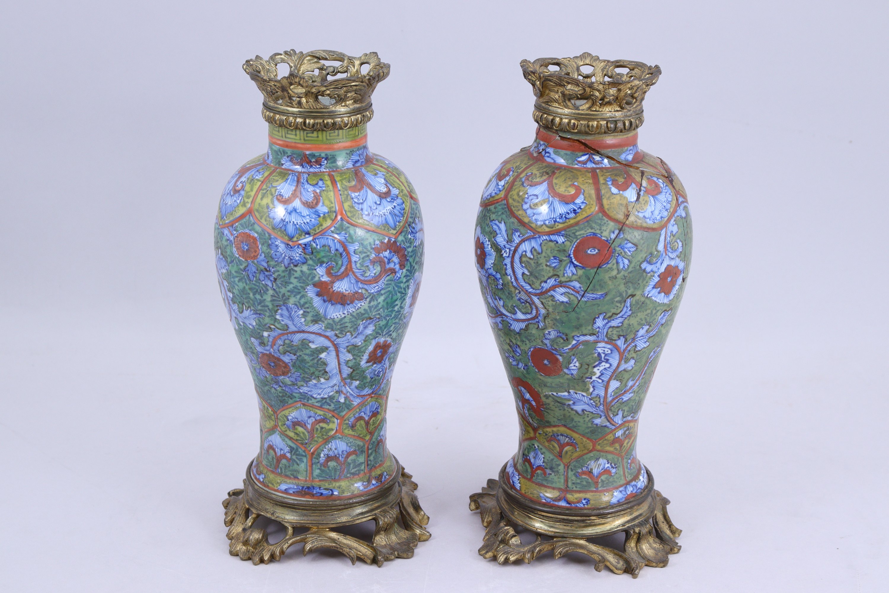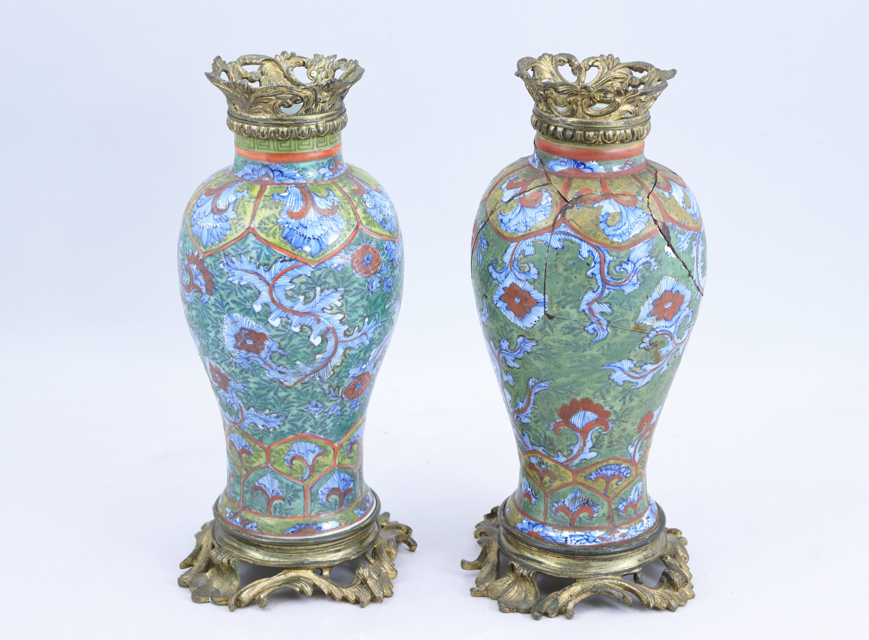 en porcelaine décorée en bleu sous couverte et surdécorée postérieurement en Europe de fleurs. Montés en bronze.